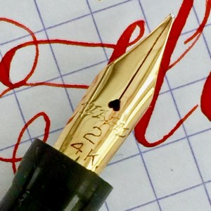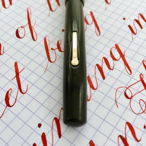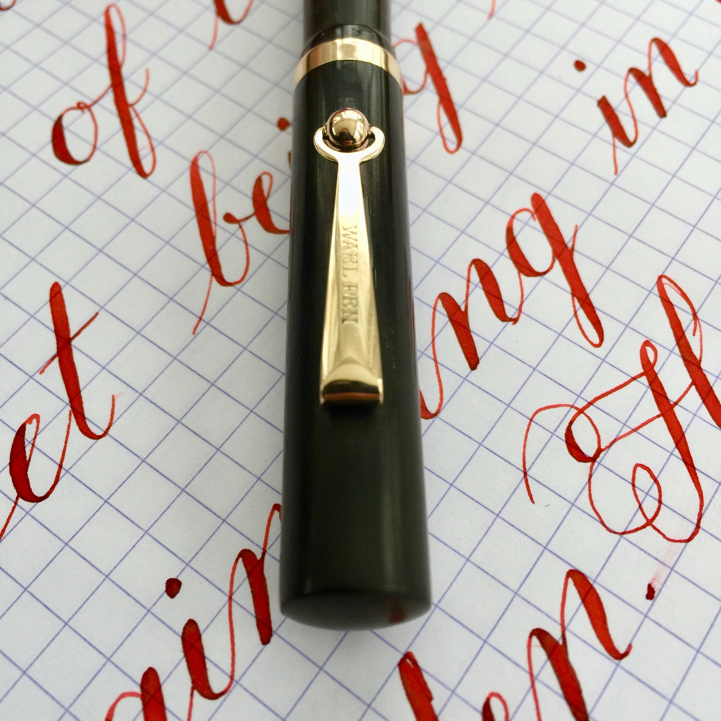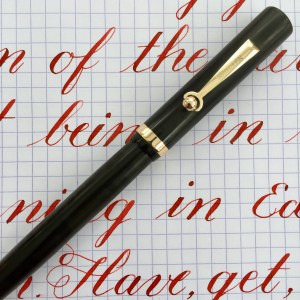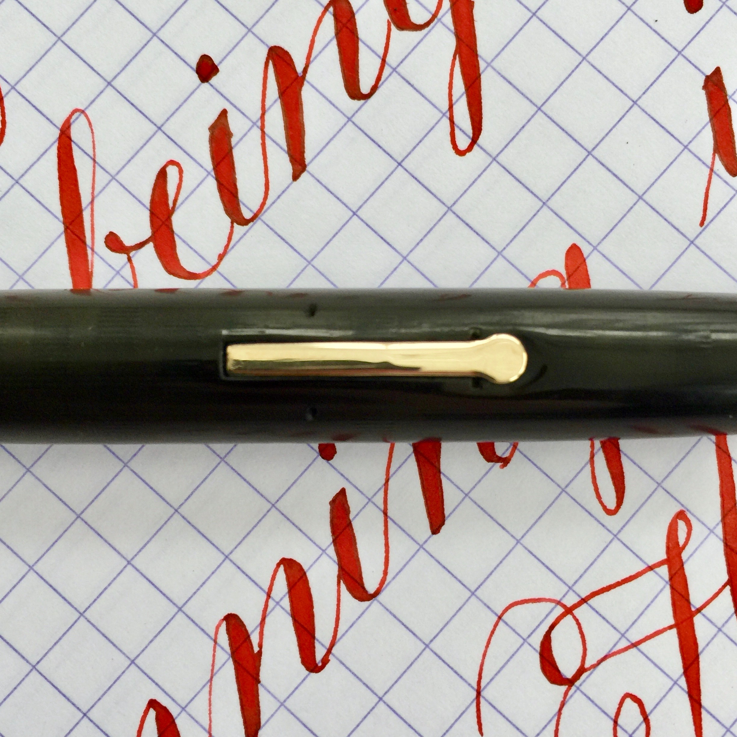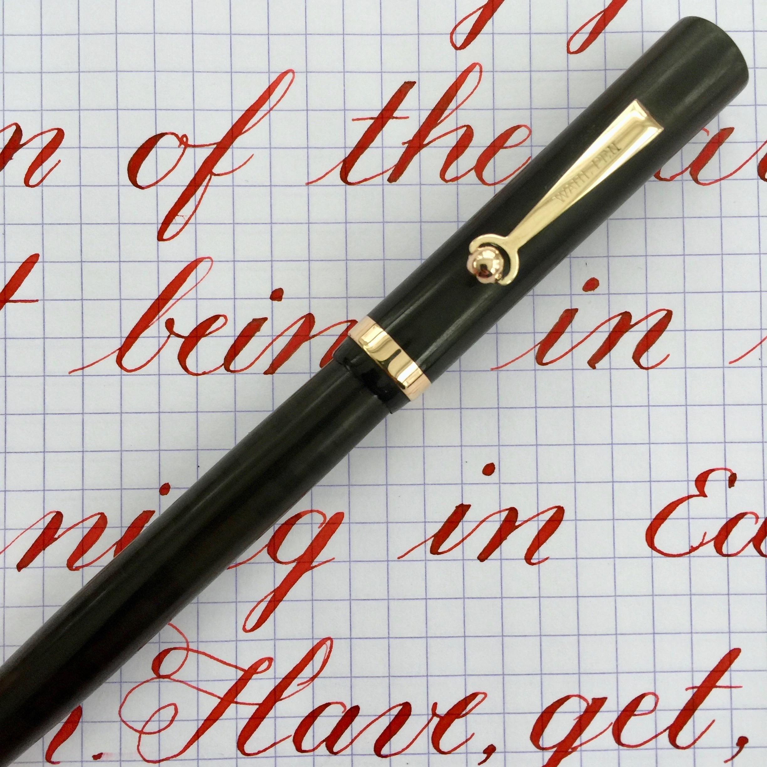 This is a 100 year old Wahl Flat Top in black hard rubber. The black hard rubber has faded to a dark, blackish brown. The Greco style chasing on the body has faded but is still visible. Just a little bit of texture left to it. The pinstripe chasing on the cap (which was originally pretty faint anyway, is almost all gone). The gold filled trim is in excellent condition with no brassing at all. This pen was definitely well cared for. This Wahl also has a gem of nib. The 14kt. Wahl #2 is a very lovely XF (0.3mm) with great flow. Writes quite smooth for an XF. Flex is fantastic with a huge range going up to BBB+ (1.8mm). The responsiveness is very, very snappy. I almost rated this a “wet noodle” due to the quality of the responsive nib, but I couldn’t quite go there because it is just a bit too firm. Still almost anyone would call this a “super flex” or “full flex” pen.