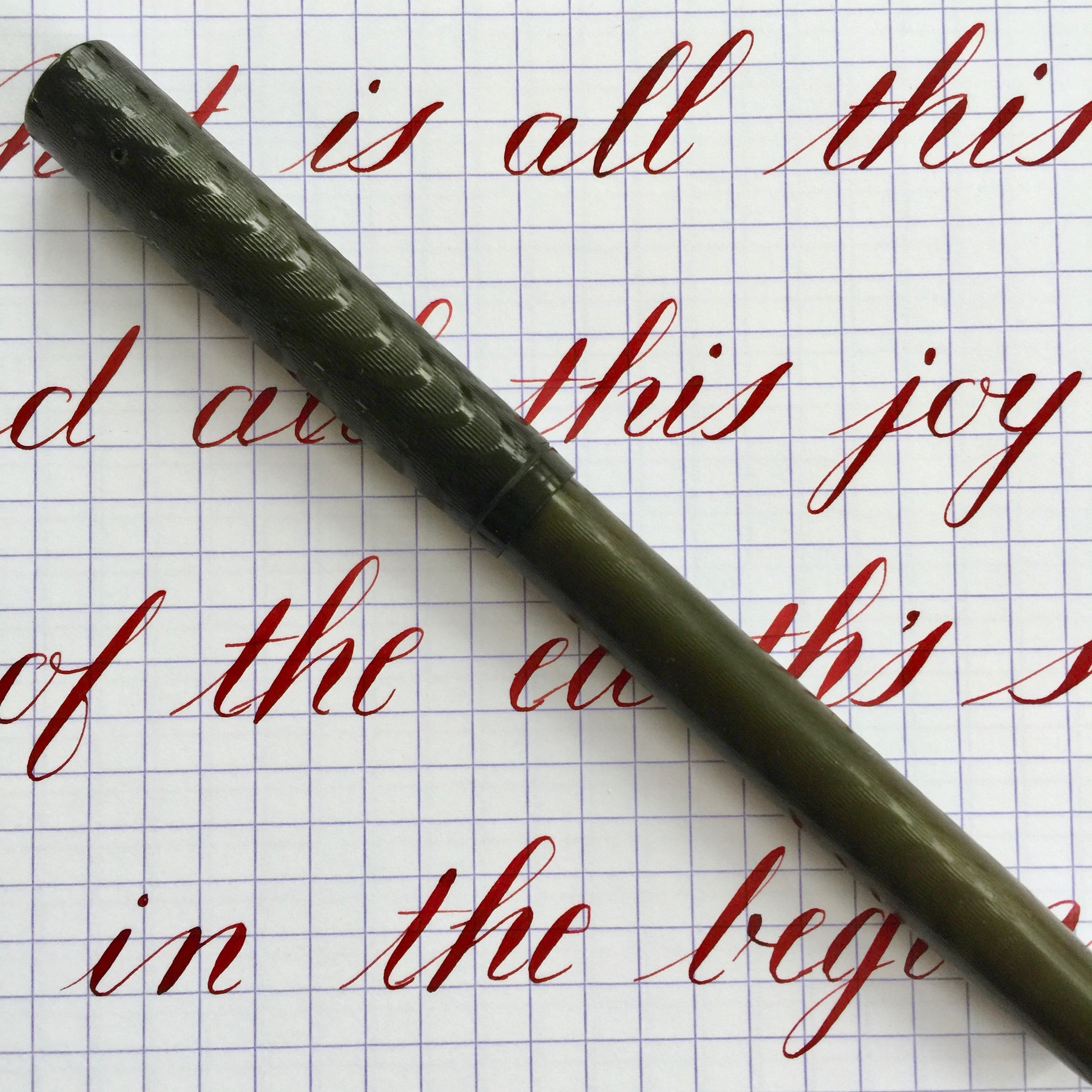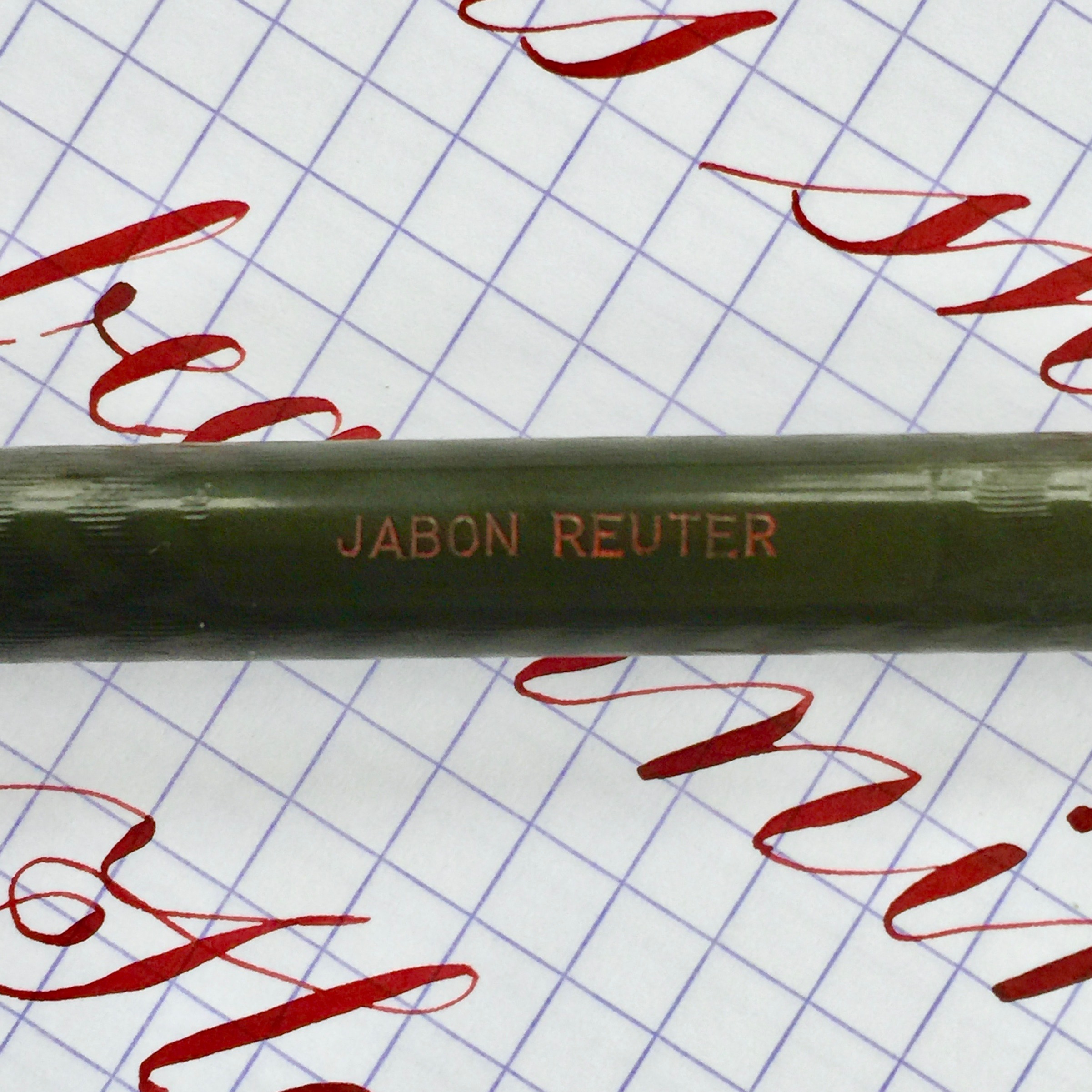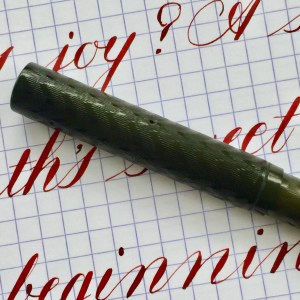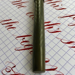 Outside of the big names, many smaller companies made fine vintage pens. This BCHR eyedropper, which is a near replica of a Waterman 12, is a fine example of such a pen. There is no brand on the pen, but it did have an Aikin Lambert nib. The black chased hard rubber on this pen has faded to a dark blackish gray brown. The chasing on the cap is near perfect. It has faded some on the body from use, but is still in pretty good condition .The name “Jason Reuter” is engraved on the side of the barrel. The 14kt. #2 Aikin Lambert nib is a beauty. It’s a XXF flex nib. The XXF is pretty wet for how fine it is. It does have a little feedback as you would expect of a XXF (0.2mm) nib. The flex on this comes pretty easy, and though it doesn’t get massive, it is beautiful responsive. XXF flex nibs are in high demand, and rightly so. They make flex nib work easy.