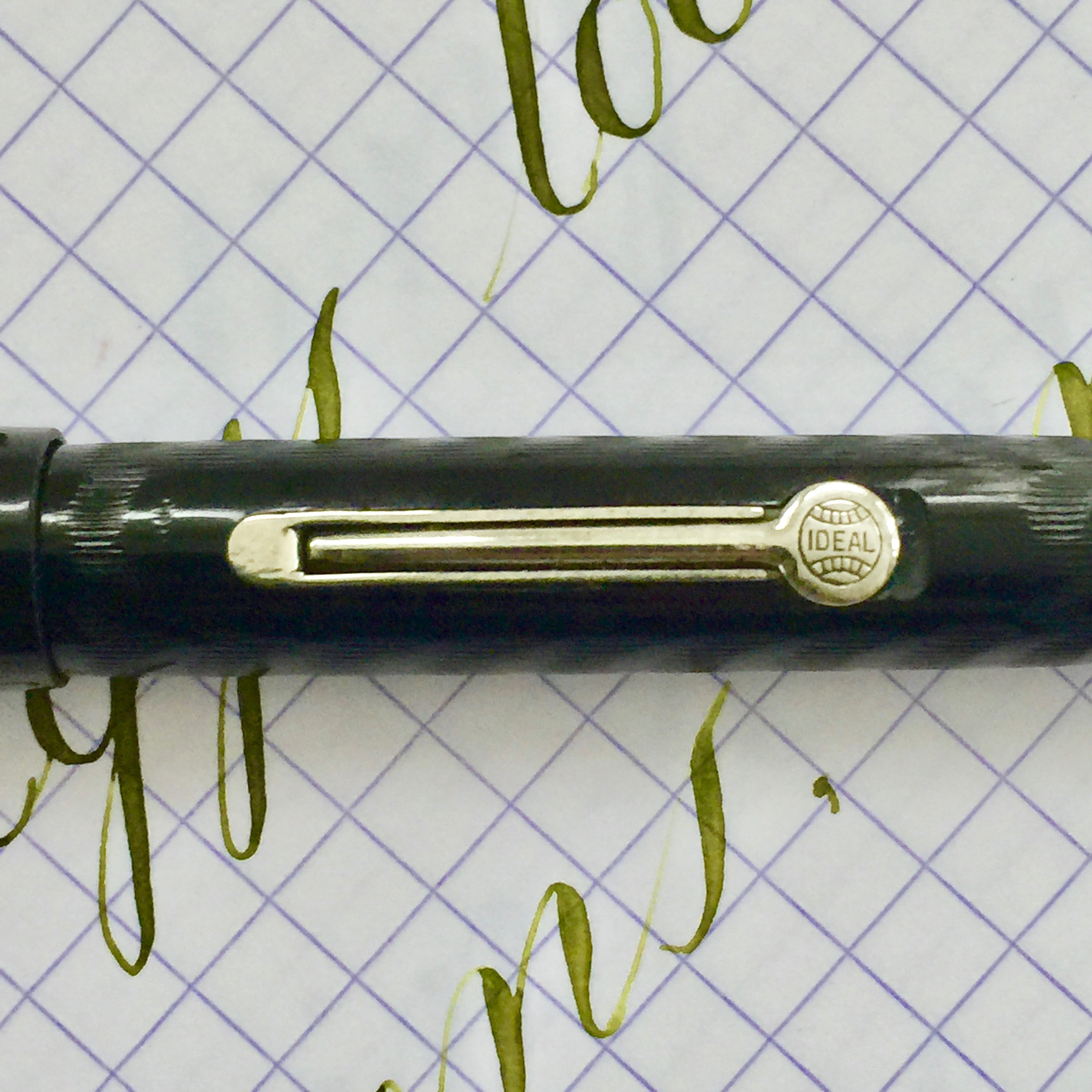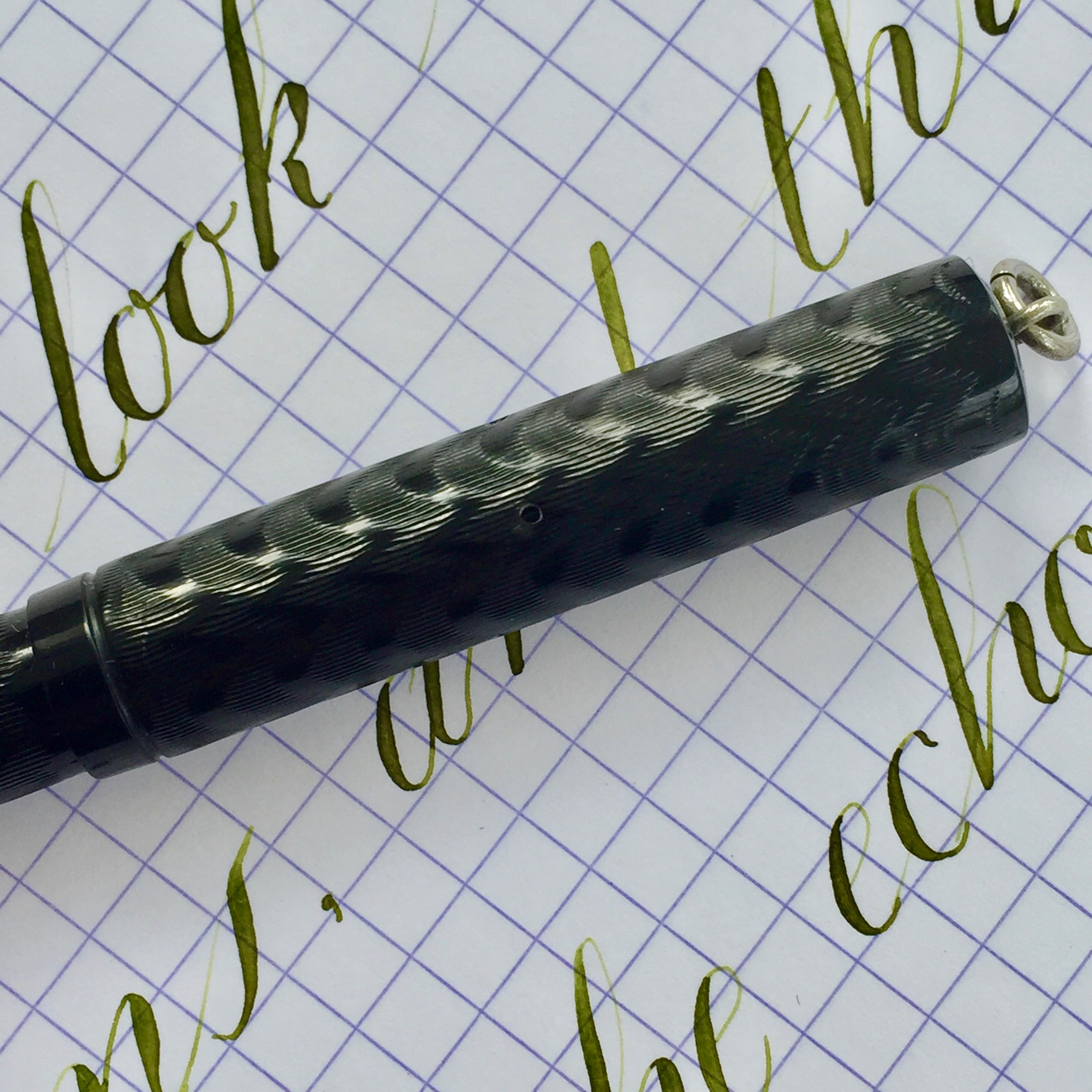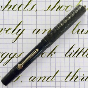 Here is a Waterman 52 1/2 V in about as good of condition as you can find them. This pen looks brand new with basically no signs of use. The black hard rubber is just that. Jet black and still with its original shine. The chasing is crisp and vivid with no texture loss. The imprints look as good new. The nickel filled trim also looks good. It’s in pristine condition. The 14kt. Waterman #2 nib is a beauty. It’s a a needlepoint XXF (0.25mm). For how fine it is, it writes pretty smooth with just a little feedback. The flex isn’t huge ranging up to BB (1.5mm), but it does’t need to be. The nib snaps back beautifully creating a very responsive action on the nib. It’s a great nib for artists and calligraphers. This pen combines two rare things: a near perfect black chased hard rubber vintage Waterman AND an XXF responsive nib.
