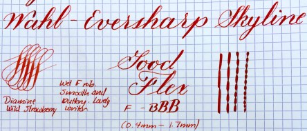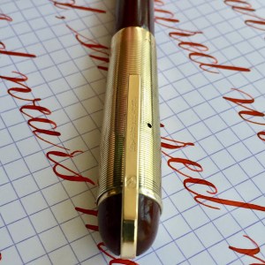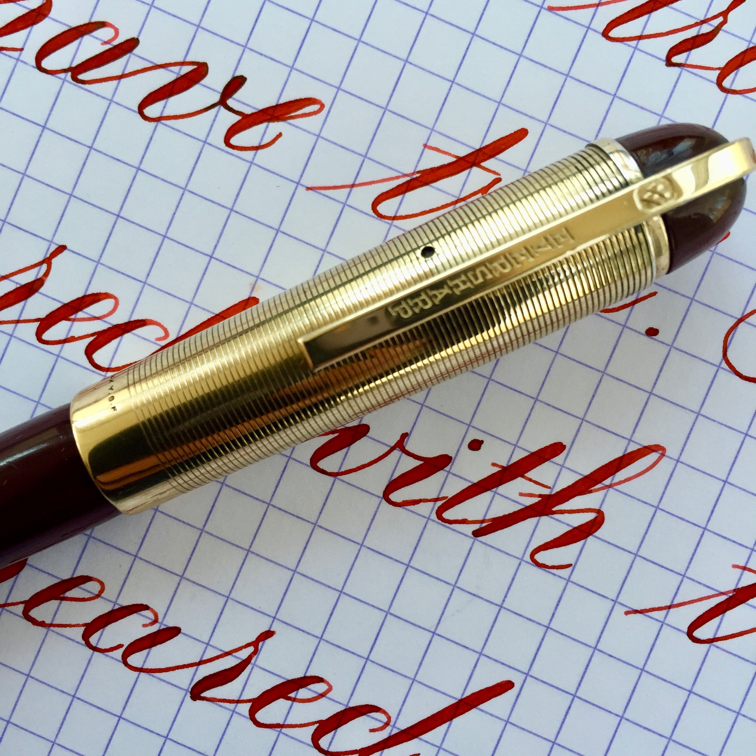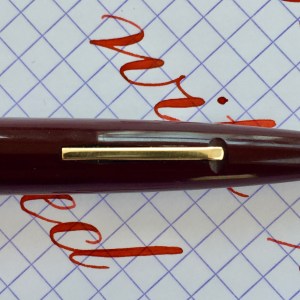 This is a standard size Wahl-Eversharp Skyline in burgundy body and gold-filled cap. The body of this pen is in nice condition with only very light signs of use. The gold-filled trim is in good condition as well as both the lever and clip are completely without plate loss. The cap also has no plate loss, but there are a few dings. Inside Skyline caps is a light, thin ebonite liner that is bonded to the metal exterior. Part of that internal lining is missing, but the cap threads perfectly. The only way you would know this is if you look inside the cap. The 14kt. Eversharp nib is a beautiful writing wet F (0.4mm). Eversharp is known for making some really lovely writings nibs, and this one is no exception. The flex on this nib ranges from F to BBB (0.4mm to 1.7mm). That’s a good range, but the flex is a bit too stiff for me to grade it “super flex.” Still it has some good flex on a great nib.