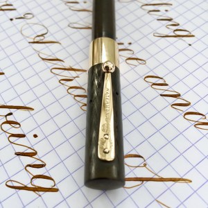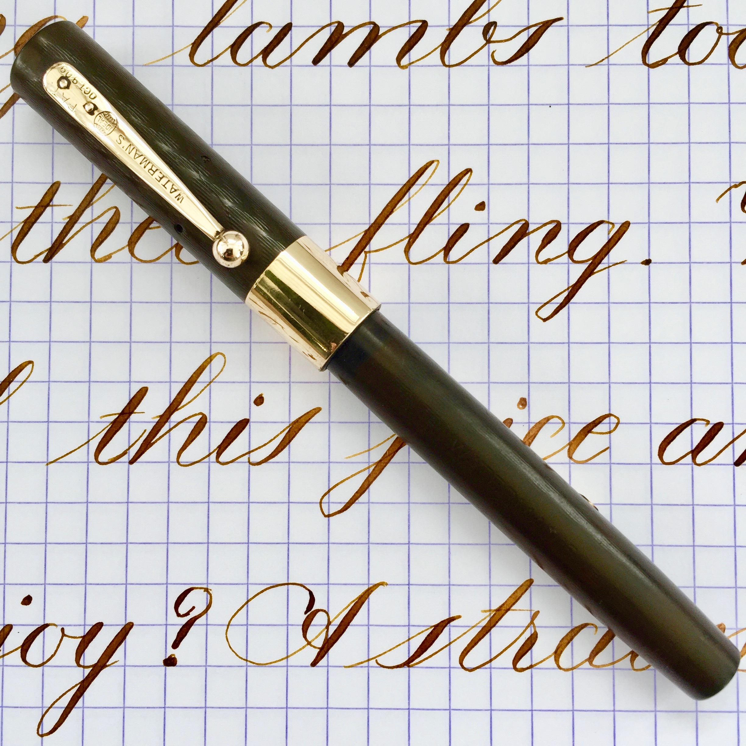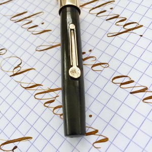 Here is a Waterman 52 1/2 V (Vest pen). This incarnation of the 52 1/2 V does not come with the more typical ring top but with a clip. The BCHR on this pen has faded to a dark blackish brown. The chasing on the body has faded almost smooth though it is still visible. Imprints are also worn but mostly readable. The “52 1/2 V” on the end of the barrel is good and crisp. The lip of the cap that extended below the large cap band has been removed. It’s a clean cut, so I assume that was intentional at some point, but the fade marks on the body indicate that the removal was after some fading had occurred. The gold filled trim is in excellent condition. Both lever and clip look superb with very little if any brassing. The cap band is also with brassing, but it does have some light surface scratching typical of such bands. The 14kt. Waterman #2 is a lovely nib. Normally, it writes a hairline XXF that is pretty smooth for how fine it is. Great for small, precise writing. The nib has a flex range up to BB (1.6mm). The flex isn’t huge. In face, I think it looks best when swells are around 1.2mm-1.3mm, but it doesn’t need to be huge because the nib is so fine and very responsive. Ease of flex is decent. But it’s really the responsiveness and fineness of this nib that makes it a “super flex.”