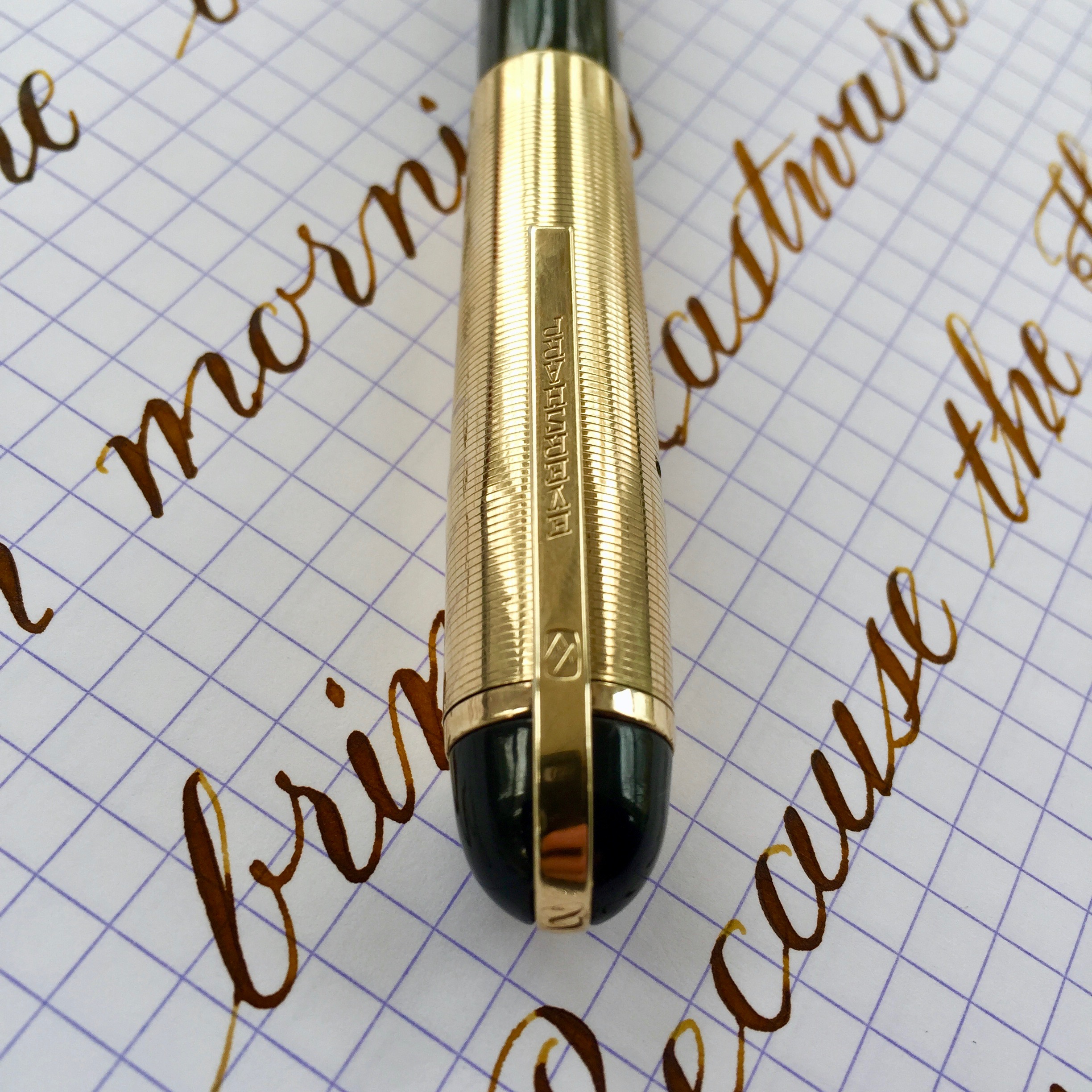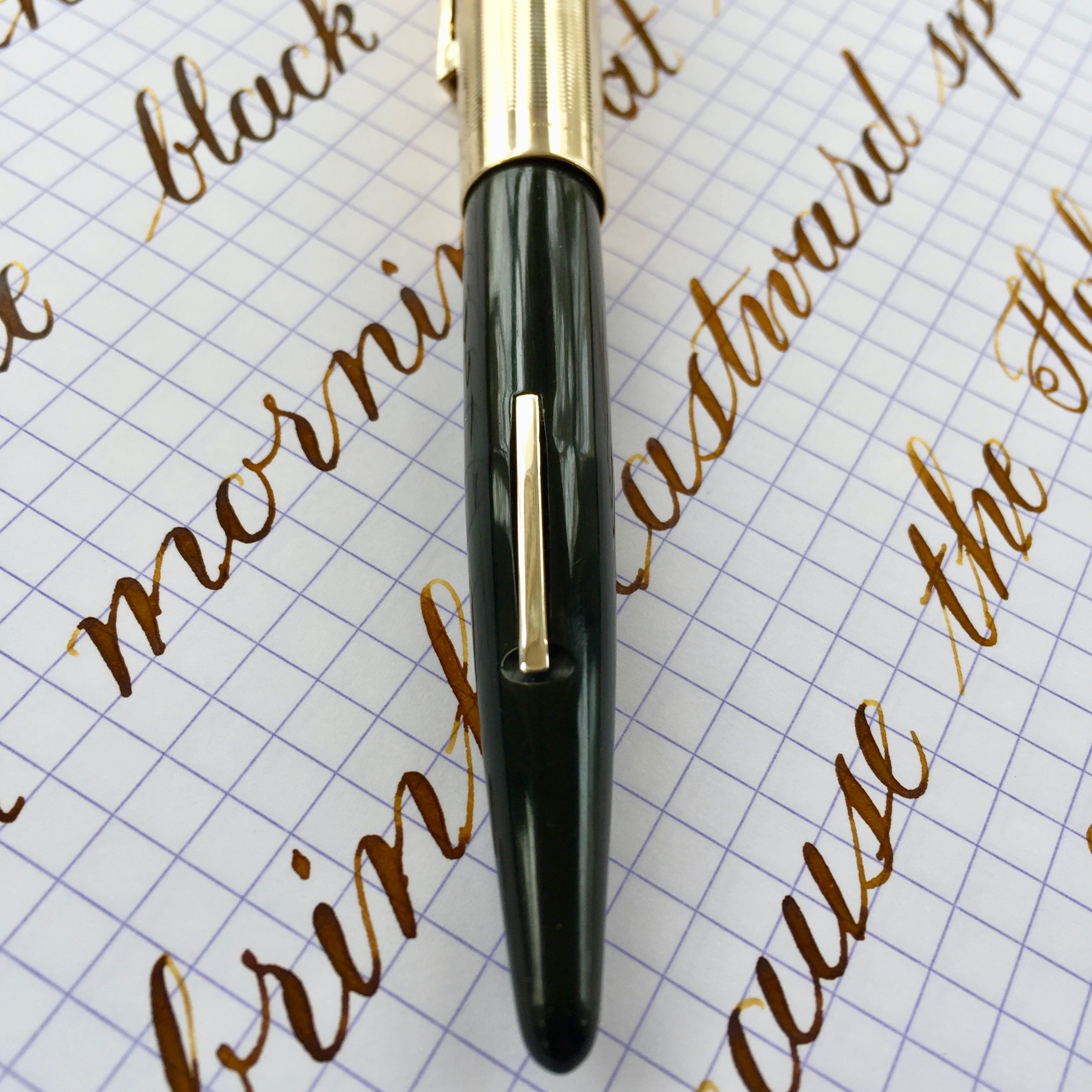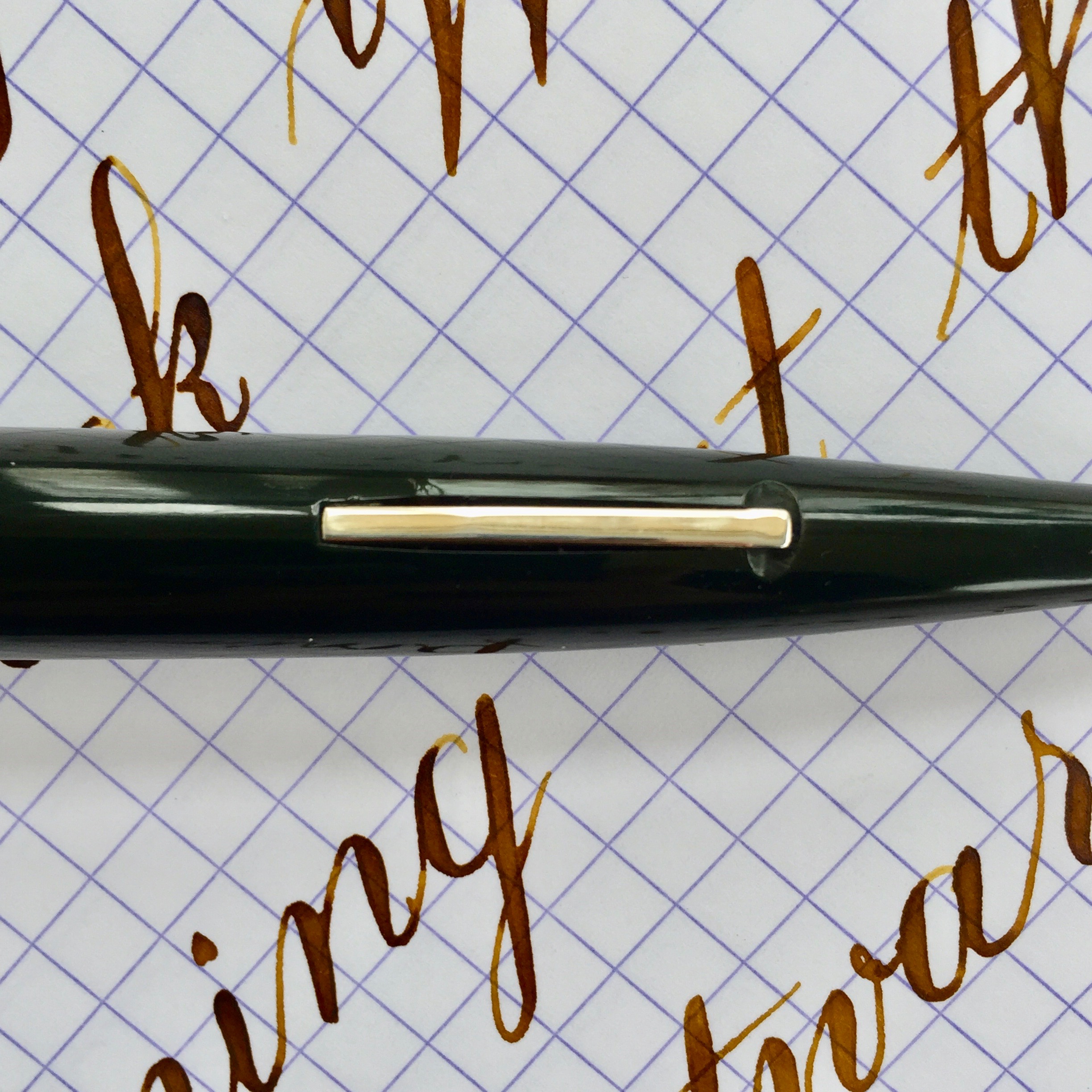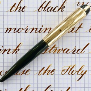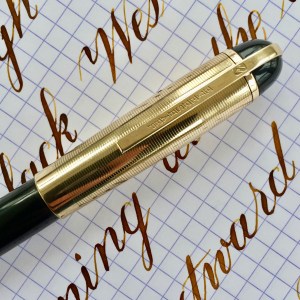 Here is an outstanding Skyline in standard size with green body and gold-filled cap. The condition of this Skylines is superb with very little light scratching on the body. And there is very little in way of blemishes on the cap. There are a couple tiny, tiny, hard to see pin prick dinks in the cap. You can only see them by catching the light just right. There is no brassing on the cap AND no brassing on the lever (which is pretty rare). The 14kt. Eversharp banner nib is a a pure joy to use. It is a soft, wet writing F (0.4mm). Just as a normal writer, this nib shines. But added to that is the fact that it also flexes big (going to BBB+ / 1.9mm) and soft. It also has pretty good responsiveness for a Skyline nib, which tend to be a bit stiff. This is a fantastic Skyline that checks all the “desirable” boxes.