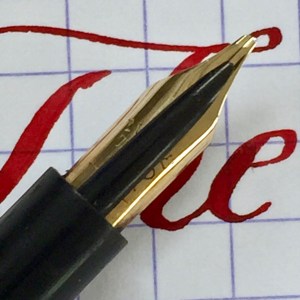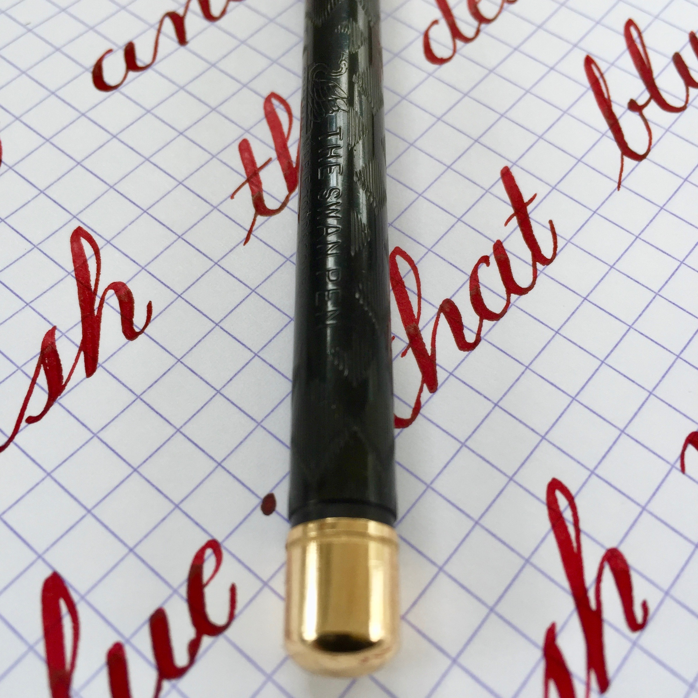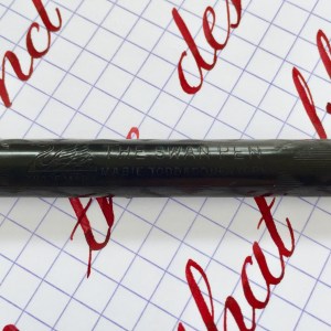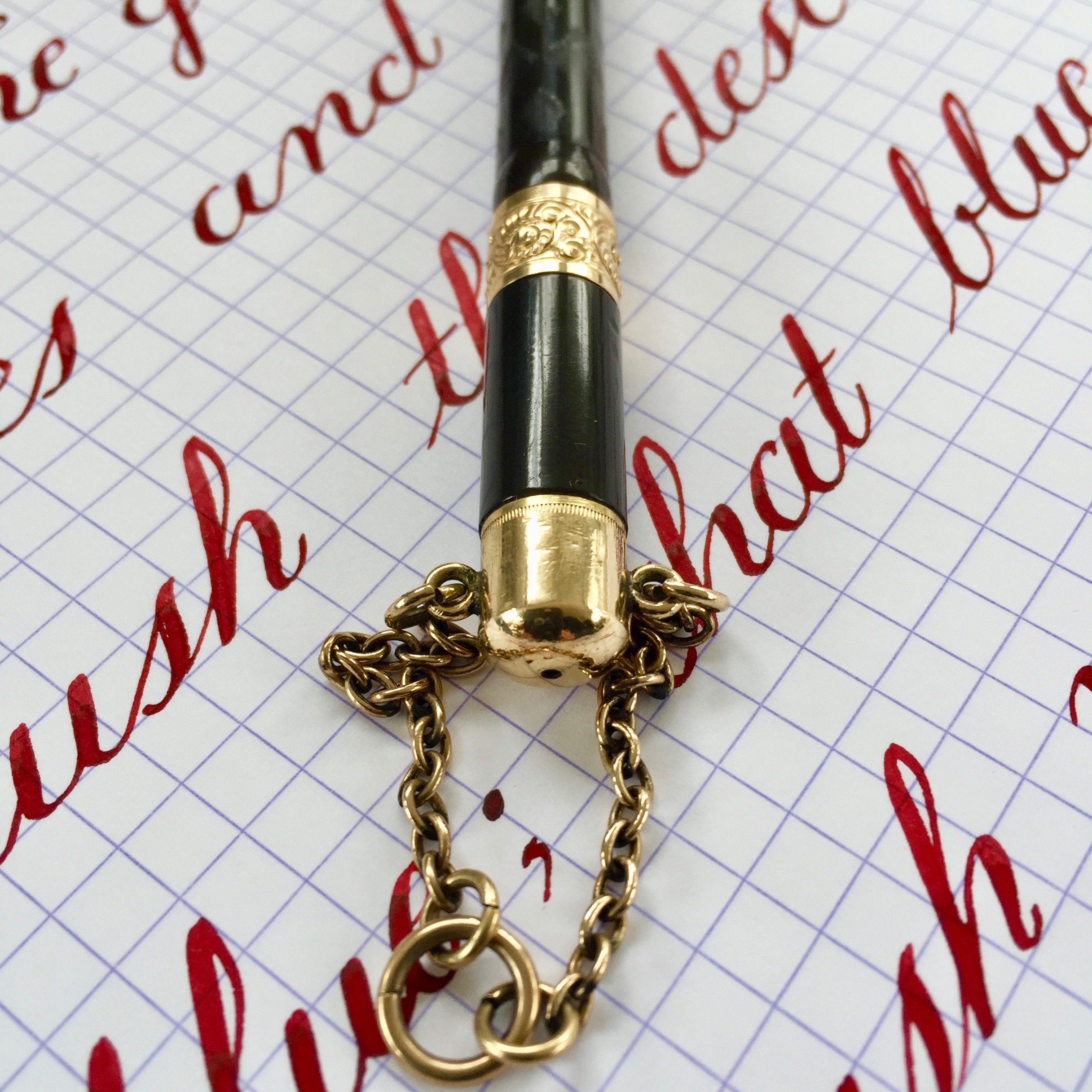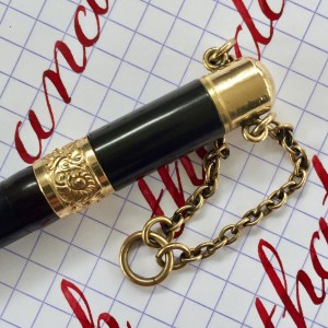 Here is a lovely little made in New York Mabie Todd Swan in Chatelaine style. The BCHR is in good condition. There is some fading to a grayish black, but the chasing and imprints are still very crisp. The gold filled trim is in very nice condition. Some very small dings on the top of the cap but no brassing. The cap fits a bit snug, but that is the way they were supposed to be as it is a slip cap with a chain dangling from it. This Swan comes with a really unique nib. It is a very wet writing oblique stub. It might even be crisp enough to call an italic. It takes a little bit of getting used to, but it is butter smooth when you hit the sweet spot. A phenomenal writing experience. Added to that is a very nice and soft flex going from F (0.5mm) up to BBB (1.8mm). Plus, the oblique italic nib combined with the flex makes for some special abilities when use the two together. It’s a great and very unique vintage flex pen.