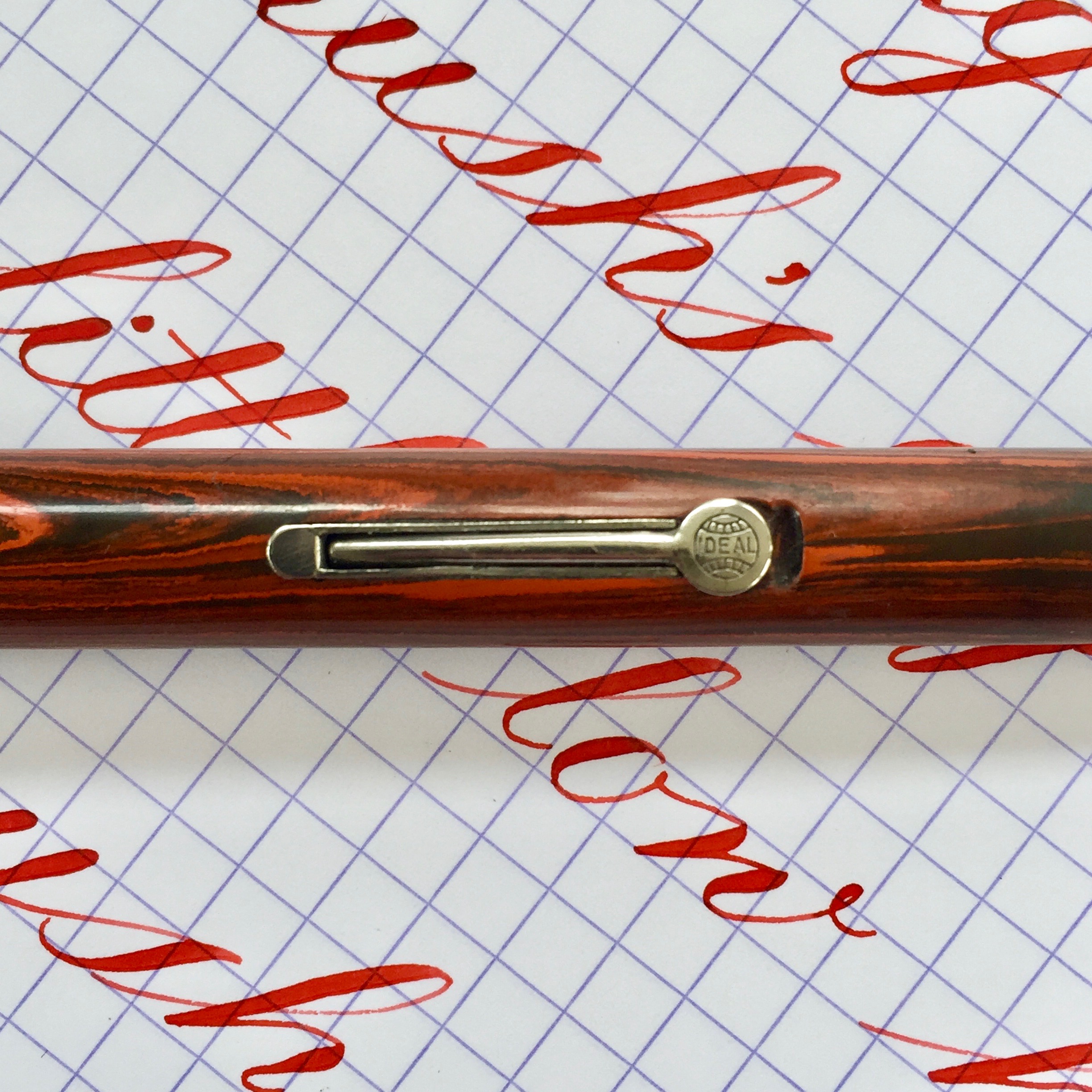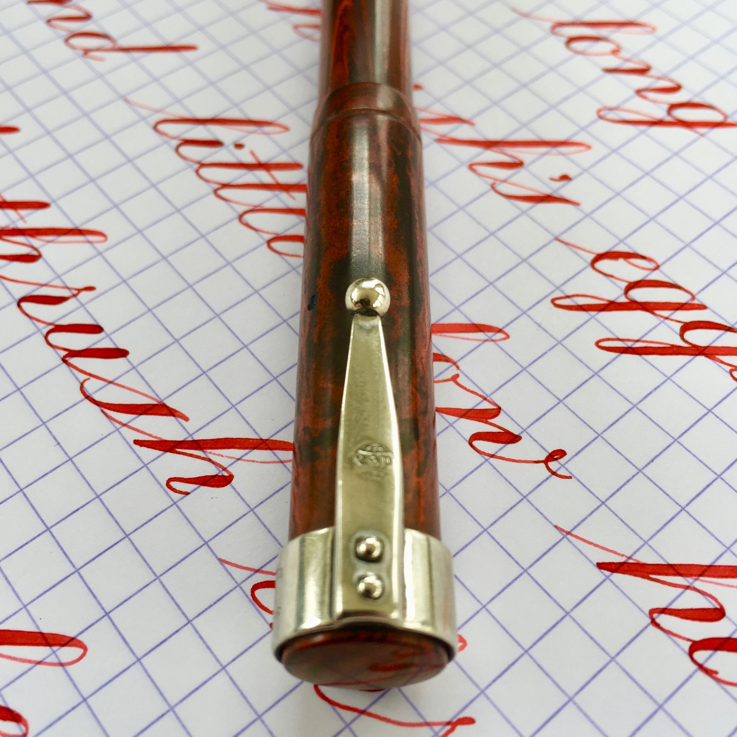 Here is a Waterman 52 in wood grain / red mottled hard rubber (not a red ripple like the sample states. Sorry about that). I believe this 52 is from the European market as US versions do not have nickel trim and almost always have a clip and a band on the cap. This version is equipped with a quality nickel-filled Waterman accommodation clip. The hard rubber is still looking very nice with minimal fading. There is a faint live of fading apparent on the back where the cap was posted. Imprints are worn off, though the “52” is still readable. The accommodation clip is in excellent condition. In addition to the Waterman “Ideal” globe, it has the company “Silvrix” (a French company I believe) etched in the side. The nickel lever is also in very nice condition. The 14kt. Waterman #2 is a fantastic writer. It is soft and very smooth and wet. I could write with it all day long. The flex on this is also very nice. It doesn’t have a huge range going from XF (0.3mm) to BB (1.6mm), but it does have some excellent bounce and responsiveness. This is a much rarer version of the 52 than it’s gold trimmed siblings. Great pen.