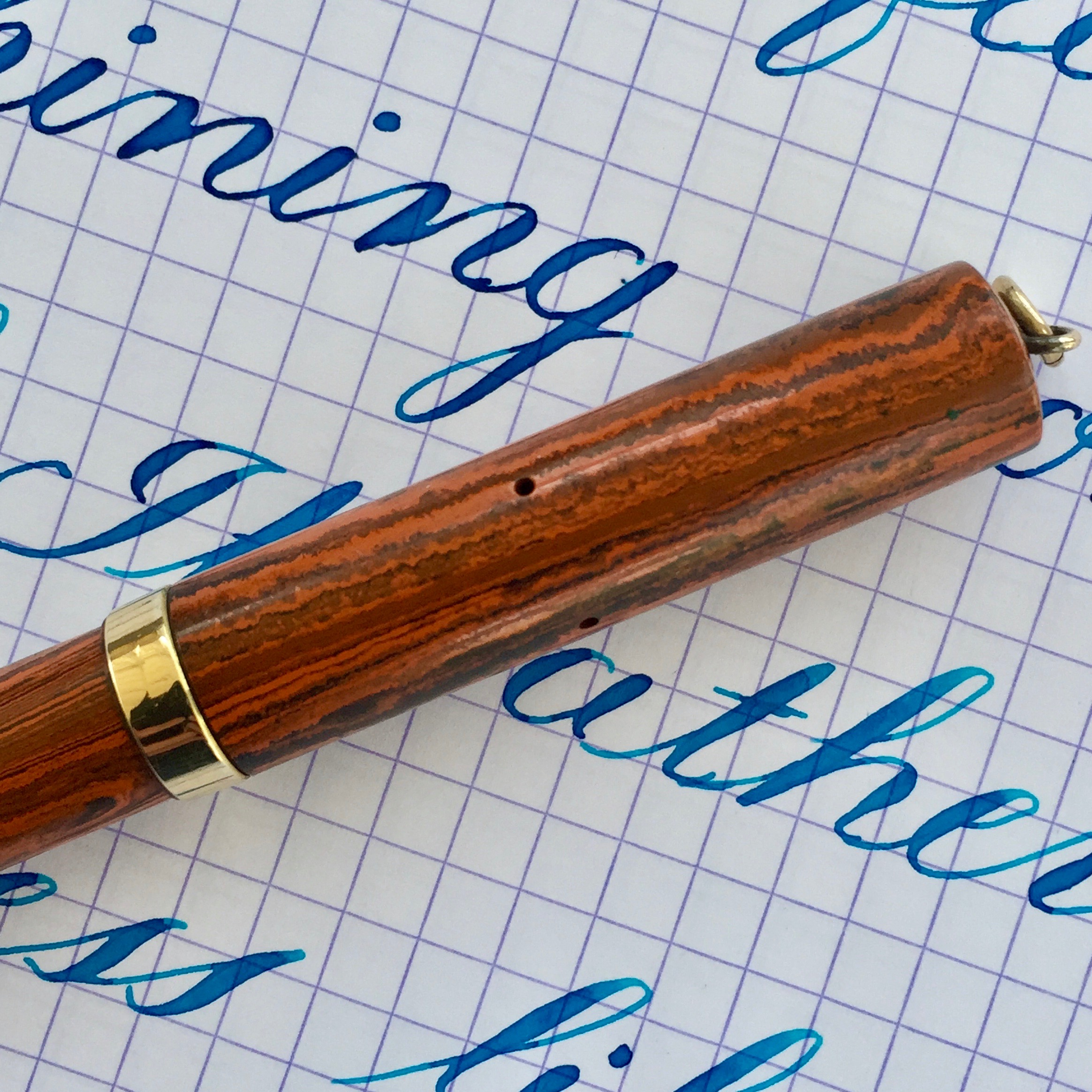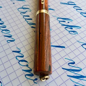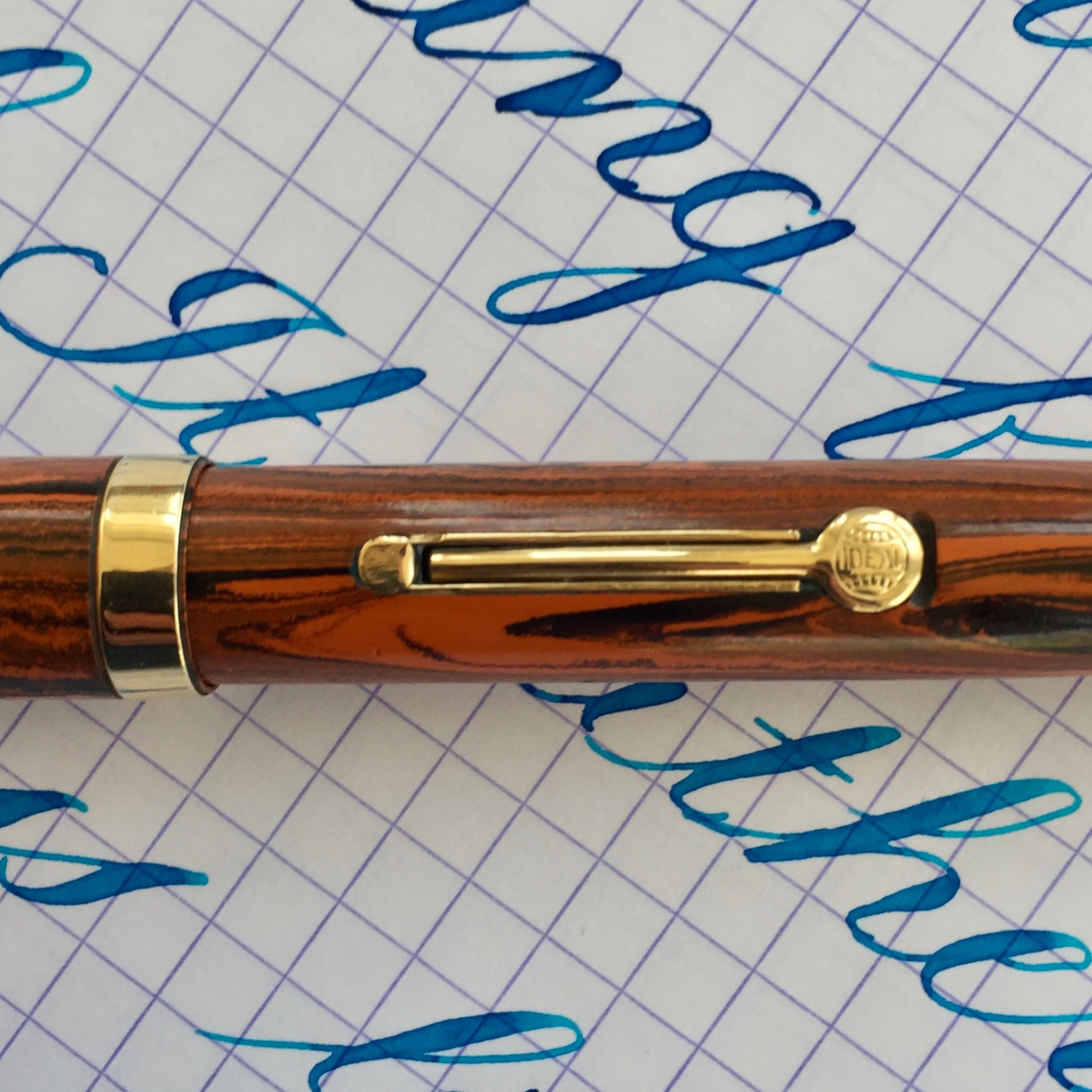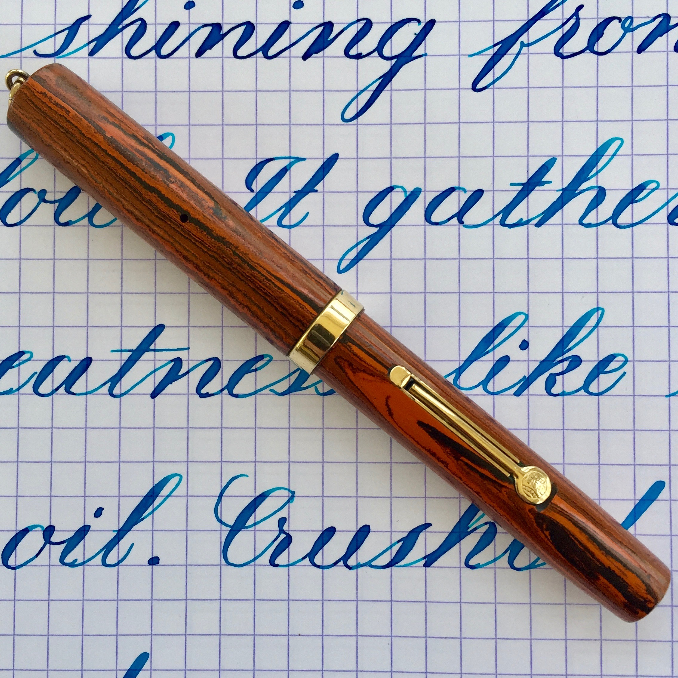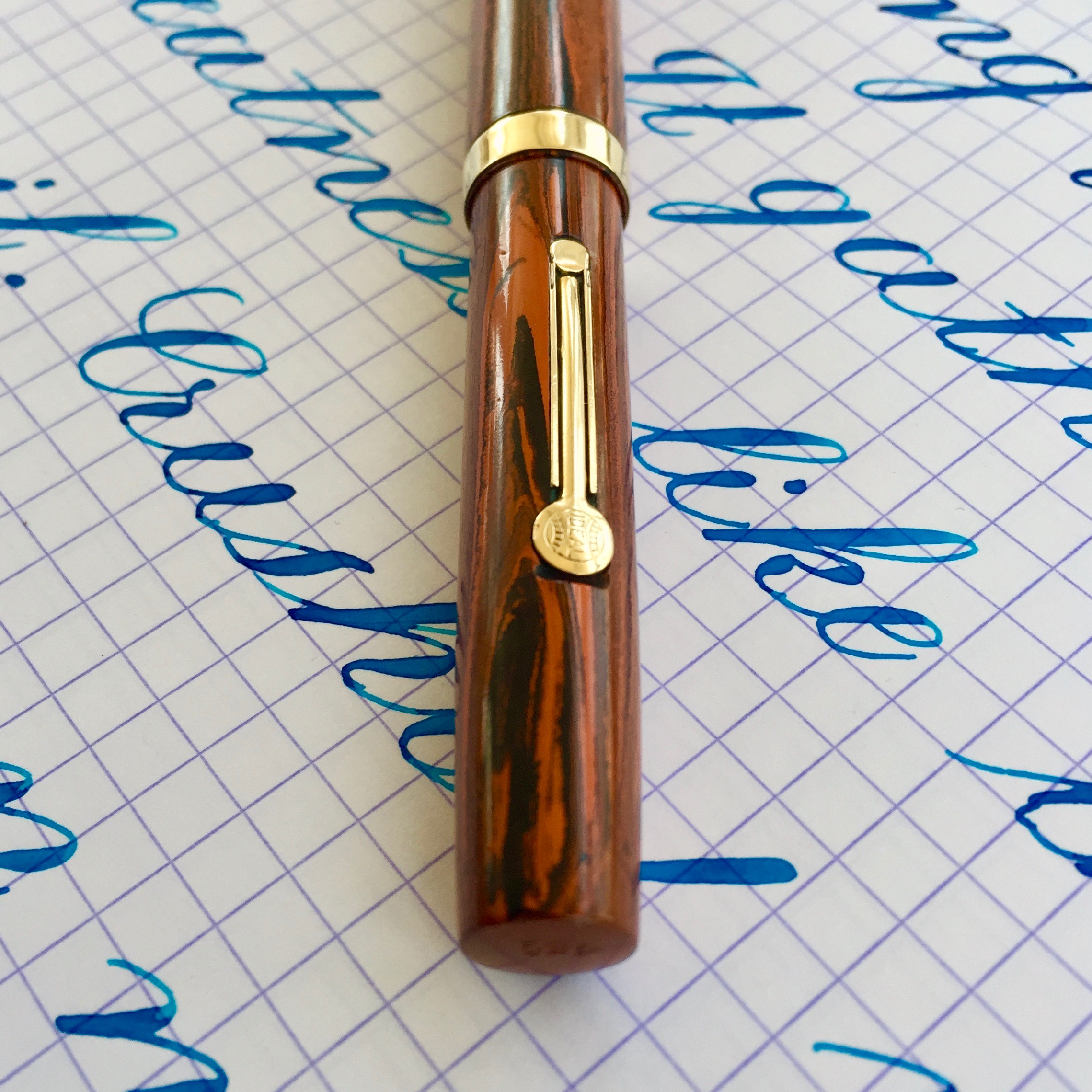 Here is one of my favorite size vintage Waterman pens, the 52V, in wood grain / red mottled hard rubber. The 52V when posted has the feel of a 52 and when capped has the portability of a ring top. And this one is in tremendous shape. The hard rubber has barely any fading. The gold-filled trim is also in great shape. The lever has just the tiniest bit of brassing on the edges of the “globe” section, but you have to look very closely to see it. Side imprint is visible but partially worn and unreadable. The “52V” on the end is still crisp. The 14kt. Waterman #2 is a very wet writing F. It’s smooth and a good writer, but if you don’t like wet writers you won’t prefer this nib. If you do, well then… The nib also has some soft flex. The flex is also very wet and ranges from F to BBB (0.4mm to 1.7mm). If you want to get some monster sheen, this pen will do it. The wetness cuts down on the responsiveness a little bit, but it still has a nice bounce. Overall, this is a great pen, in a great size, in great condition, and with a wonderful, wet, flexy, nib.