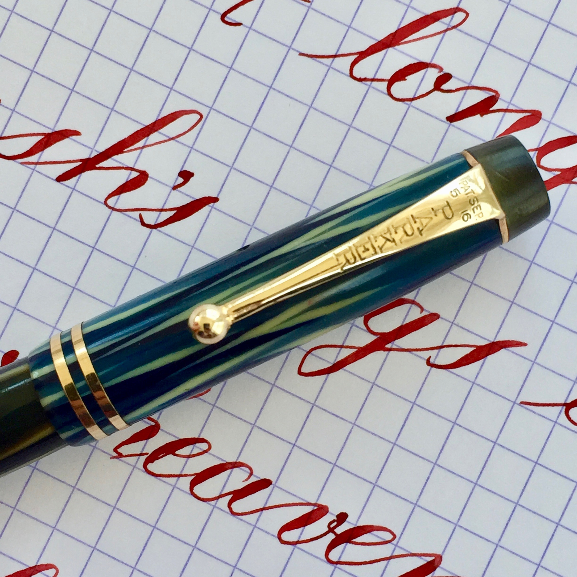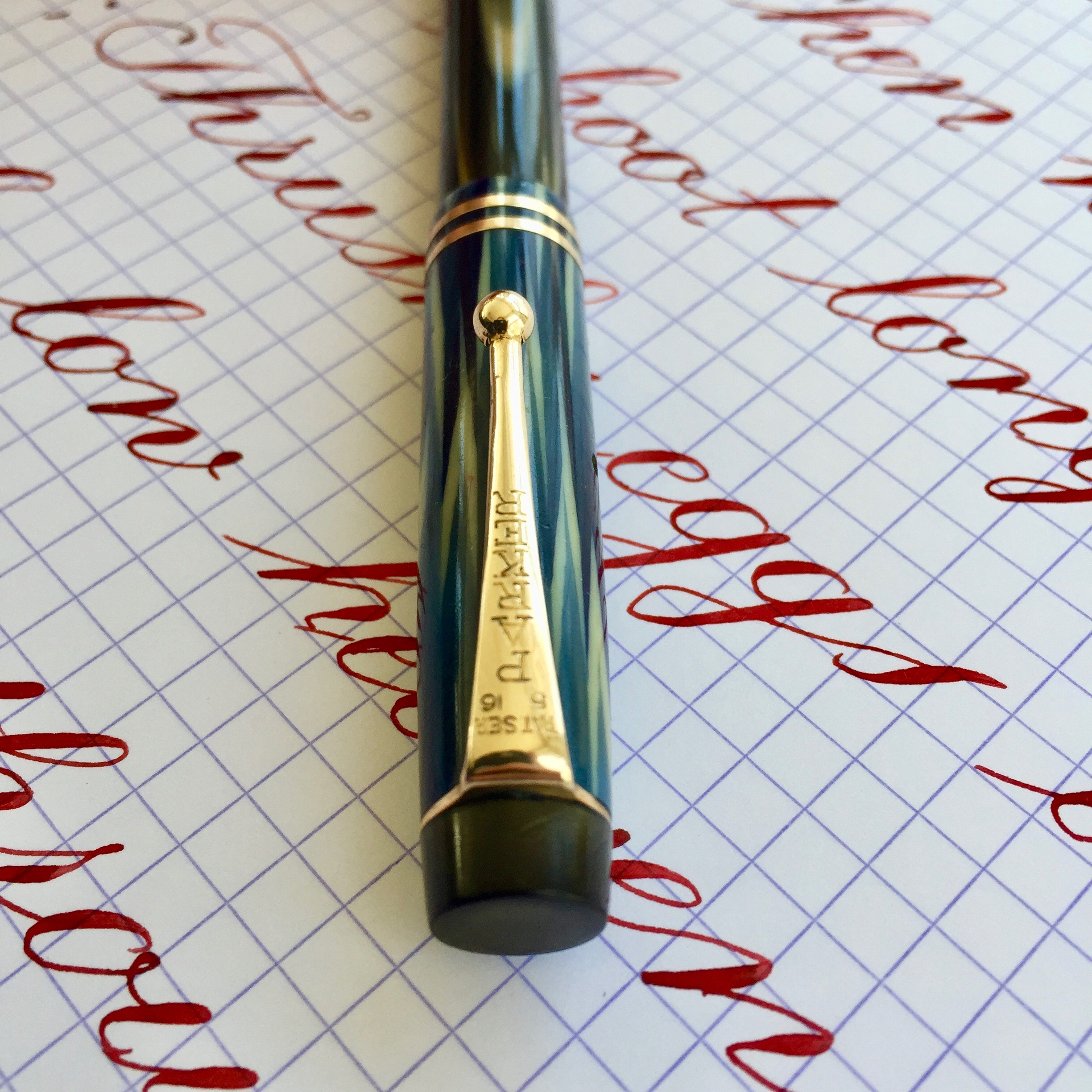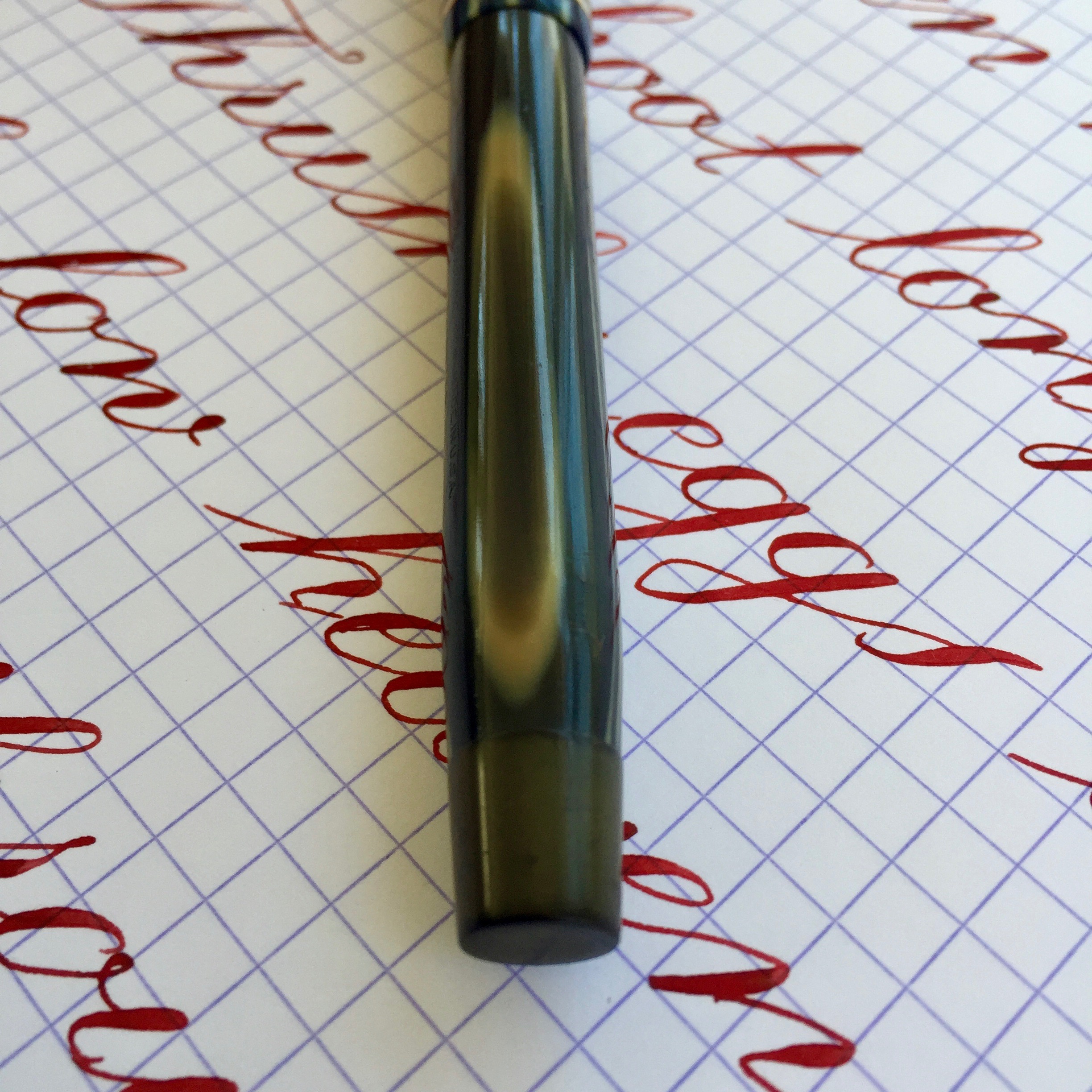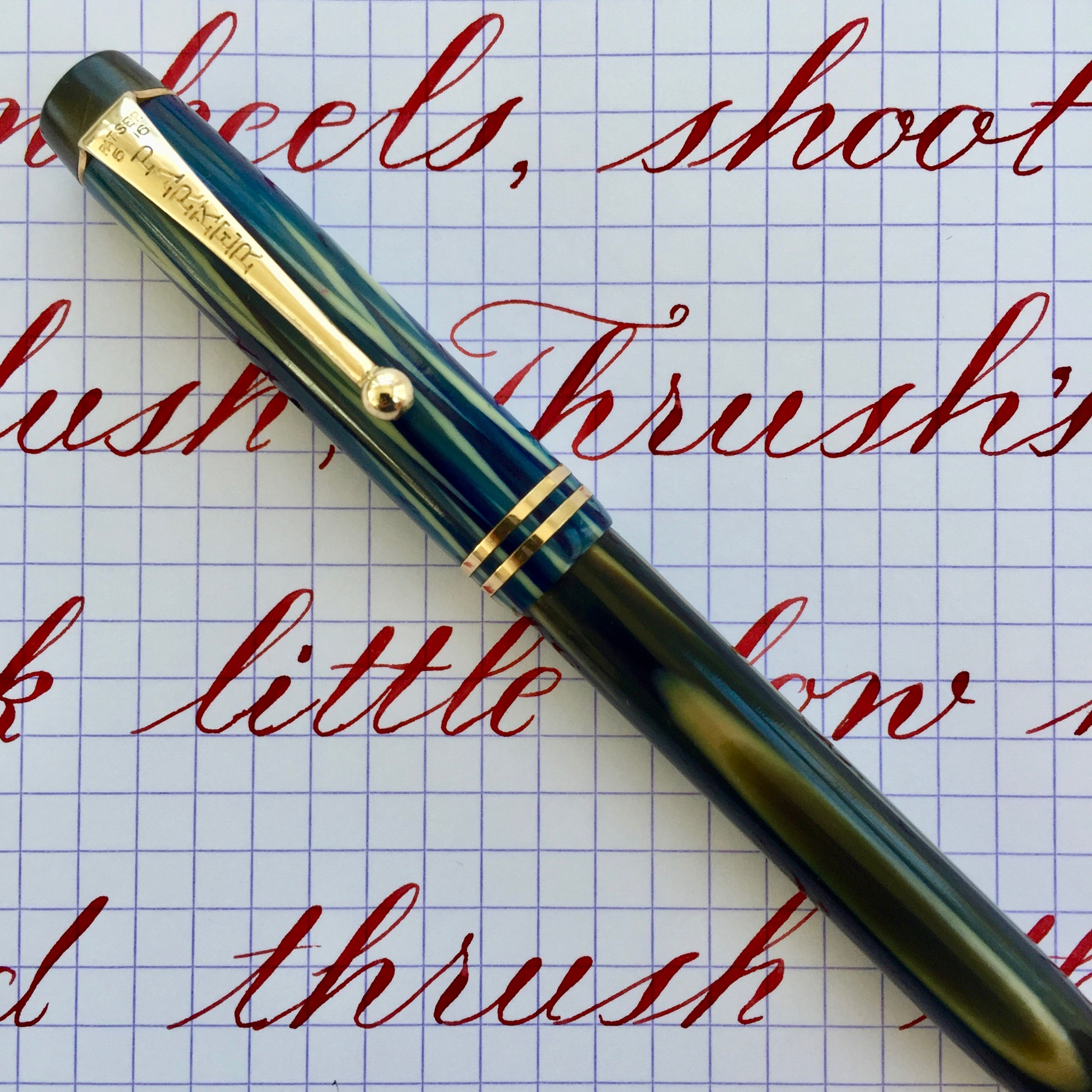 Here is a Parker Duofold style pen in the iconic “True Blue” style. I believe that this is a “Junior” size, but I could be mistaken. The “True Blue” has faded and yellowed as is typical on these pens. The body more so than the cap, which is fairly close to the original color. There are a few very small scratches from normal use on the pen, but nothing obvious or major. The black hard rubber ends have also faded to a gray brown. Trim looks goods with no brassing. The 14kt Parker Lucky Curve #2 is a glorious writer. It is buttery smooth and wet, and it has a soft, springy feel to it. The flex on this nib comes easily, but the range is not massive. It goes from a F (0.4mm) to BB (1.3mm). The ease of flex is super flex quality, as is the responsiveness (it’s very snappy). The range, however, puts it more in the “good flex” grade. It does railroad occasionally after you’ve been flexing awhile, but it picks right back up. Overall, a very nice Parker in a very desirable color.