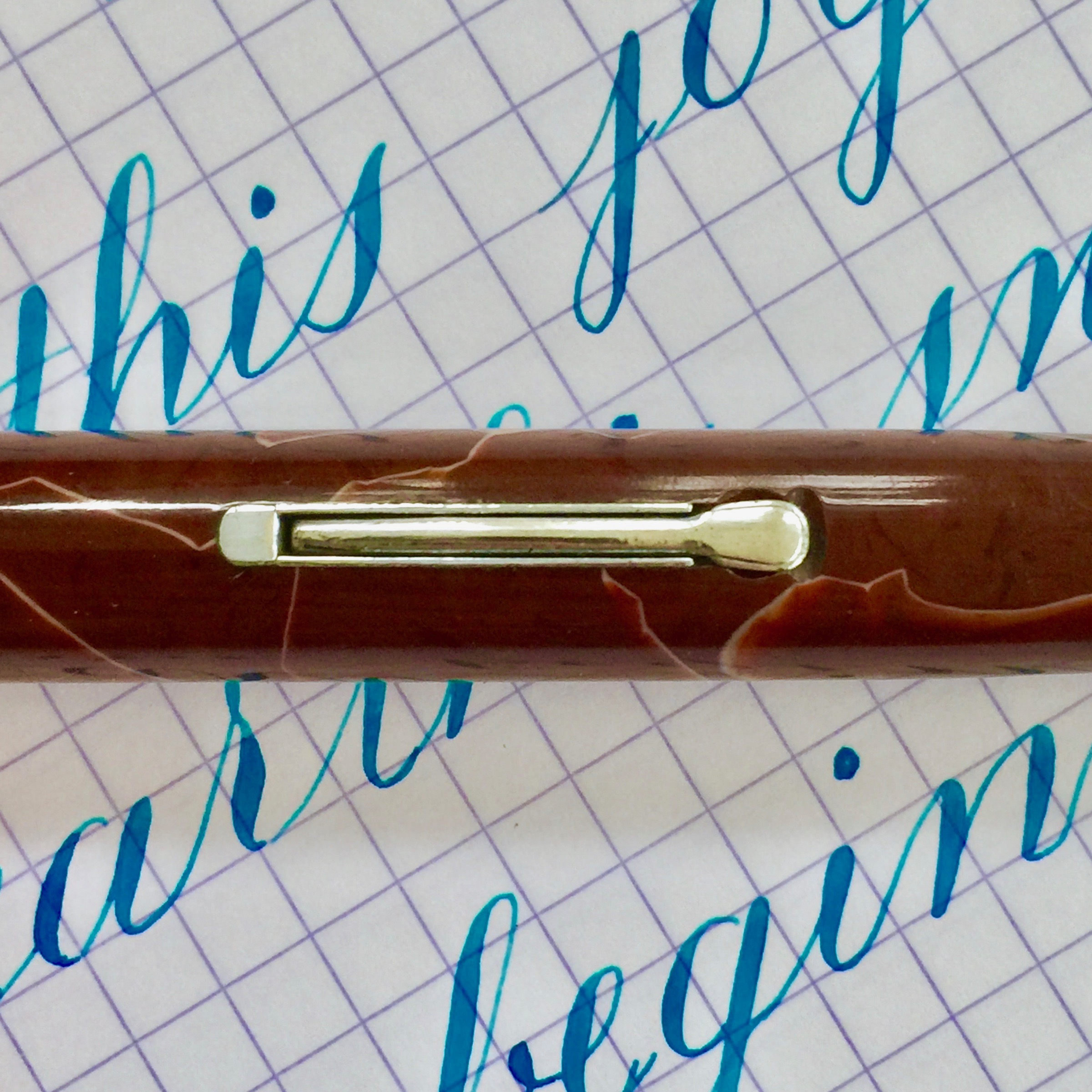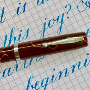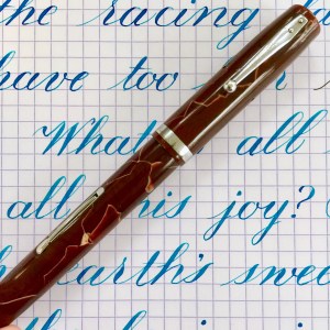 Here is a lovely 32 in a burgundy marble finish. This is one of my favorite colors of the Waterman celluloid pens of the middle late 30s. The chrome trim has some wear, especially on the band, but it is all still distinctly chrome silver in appearance. The body has some light scratching through from use, but no major or deep scratches. Imprints are all very good, and the color on this pen is really lovely in my opinion. The 14kt. Waterman #2 nib on this pen is really outstanding. It is a soft super flex nib. Not quite a noodle soft, but approaching it. It writes normal as a soft, bouncy XXF. The nib is quite smooth for how fine it is. The bulk of the pen (it’s similar to the bulk of a 52) and the celluloid body combined with the nib make this pen a wonderful normal writer. Add to that it’s great flex ability, and it’s stunning. The flex ranges up to BBB (1.6mm) and has a nice bouncy, responsiveness to it. All around wonderful pen.