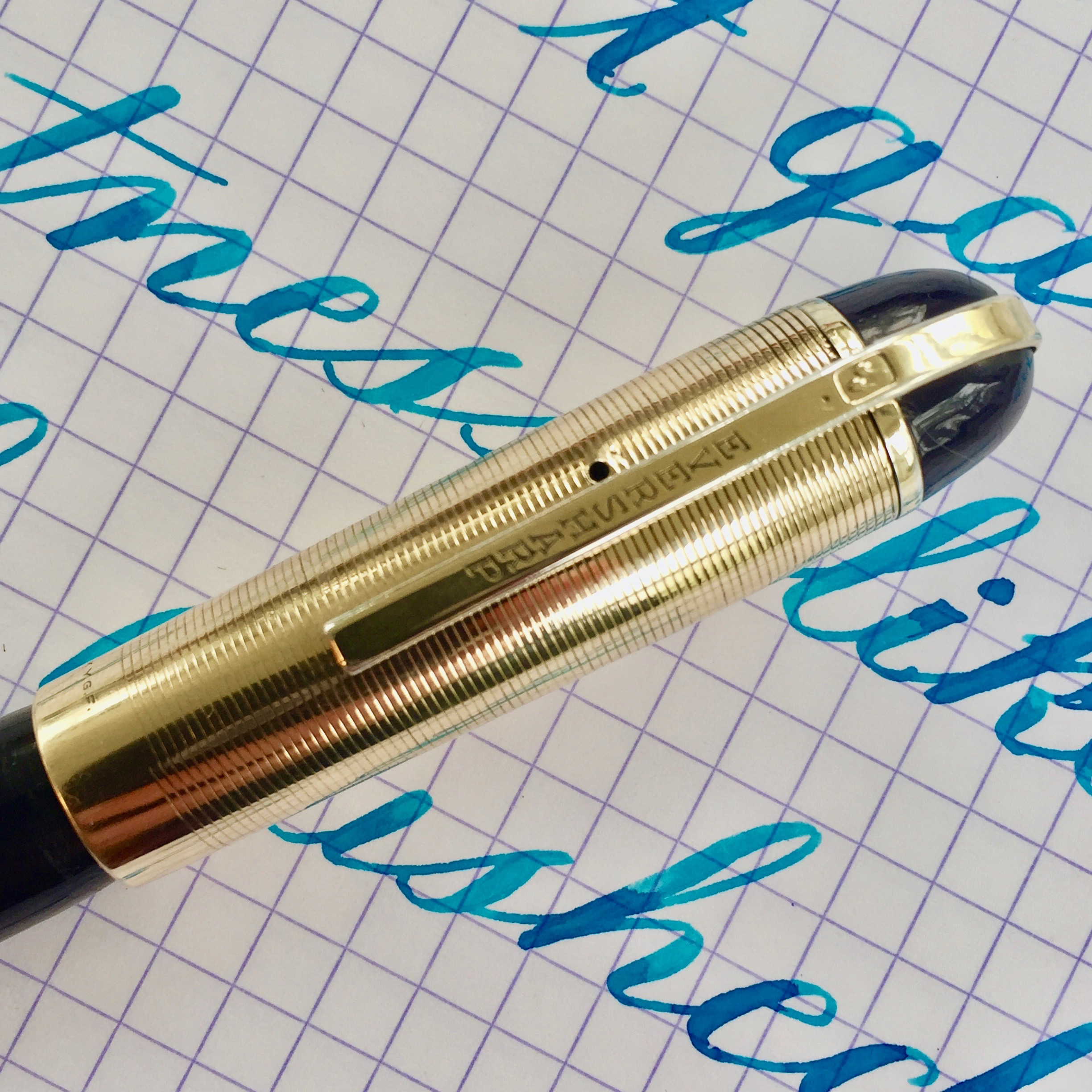 Here is a Skyline in Navy blue with gold-filled trim. The pen is in excellent condition. The body shows only very light surface scratching from normal use. There is one little spot on the barrel near the cap that shows a slight depression. It’s hardly even noticeable. The trim is also in good shape with only a single very slight ding in the back of the cap. The lever has a little bit of plate loss on the crown due to posting the cap. The clip looks great. The 14kt. Eversharp nib is pure joy to use. It is a juicy Fine Stub nib (0.6mm) with soft, super flex capacities. The tip of the nib does have some marks. They almost look like teeth marks, which is odd. But there they are. Normally, this pen writes buttery smooth with good line variation. When flexed this nib ranges from 0.6mm to 2.0mm. Since it is a stub, it will railroad some if you aren’t holding the nib properly to the paper while flexing. A great Skyline with a pretty rare flex stub nib.