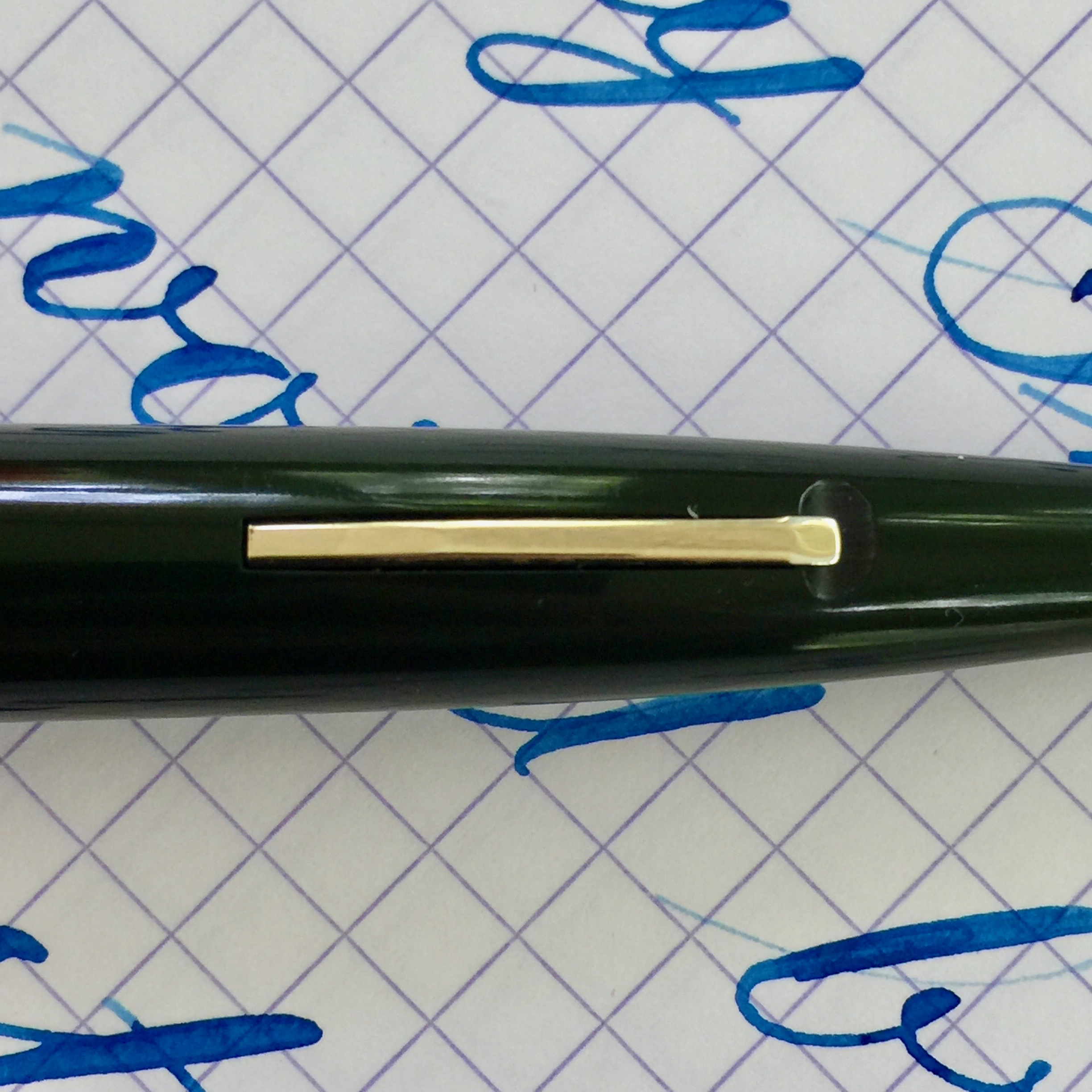Here is Skyline, Demi size, in green with gold filled trim. The body looks great with only minimal light scratching from normal use and most of it buffed and polished out. The gold-filled trim is also about as good as you can find in a Skyline with no brassing to speak of. The name “Lois Jean Brooks” is etched in the side of the barrel. The 14kt. Eversharp nib is a very smooth F. It is wet but not a gusher, and makes for a really nice normal writer. The nib does have some flex. The range of the nib is really good going from F to BBB (1.8mm), and it is pretty responsive as well. Ease of flex is a bit on the stiff side and you will start to get some railroading after you’ve flexing for a bit unless you are using some really wet ink. Still, this nib is better than anything you can in modern stock flex nibs.