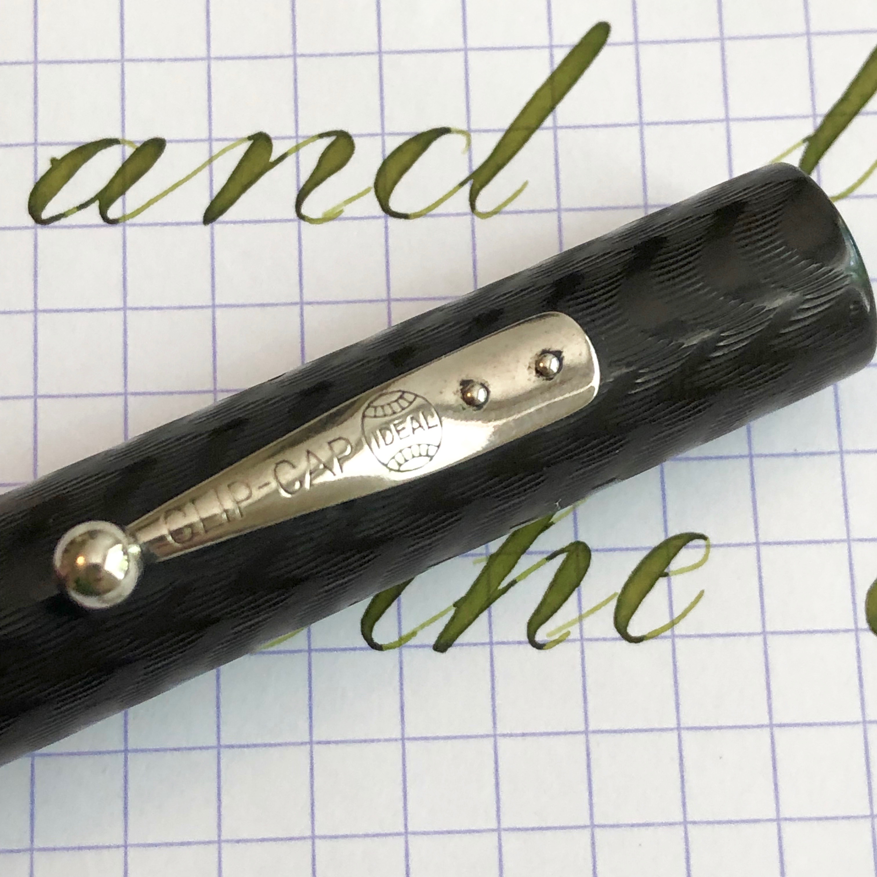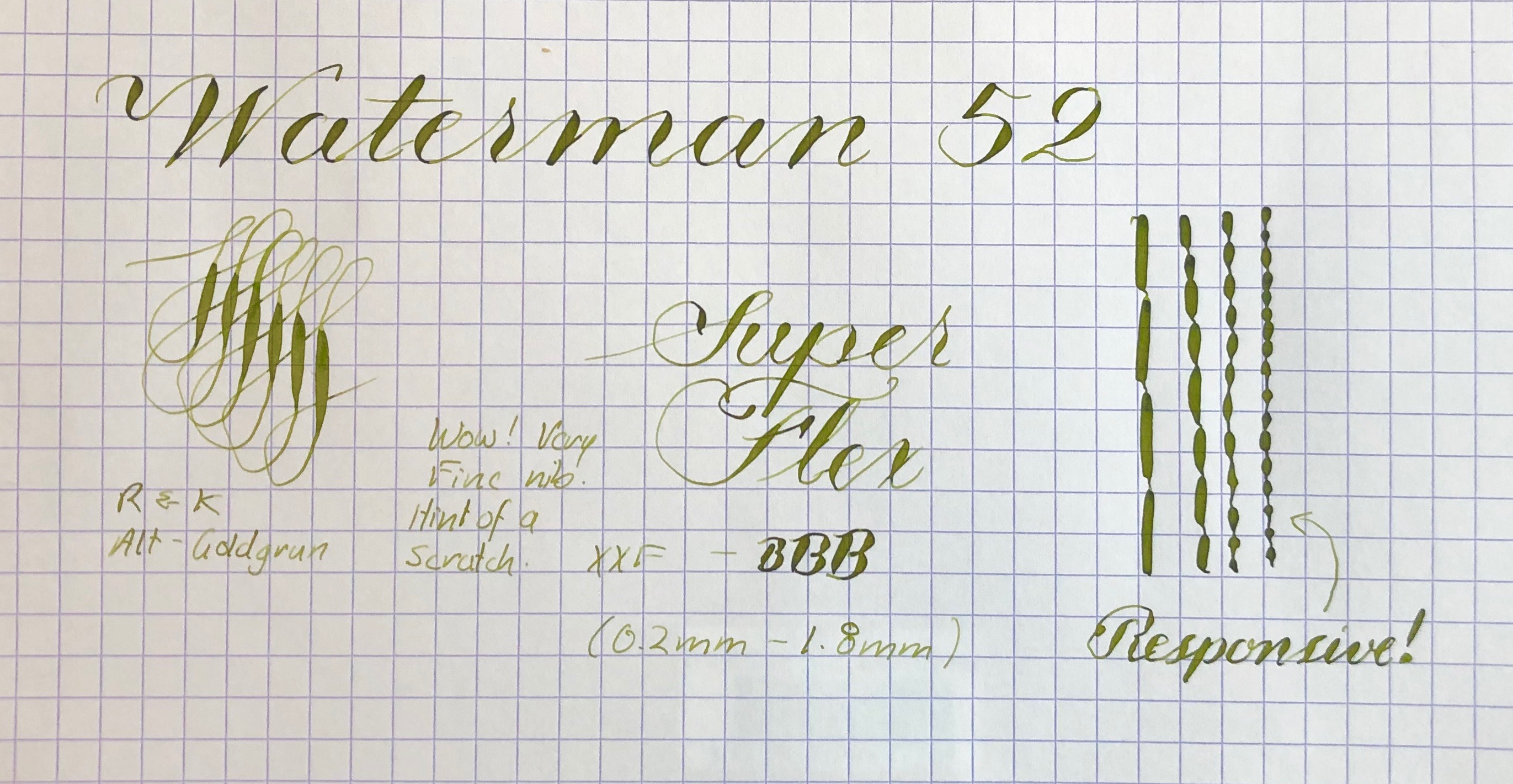 Here is a Waterman 52 in BCHR that is in excellent condition. The BCHR is still very black with just a little bit of fading. The chasing on this pen is crisp as are the imprints. The “52” on the end of the barrel still has the red paint. There is minimal wear on the clip and lever with no brassing. The pen looks new. It still has the shine of a new pen. The 14kt. Waterman #2 nib is also a beauty. It is a long and slender tined super flex. The nib does have a slight ding on the end of the right tine just behind the tipping, but it has no effect on the writing of the pen. With normal pressure, this nib writes as a super fine “XXF.” There is just a hint of scratch as you would expect from so fine a nib. The nib flexes wonderfully up to BBB (1.8mm), so a huge range going from XXF to BBB. As you would expect from so fine a nib, it has a beautiful snappy and responsive feel to it. A great nib for artists and scripts like Copperplate. This pen is rare and desirable in multiple ways. First, it’s not easy to find BCHR Waterman 52’s in this kind of condition. And second, the most desirable nib out there right now is a XXF-BBB flex nib.