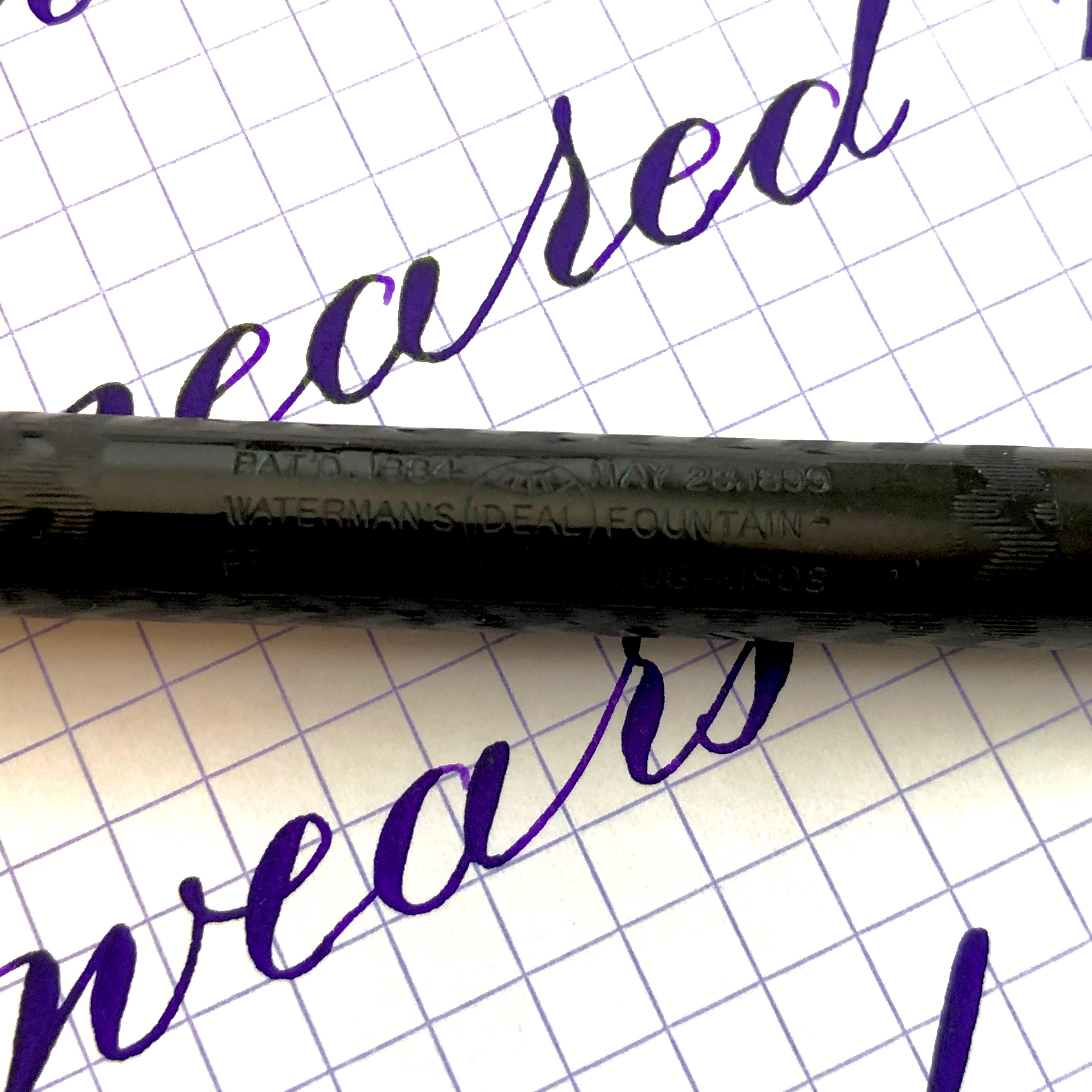 Here is an almost perfect Waterman 12 eyedropper in BCHR. The black hard rubber is in rare good condition. There is very minimal fading, and it is still black and shiny. The chasing looks brand new with virtually no wear. The imprints are also crisp as new. The only small defect is that the section has a few light teeth marks (see pic). The 14kt. Waterman #2 is also a superb Fine (0.4mm) that writes on the wet side and is soft and buttery smooth. It has a huge flex range going from F (0.4mm) to BBB+ (1.9mm). The flex is quite wet with average responsiveness, but with that kind of range it doesn’t have to be super responsive. It’s not a wet noodle but flex comes pretty easy. Rare condition, beautiful writer, with great flex.