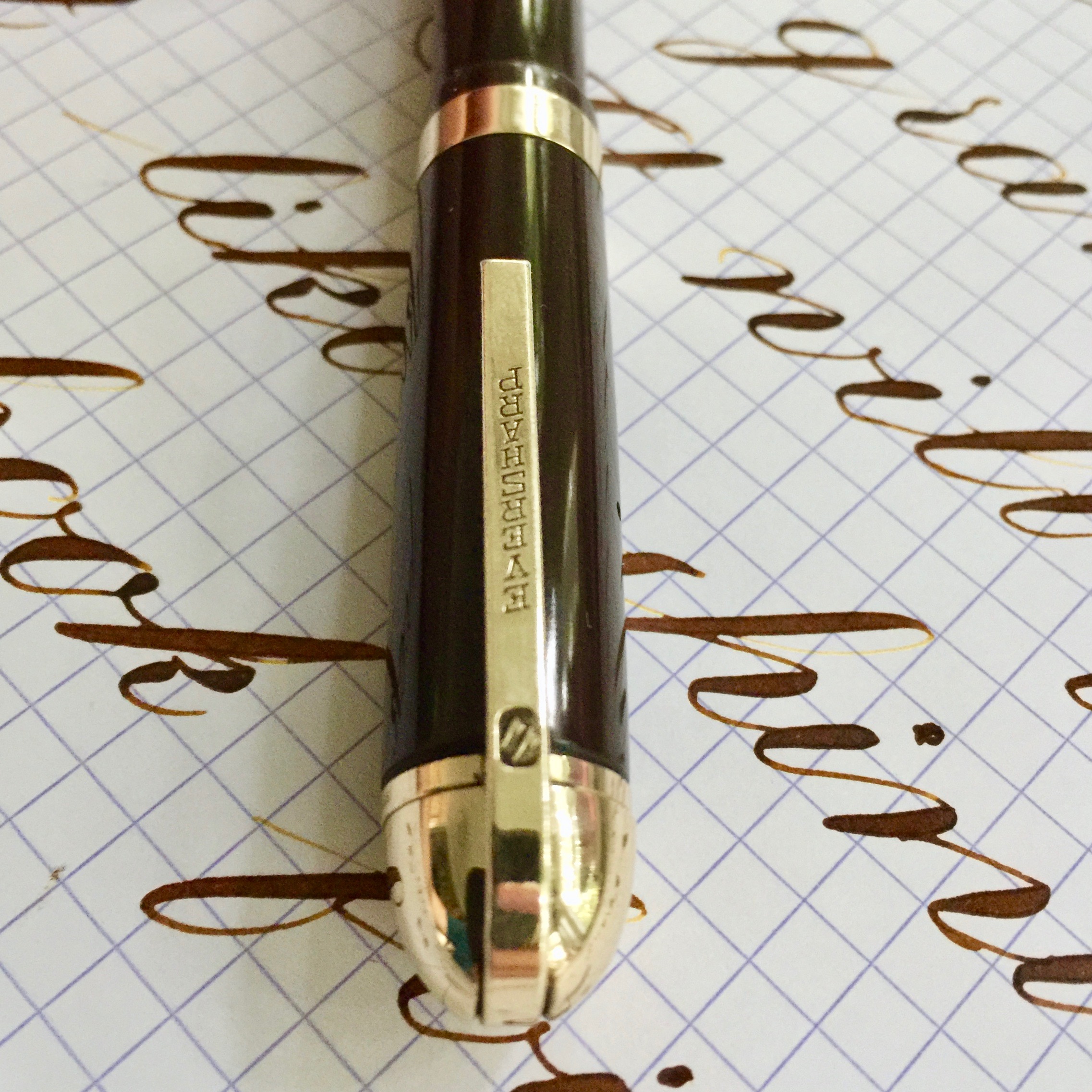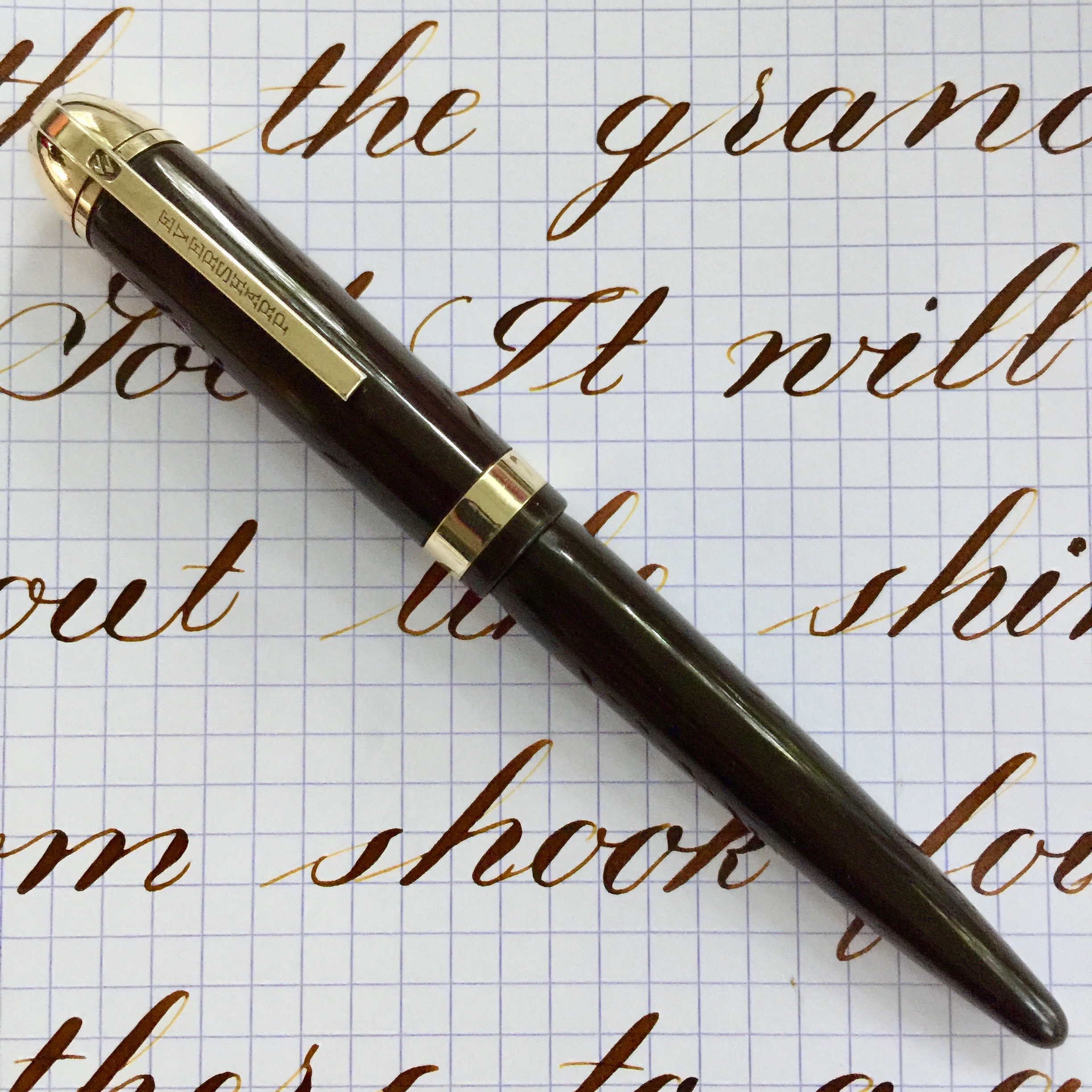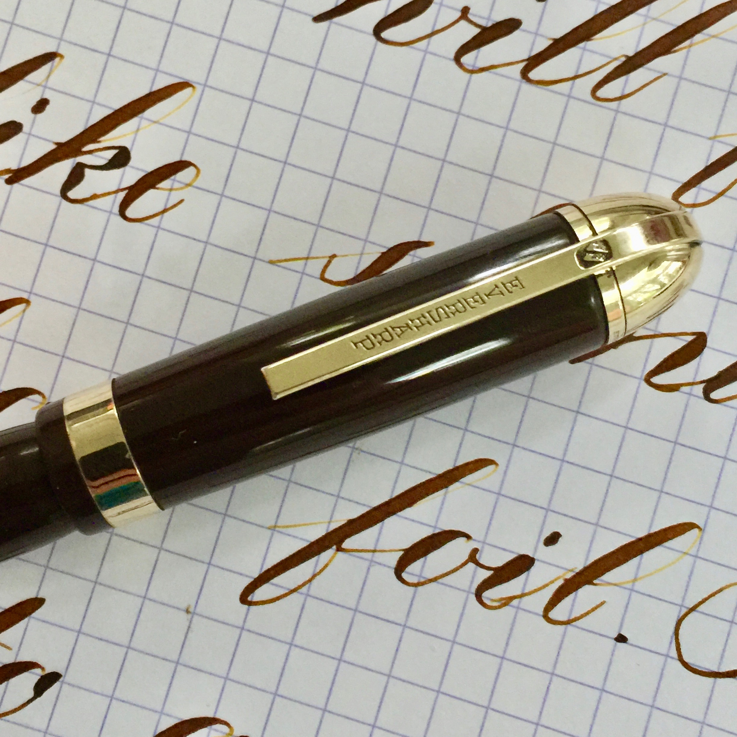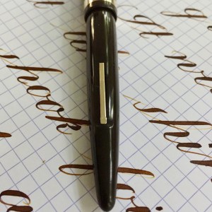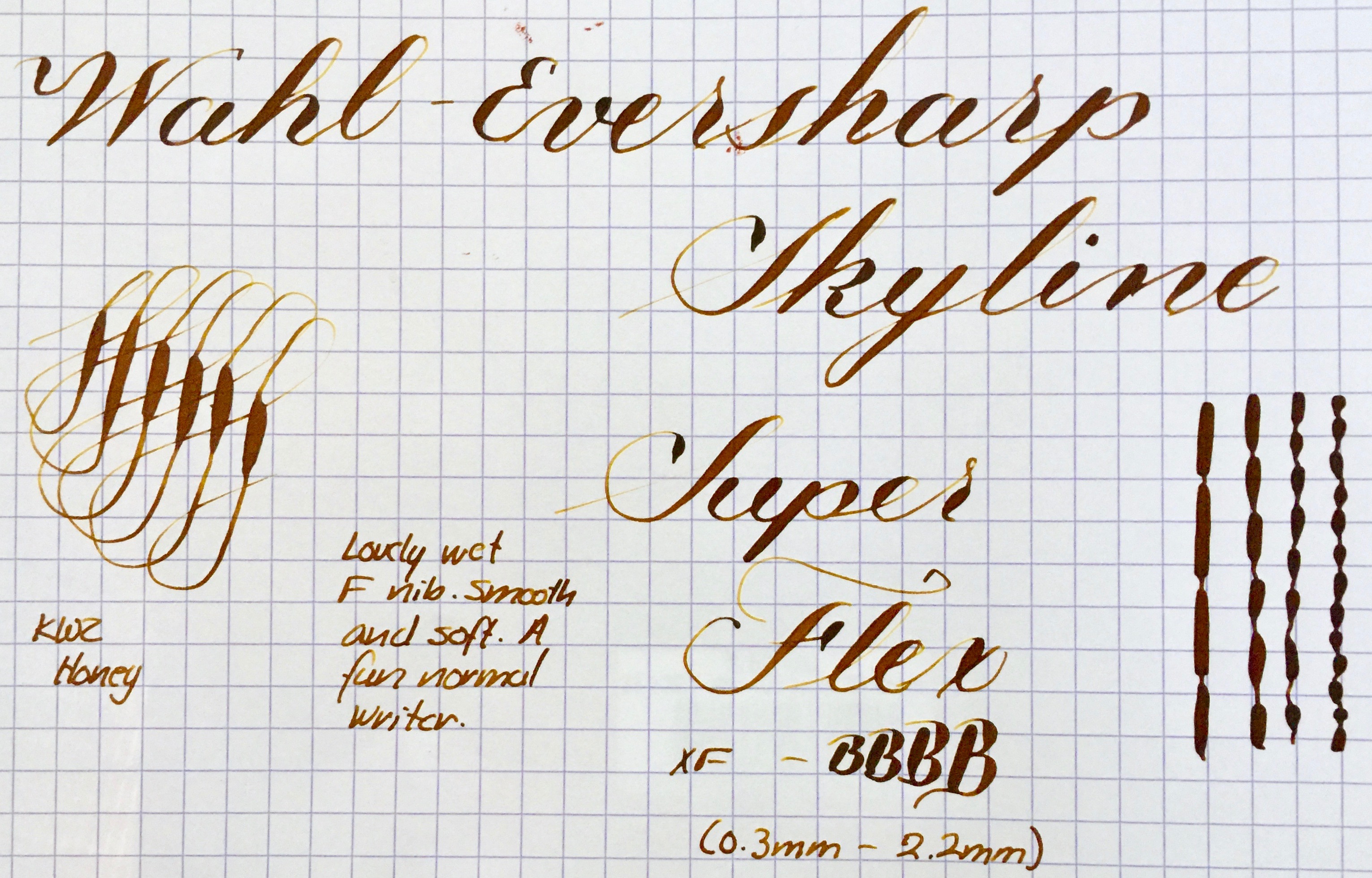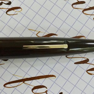Here is a fantastic Skyline in brown with large gold-filled cap band and gold-filled derby. The pen is in excellent condition. There are only micro scratches from normal use that has mostly buffed out. The gold-filled trim is in excellent condition with no brassing on the derby, clip, or band. There is just a tiny bit of plate loss on the edges of the lever, but you’d have to look close to even see it. The nib on this pen is a blast. It’s a smooth, lovely, soft writing wet XF (0.3mm). In addition to great normal writing, this nib has soft, fantastic flex going from XF to BBBB! (2.2mm). That’s a huge range. Responsiveness is also quite good. It’s not quite soft enough to be called a wet noodle, but it has many of the qualities of a wet noodle nib. Definitely a high caliber flex nib. And it’s a nice large, robust 14kt. Eversharp Skyline nib. All around fantastic pen.