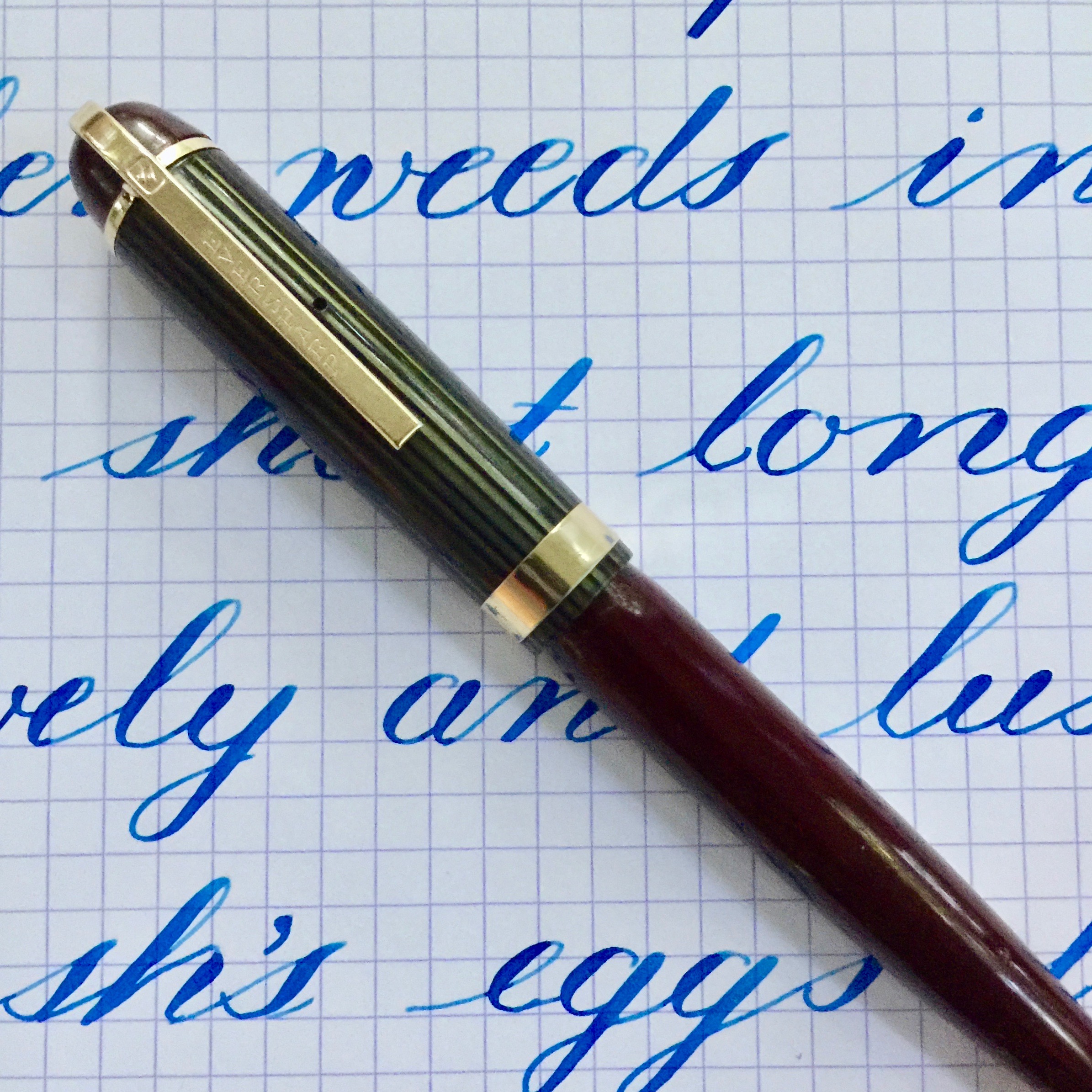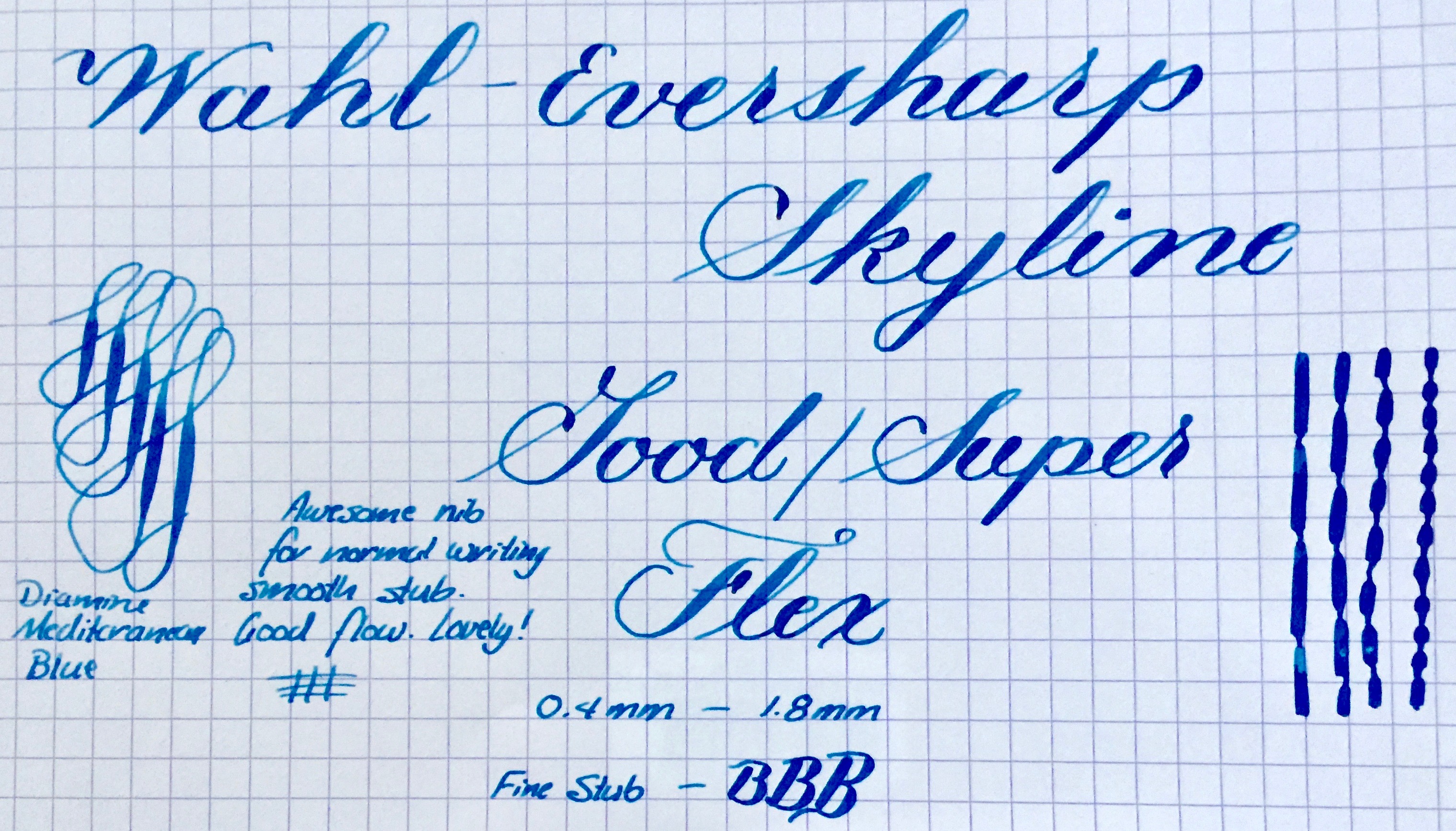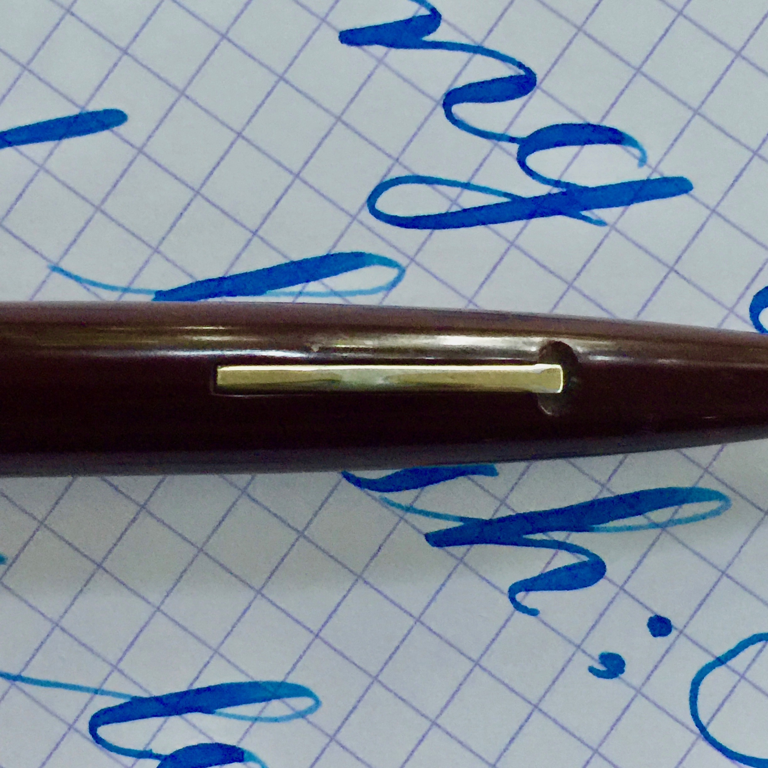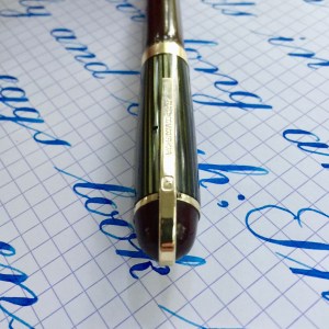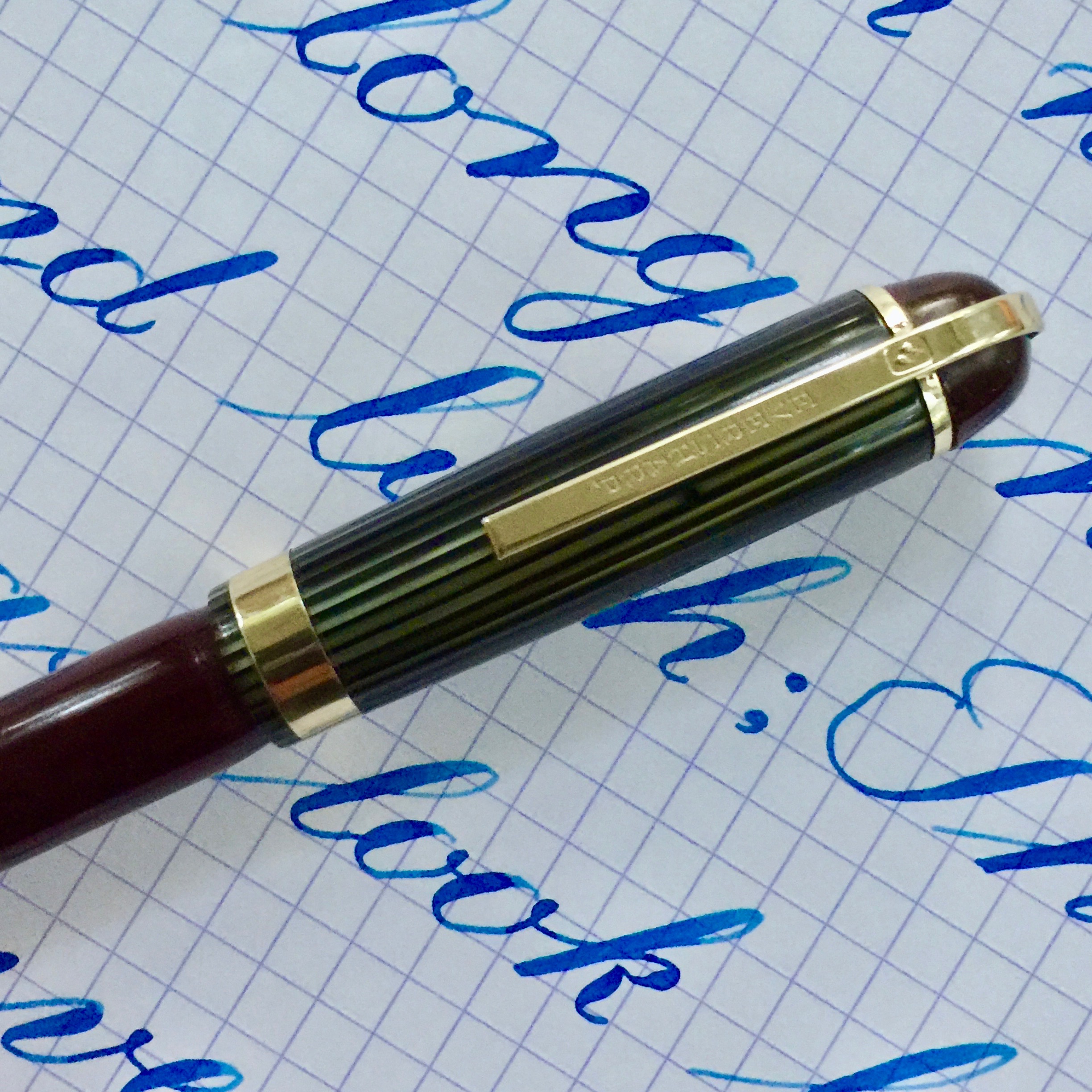 This is a gorgeous Skyline in burgundy with a green and black pinstripe cape and a large gold-filled band. The pen is in great condition. The body shows very little wear. The gold-filled trim looks great. There is a little bit of plate loss on the crown of the lever. The band looks great. There is also a small, hardly noticeable, indent on the cap next to the clip, and probably made by the clip. The 14kt. Eversharp nib is such a beautiful writer. It’s a Fine (0.4mm) stub. It has a nice flow, it’s buttery smooth, and it has some definite character to it. A pure pleasure to write with. The nib also has some pretty nice flex ranging up BBB+ (1.8mm). It has decent responsiveness. I’ve rated it on the border between “good” and “super” flex mainly because it is a bit on the stiff side for “super flex.” Still this pen is a beauty and that nib is such a joy.