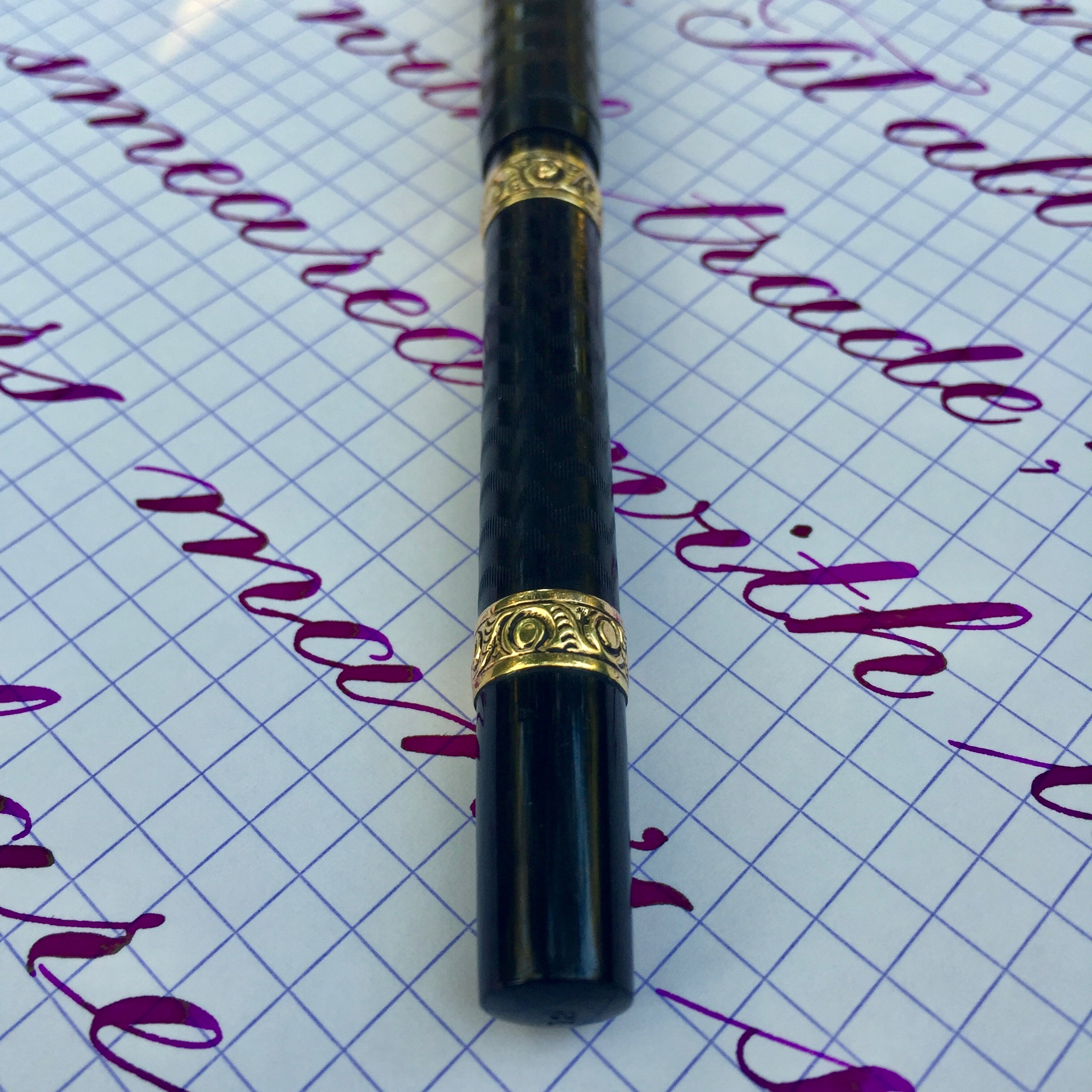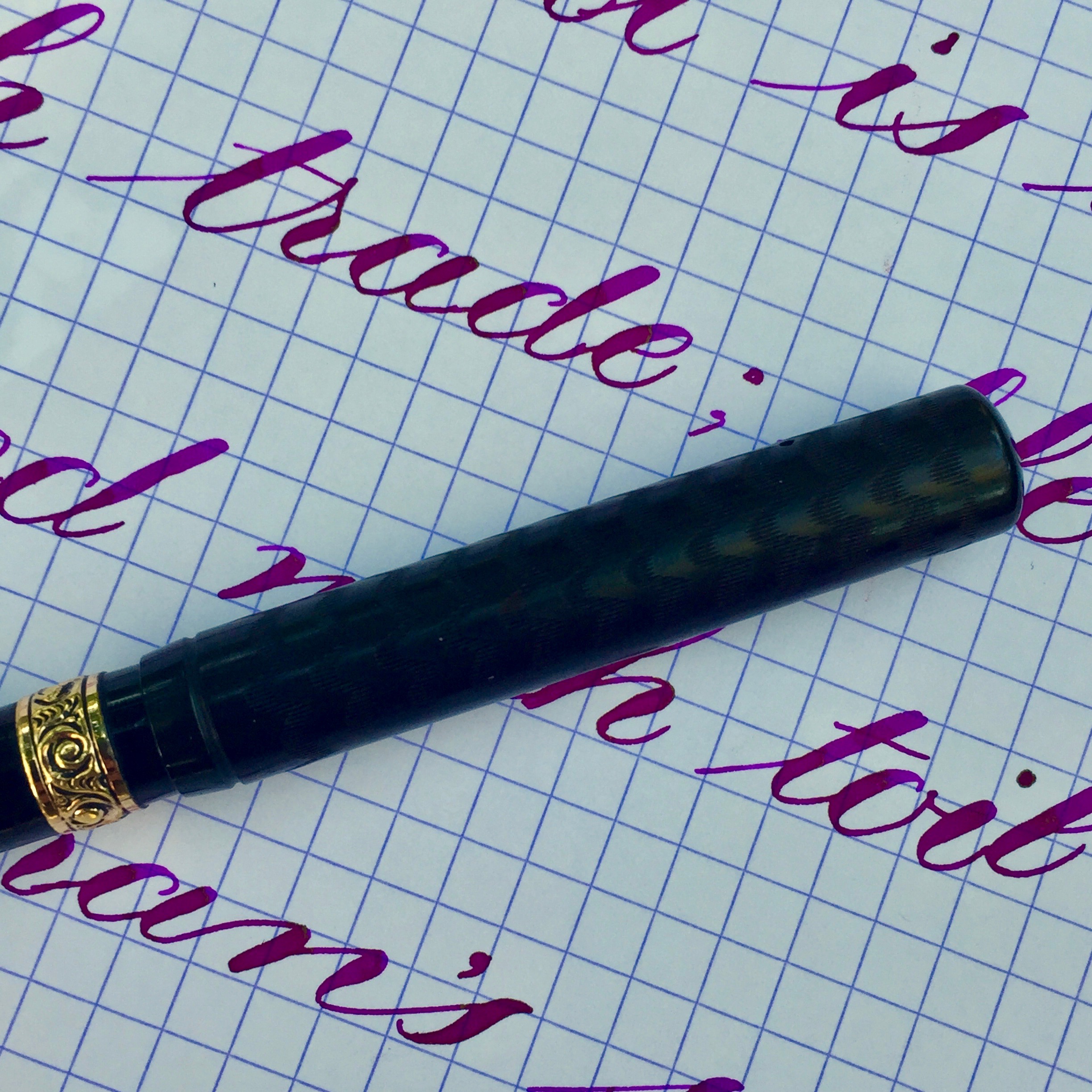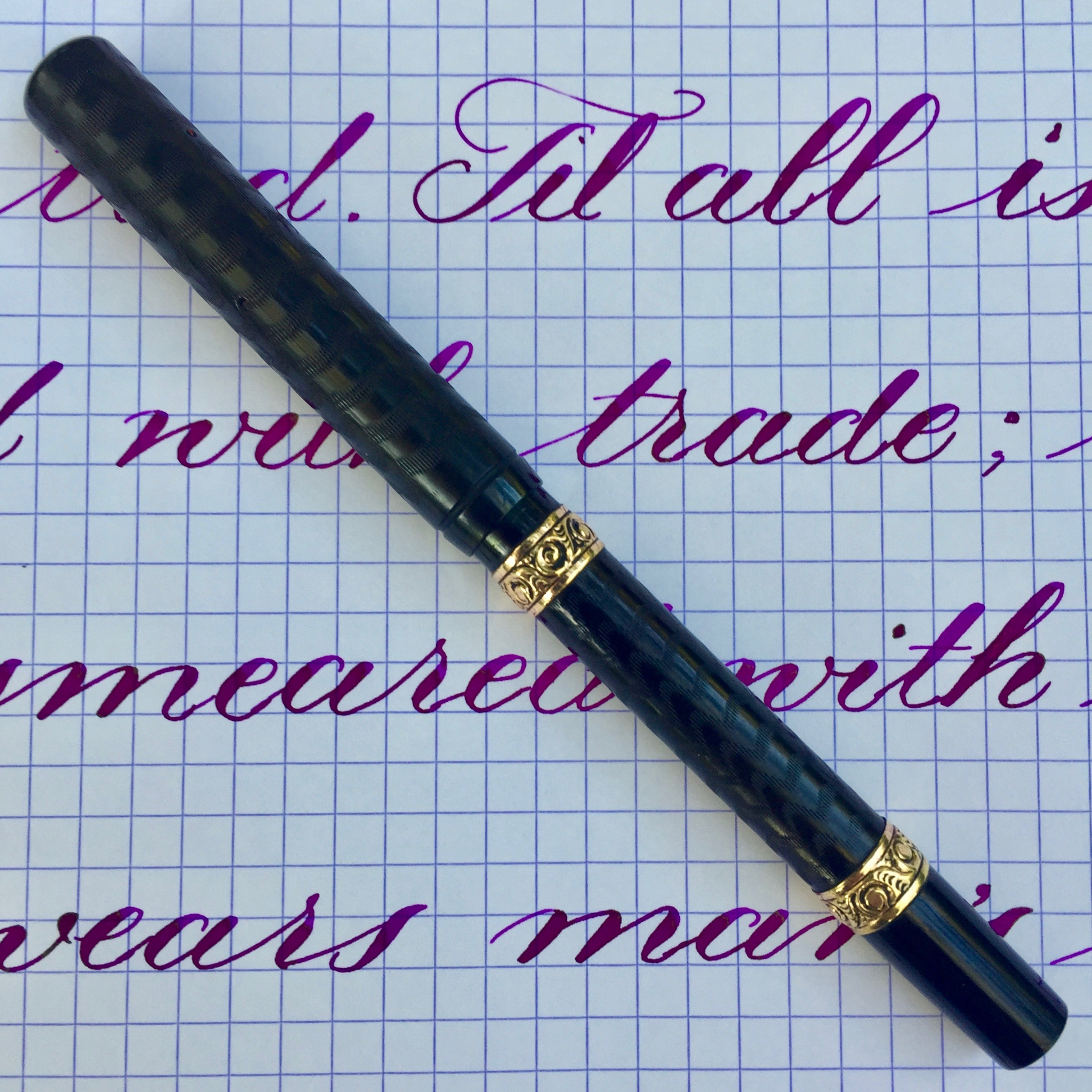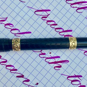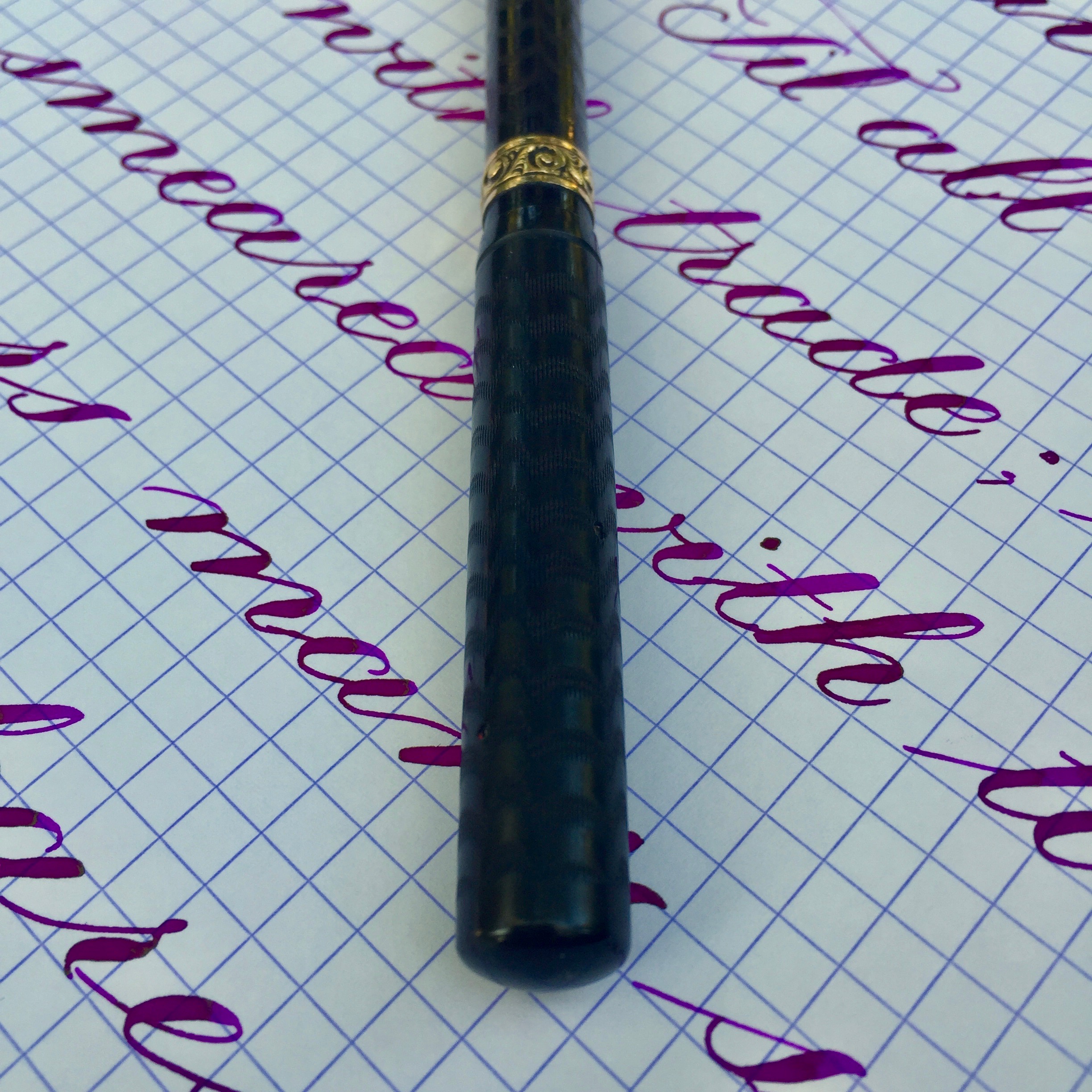 Here is a lovely Waterman 12 eyedropper in BCHR. The black hard rubber is faded a bit into a very dark blackish brown. The chasing, however, is still very nice with some good texture left on it. Imprints are perfect and easy to read. There is a gold-filled repousse band on the cap with no brassing that I saw. There is tiny crack in the lip of the cap (see pic), but this will not expand thanks to the cap band. There are also some teeth marks on the section (see pic). The 14tk Waterman #2 is a lovely writing XXF nib. The nib does not have a huge range of flex going up to BB (1.5mm), but it is definitely good enough to pair with the XXF point. Ease of flex is on the low end of “super flex,” I would say, but the responsiveness of the nib caused me to grade it as I did. R & K Cassis (the ink I used) doesn’t emphasize responsiveness that well, which makes the nib’s snappiness that much more impressive. If you are looking for something that makes big, paintbrush lines….this isn’t it (though I do sell those as well). But if you want something for a more Copperplate style, this is a nice choice.