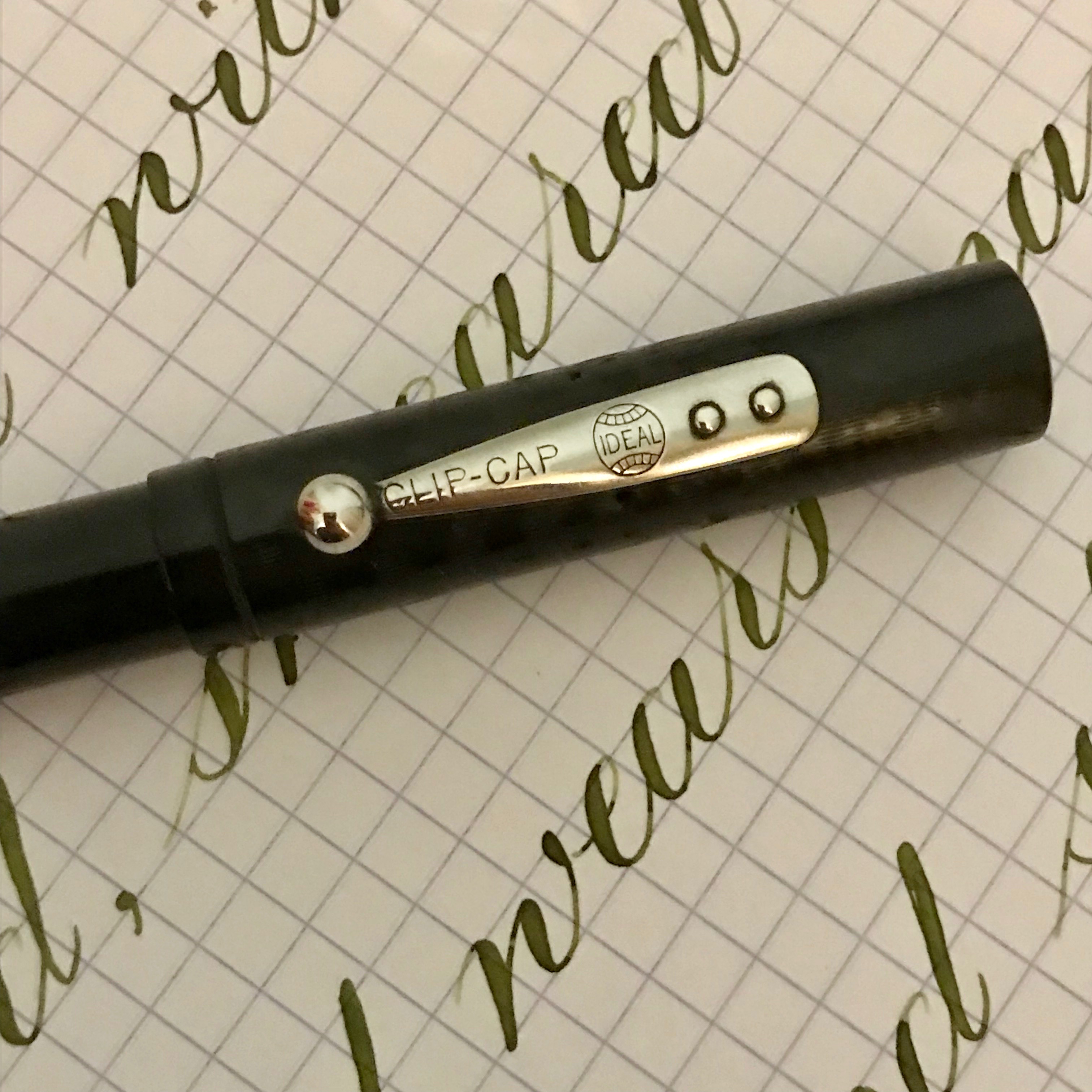 Here is a Waterman 52 in BCHR that is in great condition. The BCHR is only faded a little, but is still mostly black. There is some wear to the chasing, but it still is obvious and it still has texture. The nickel-filled trim is also in great condition. The lever does have some very small and light scuff marks that you can see on close examination, and the IDEAL on the lever is a bit worn. Imprints are very crisp and easily readable including those on the end of the barrel. The 14kt. Waterman #2 nib is a beauty. It is a very nice, soft writing XF. It is quite fine. Probably a bit finer than 0.3mm, but the wetness of the nib may make it feel closer to 0.3mm. The flex on this nib is also lovely. It flexes very easily up to BBB. Ease of flex is right on the border between Super Flex and Wet Noodle. I would grade it closer to Super Flex. Additionally, the nib has some great responsiveness and good flow. Overall, a superb vintage Waterman.