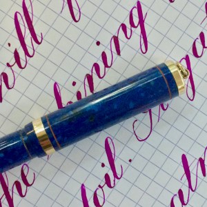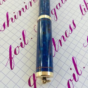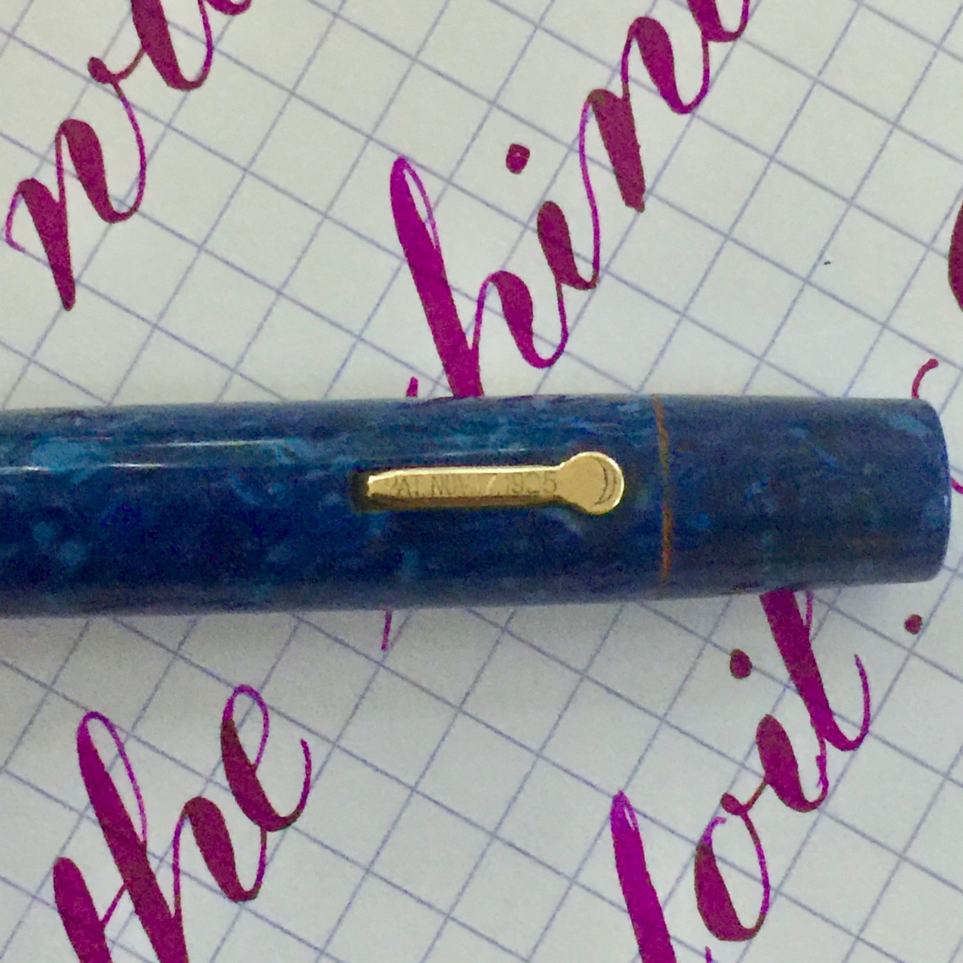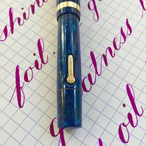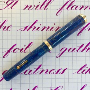 Here is a gorgeous Sapphire Conklin Endura ring top in superb condition. The body of the pen is beautiful. The color is fantastic. There very little sign of wear. The gold-filled trim has no brassing. Imprints are crisp and easily readable. And it’s a gorgeous color. The 14tkt. gold made it Toledo Conklin nib is a beauty. It’s a rather wet and smooth writing XF normally, but it has fantastic flex. I’ve graded this on the border between “super flex” and “wet noodle.” It’s really close to a “wet noodle.” It might be just a tad on the firm side of “wet noodle,” but it’s not a firm flex at all. The range of flex on this is awesome going from XF (0.3mm) to a massive BBBB+ (2.3mm) without much pressure. It also has very good responsiveness. It’s a top class flex nib. And it’s on a beautiful pen in collector’s quality condition.