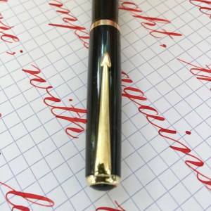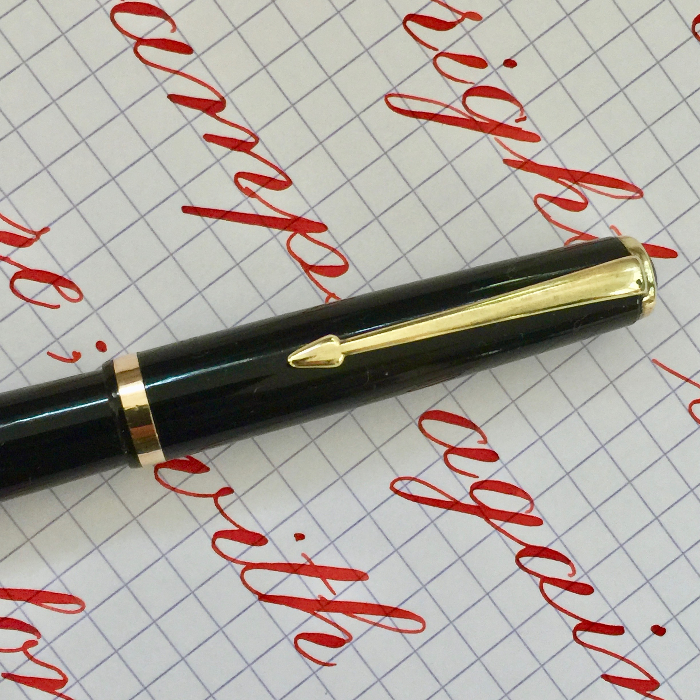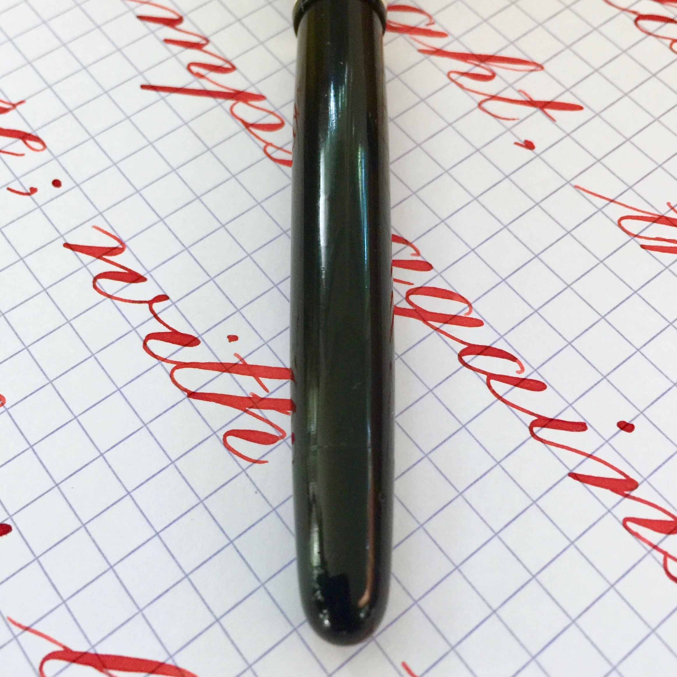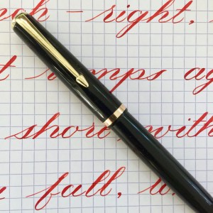 Minerva was a sub-brand of Omas. In my experience with Minerva the quality of the pen is on par with Omas, but the pens are paired down a bit (less trim, etc.). But I’ve only restored a handful. This pen probably dates to the late 40s-50s. It is a black celluloid in an almost identical style to an Omas of the same era. Gold filled trim is in great condition with no brassing. The pen is a piston filler, and it works great. There does appear to be a few very light teeth marks on the piston knob, but you’ll miss them unless you are looking close. The right tine of the nib has a little bit of a raised are toward the breather hole. At some point someone wanted this nib to write a bit finer than XF and attempted to reduce the flow. That’s how I found the nib. This left that right tine with a mark due to being bent down a bit. I adjusted the nib and functionally it’s strong, stable and writes great, but there is still that aesthetic mark. Anyway, the nib is a 14kt. Minerva XF (0.3mm). It writes plenty wet without overdoing it, and it’s also plenty smooth. I’ve graded the flex as a “good flex.” Ease of flex is closer to super flex, but the range is a little limited and there is a very occasional chance of a railroad. Basically after four lines or so the sample writing, it railroaded. I gave the pen a slight shake, and it picked up back. Four lines later, the same thing, and so on. Still, it’s a great pen for normal writing or flex work.