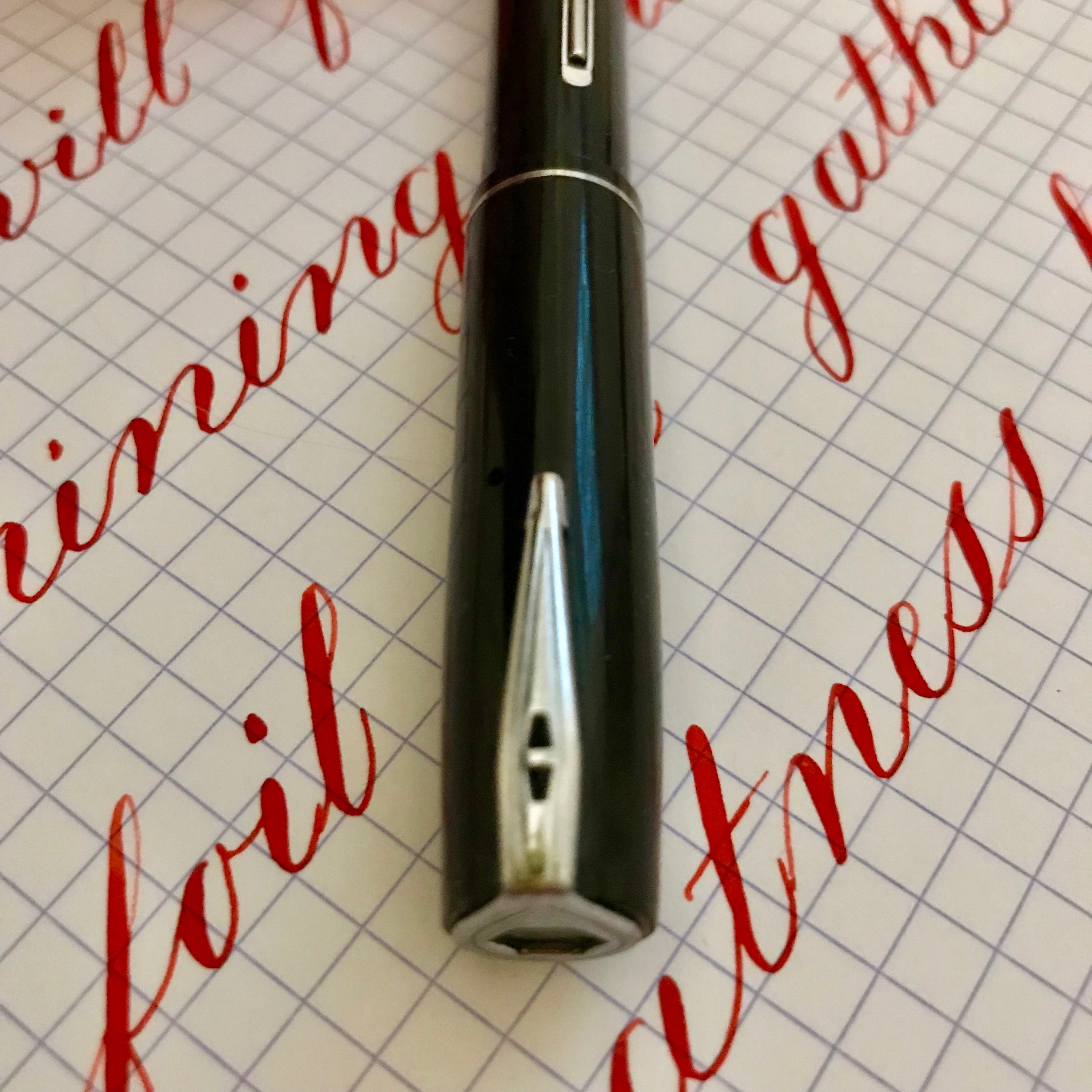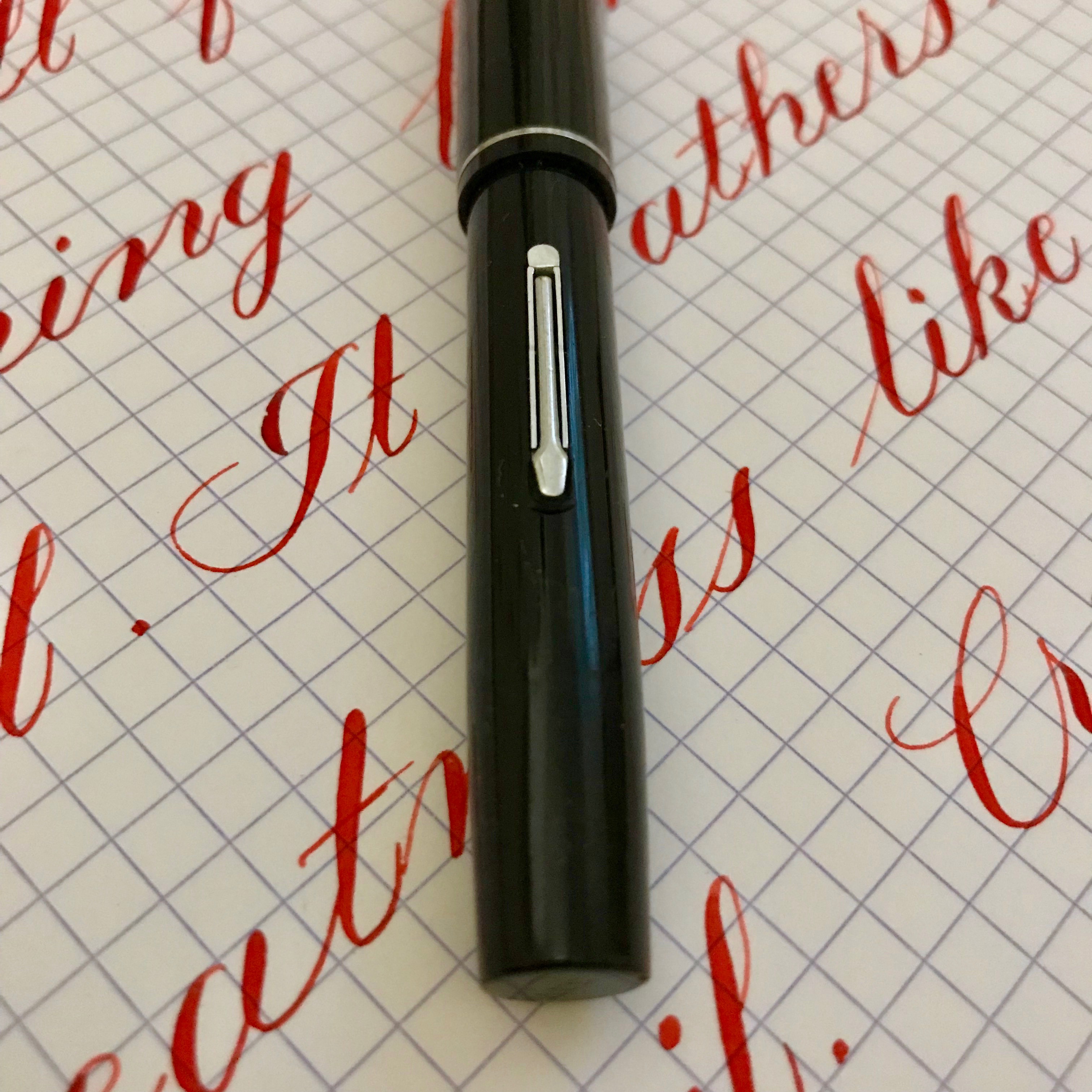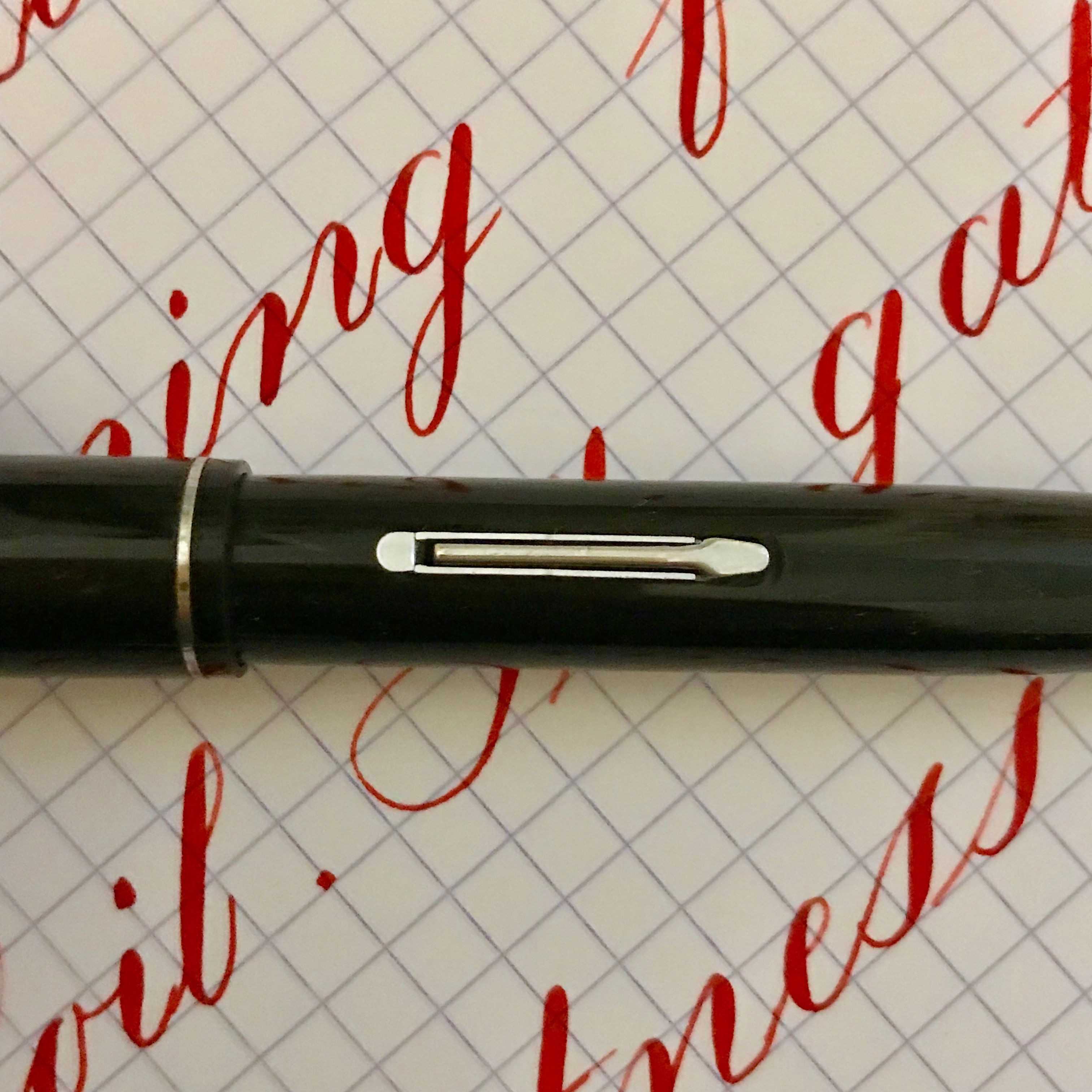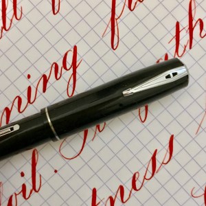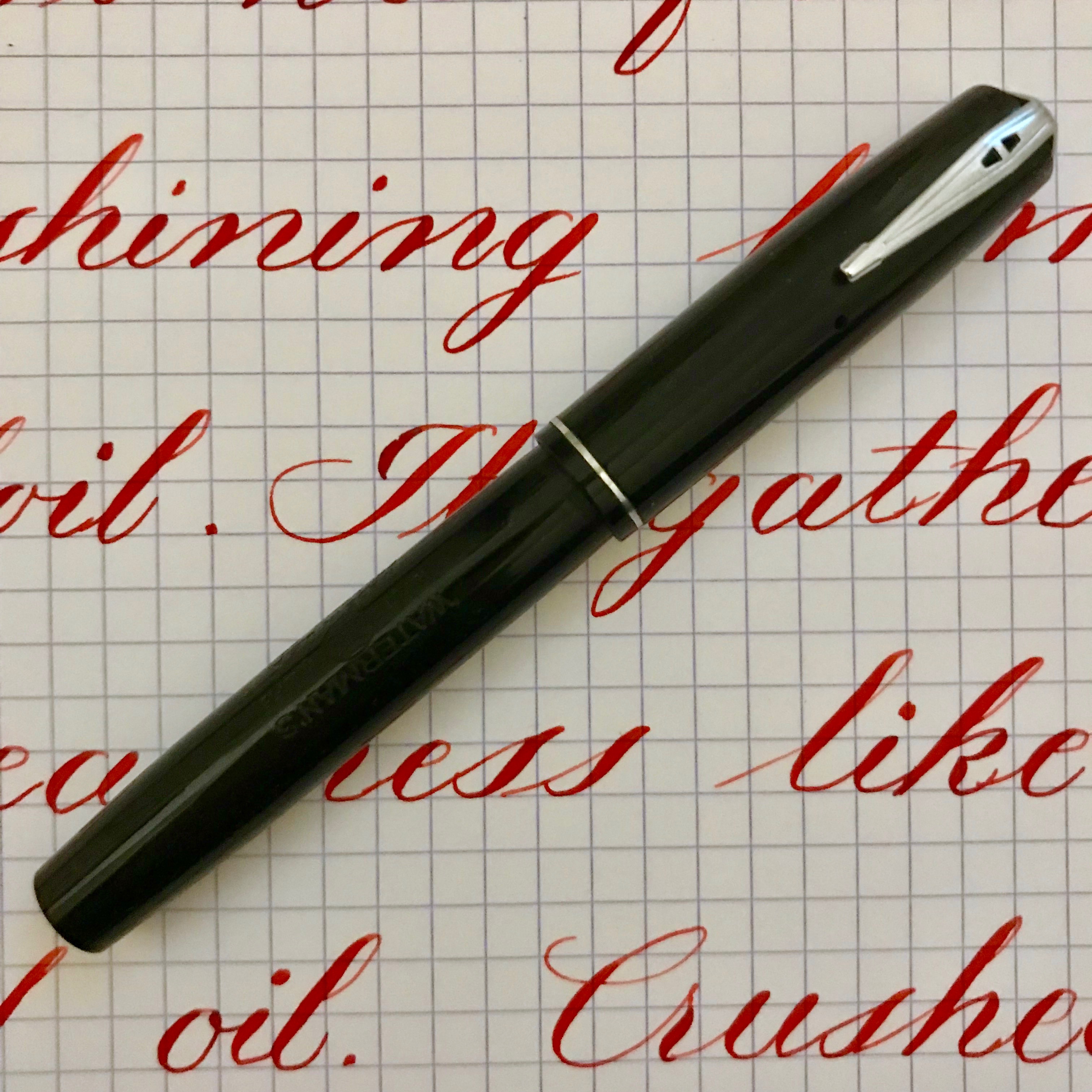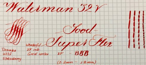 Here is a nice Waterman 32V, the vest pen version of the 32. These are from the era where Waterman was transitioning away from hard rubber to modern plastics. The feeds and sections remain hard rubber but the body is s high quality plastic, which makes long term care much easier while maintains the benefits of ebonite feeds. The body is in good condition with only some light marks on the end of the barrel from posting and a few scratches on the barrel end. The chrome trim is great condition with no signs of plate loss. The 14kt. Waterman #2 nib is a great writing XF. It is beautifully smooth and perfect flow. Not too wet, not too dry. It also has some lovely flex. The flex has many traits of a “super flex” grade. It has great range going from XF (0.3mm) to BBB (1.8mm), with great flow, and some good responsiveness. It’s just a bit on the stiff side to be a “super flex,” thus the “good flex” grade. This size pen is great. Very portable but when it posts it feels like a full size pen. Plus, you get vintage Waterman writing and flex.