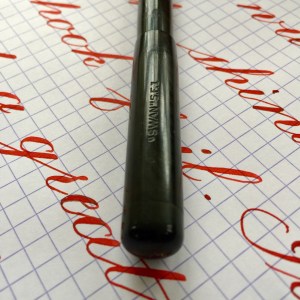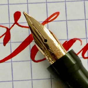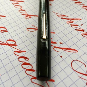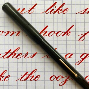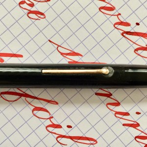 Here is a made in England Swan in a “self-filler” model (lever filler). The black hard rubber is still quite black with only slight fading. The chasing is worn though visible. Imprints are easily readable. The swan on the top of the cap is partly worn off. The gold-filled lever is in great condition with only very small spots of brassing on the edges. The 14tkt. Swan nib is a very soft and wet F. This is a near wet noodle or borderline wet noodle. It’s soft enough that normal writing pressure will cause the tines to spread slightly, so you have to use a light hand for writing. Flex on this nib comes very easily ranging from F to BBB+ (1.9mm)! I would have graded this a “wet noodle” except it’s not quite as responsive as most wet noodles. It’s really close to being a noodle though. Certainly, a very high “super flex.” A lot of people would call it a wet noodle. Anyway, it’s a great vintage flex pen for a great price.