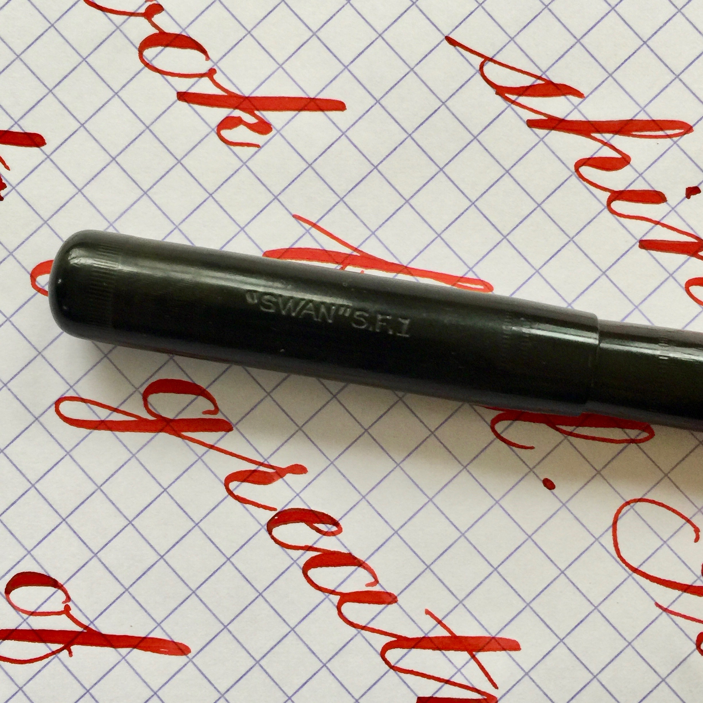 Here is a made in England Swan in a “self-filler” model (lever filler). The black hard rubber is still quite black with only slight fading. The chasing is worn though visible. Imprints are easily readable. The swan on the top of the cap is partly worn off. The gold-filled lever is in great condition with only very small spots of brassing on the edges. The 14tkt. Swan nib is a very soft and wet F. This is a near wet noodle or borderline wet noodle. It’s soft enough that normal writing pressure will cause the tines to spread slightly, so you have to use a light hand for writing. Flex on this nib comes very easily ranging from F to BBB+ (1.9mm)! I would have graded this a “wet noodle” except it’s not quite as responsive as most wet noodles. It’s really close to being a noodle though. Certainly, a very high “super flex.” A lot of people would call it a wet noodle. Anyway, it’s a great vintage flex pen for a great price.