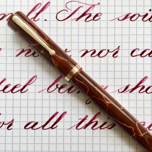 Here is a Waterman 94 in the gorgeous Mahogany body. Pictures never fully do justice to this color. This looks and feels posh. The body has normal light marks from use, but nothing big and most I could polish out. The gold-filled trim is in good condition overall. There is some tiny spots of grassing on the edges of the lever and clip. Imprints look good. The black hard rubber section has faded to a dark brown. This pen comes with a 14kt. Waterman #4 “Keyhole” nib. The nib writes wonderfully as a wet and beautifully smooth F/M. It really feels like a stubbish Medium. It really brings on the shading. While normal writing is where this nib really shines, it does have some flex ranging up to BB (1.5mm). While flex comes rather easily, it lacks some of the range and responsiveness of better flex nibs. That doesn’t mean this is a lesser nib, because it excels at normal writing. But I would only grade it as a “medium flex.” If you are looking for a great writing vintage pen with some flex, you can’t go wrong with this beauty.