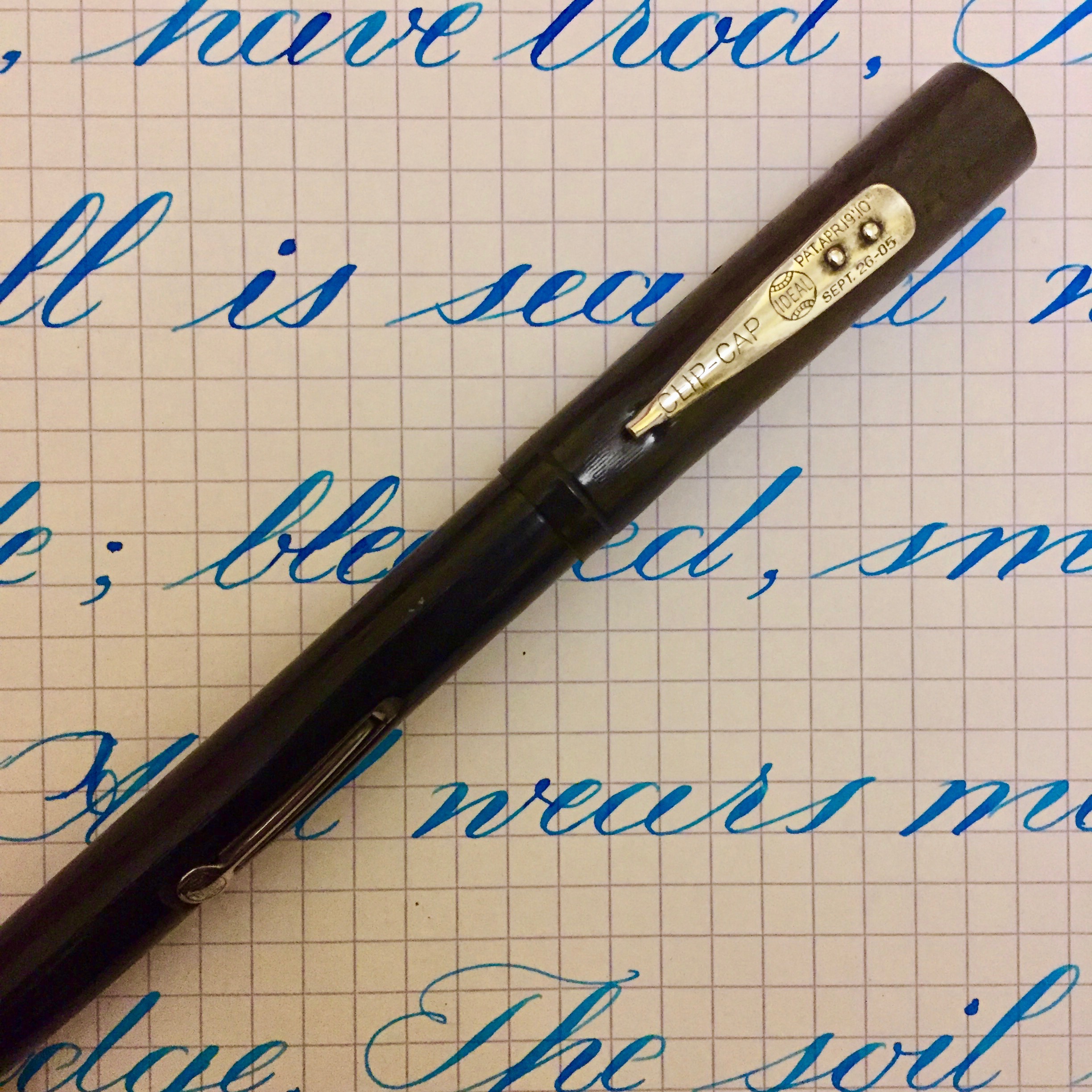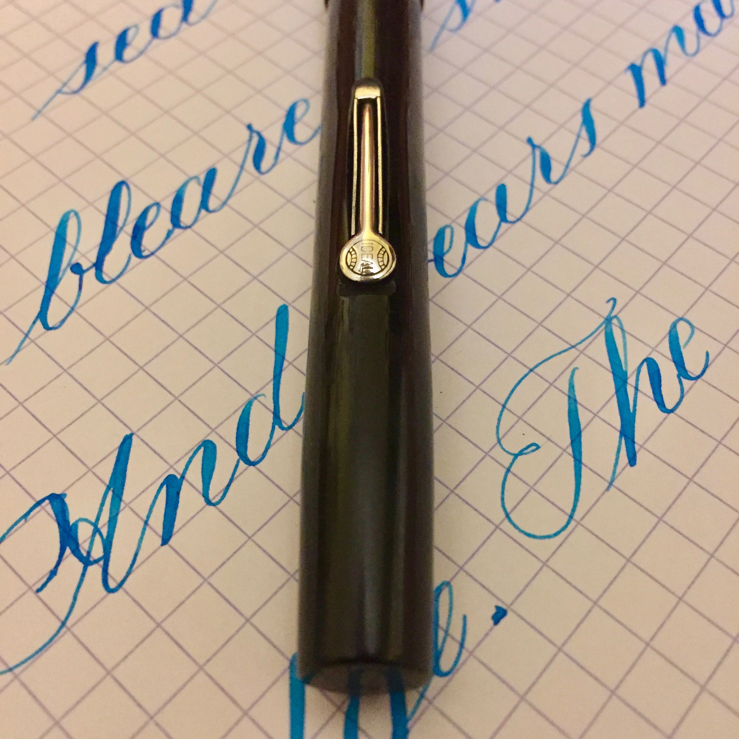 This Waterman 54 comes in BCHR. The 54 is about the same length as the 52 only slightly larger in diameter and of course having the larger #4 nib. The hard rubber barrel is still pretty black, though the cap has faded a bit more to a dark brown. Imprints are still good and crisp. The chasing is worn some but still visible with some texture left. The nickel-filled trim is in overall good condition. There is very little wear to lever. The clip looks pretty good as well but lost the original ball at the bottom. The 14kt. Waterman #4 nib is a lovely. For normally writing, it is superb. It has excellent flow with a soft buttery feel. A pure joy to use, and well worth purchasing just for that. Additionally it has has flex that comes easily with good responsiveness and nice range. From XF (0.3mm) it can swell up to BBB (1.6mm). The feed however lags a little behind at times causing some railroading, and it is for for that reason alone that I graded this as a “good flex.” This is another superb Waterman nib on vintage BCHR 54.