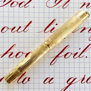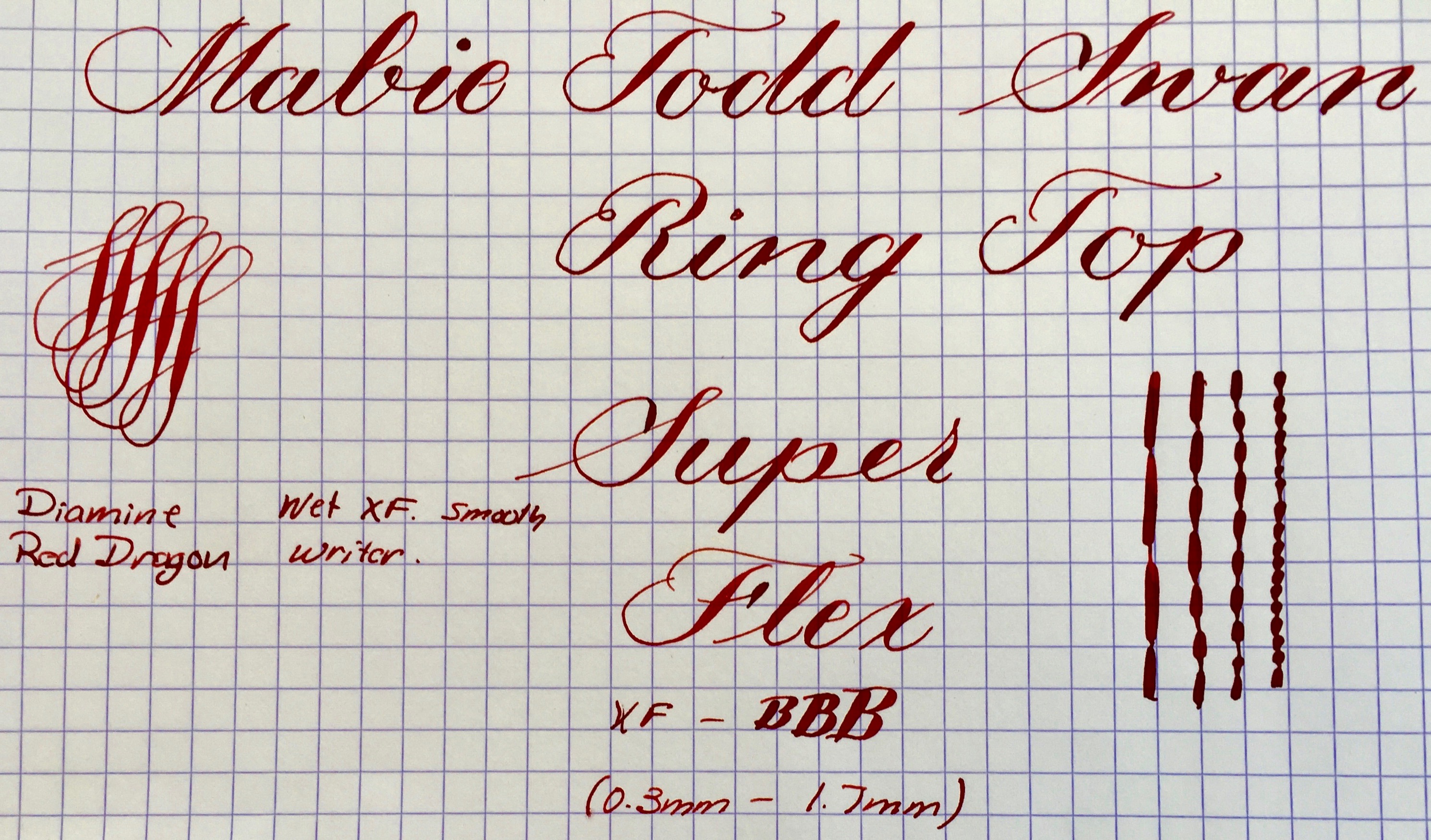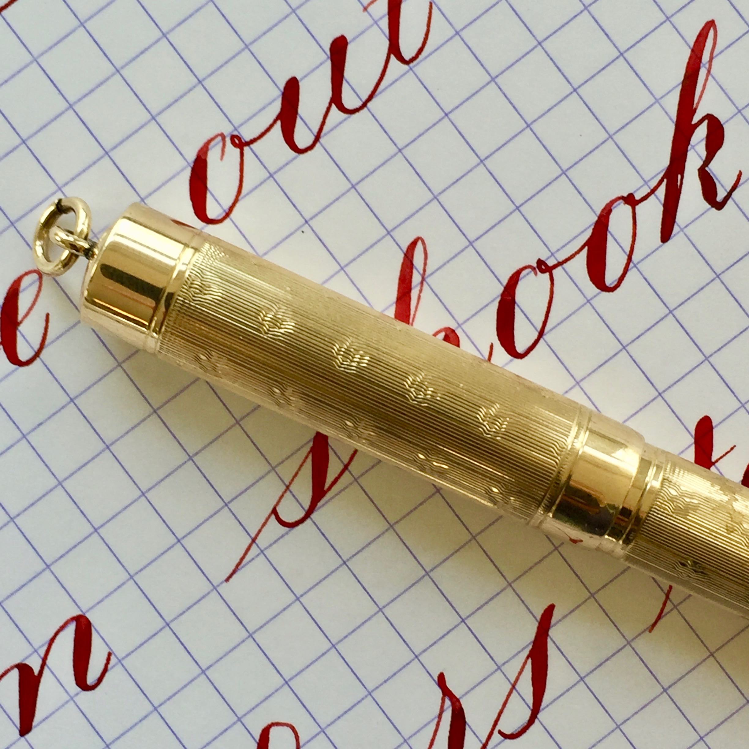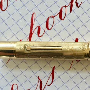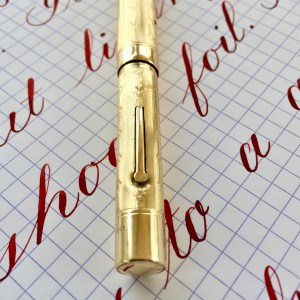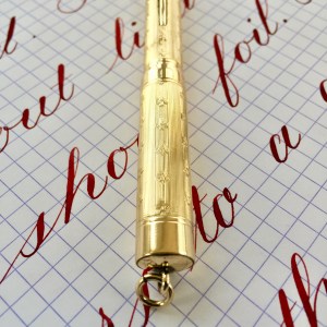 Here is a gorgeous made in New York Mabie Todd Swan gold-filled ring top. The chasing on this pen is in great condition as is the gold-filled body in general. There is no brassing throughout the pen and only minor wear from light use. No personalizations on the barrel. And I see no dings, which is pretty rare on these gold-filled bodies. The 14kt. Mabie Todd Swan #2 nib is a lovely, smooth writing, XF on the wet side. It’s kind of unusual to have a nib write this wet and still stay within a 0.3mm line, but this nib manages it. If you like wet nibs but also fine nibs, here is the perfect marriage for you. The pen also boasts a very nice flex ranging up BBB (1.7mm). Responsiveness is very good. It’s overall a good, solid “super flex.” This is a great, portable, durable vintage flex pen in superb condition.