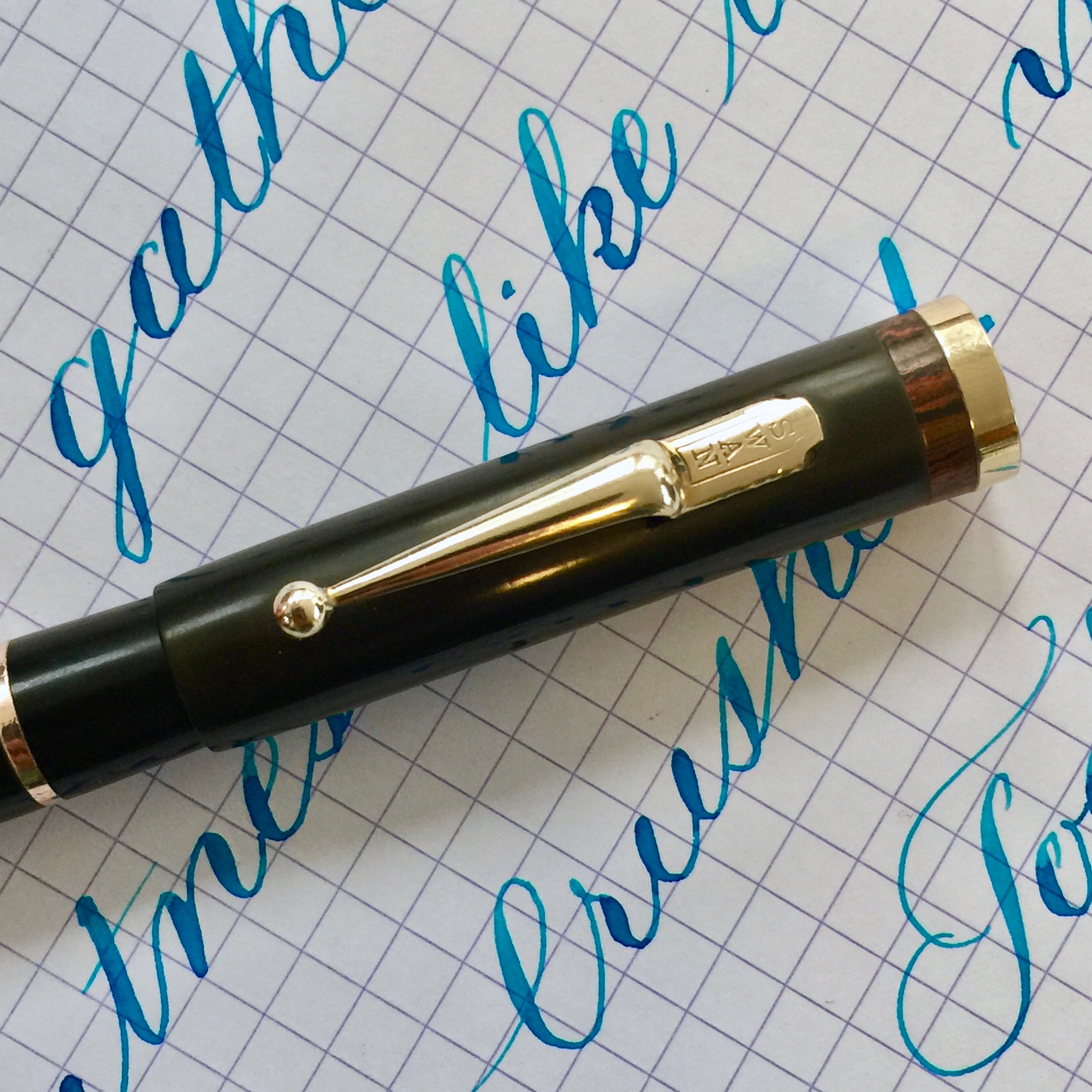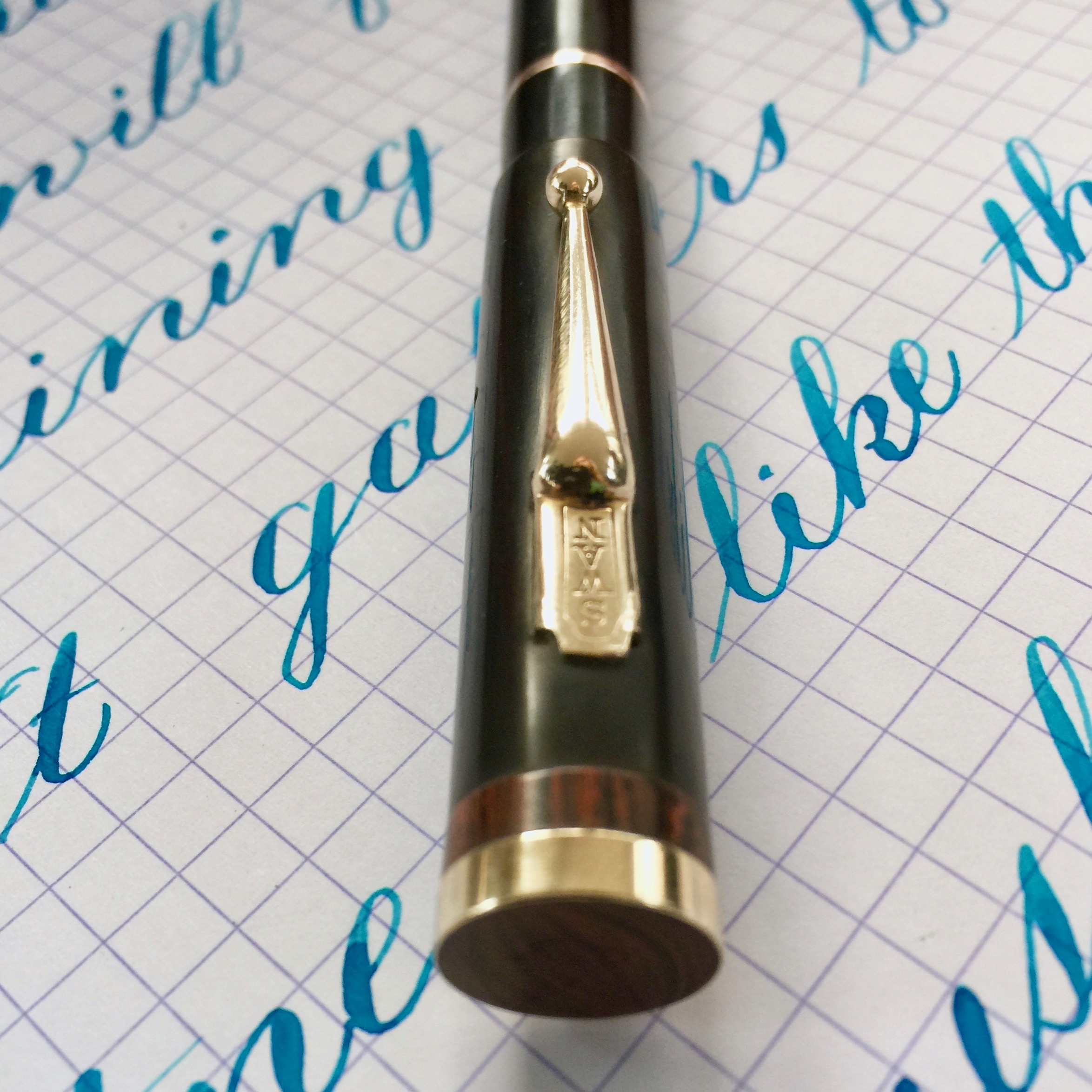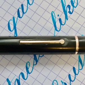 Here is a made in England Mabie Todd Swan Self-Filler in smooth (no original chasing) black hard rubber with a red-rippled hard rubber “crown” on the cap. This pen is nearly identical in size to a Waterman 52. The hard rubber has faded some to a blackish brown. The imprints are faded without a lot of texture, but they are mostly readable in good light. The gold-filled trim on the cap is in good condition with little if any brassing. There is some brassing on the bands of the body and on the edges of the lever. The 14kt. Swan #2 is a wonderful writing XF that has good flow without being a gusher. The nib feels soft and elegant. It also has some very nice flex ranging up to BBBB (1.8mm), though I usually keep it around 1.6mm. Responsiveness is also quite good and springy.