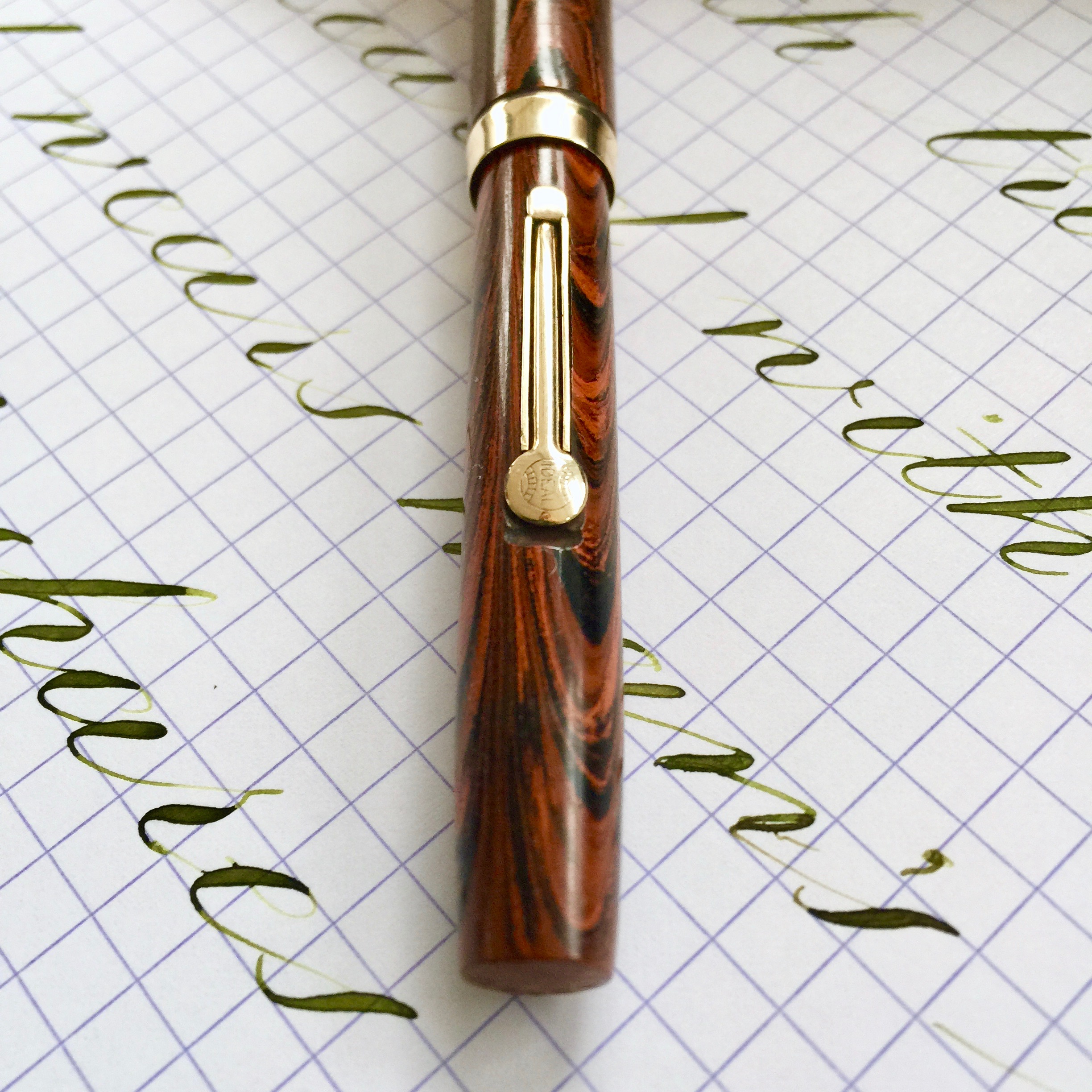 Here is a 52 1/2 V in Waterman’s lovely Red Ripple hard rubber. The red ripple hard rubber is only slightly faded and still has a lot of good color to it. The imprints on this are very crisp. Almost new looking. The gold-filled trim looks beautiful as well. There is one tiny tiny little dent on the lever box, but otherwise it’s about as good as you could wish for. No brassing whatsoever. The 14kt. Waterman #2 nib is rare one. It’s a XXXF (0.1mm!). With a light ink it’s almost illegible it’s so fine. But that also means this is a great nib for hairlines! The flex range on this isn’t massive only going up to 1.2mm, but with an XXXF starting point it hardly needs any swell to do some nice flex work. I graded it somewhere between a good and super flex mainly because it doesn’t have very large swells, but the flex comes easily enough and that XXXF tip makes is very responsive. It’s pretty smooth for so fine a nib. It’s a very unique find and will make someone very happy.