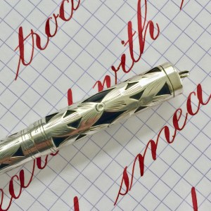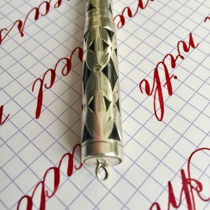 Here is a lovely Waterman 452 1/2 V with the sterling silver filigree overlay. The overlay is in good condition with only light scratching from use, but nothing very obvious. There is one tiny ding on the end of barrel. The black hard rubber underneath the overlay is still quite dark with minimal fading. The lever is in good condition but it does stick out just a bit from the body when closed (see pic). Likely the internal bar is bent a bit keeping it from closing flush. The 14kt. Waterman #2 is a wet writing XF that is smooth with only a hint of feedback. I would say smoother than my XF Aurora nib or Platinum nib. The flex is also nice going up to BB (1.4mm). Flex comes fairly easily, but the range isn’t huge maxing out at 1.4mm. Or maxing out safely anyway. Responsiveness is decent. I’ve graded it somewhere between a good “good flex” and a low end “super flex.”