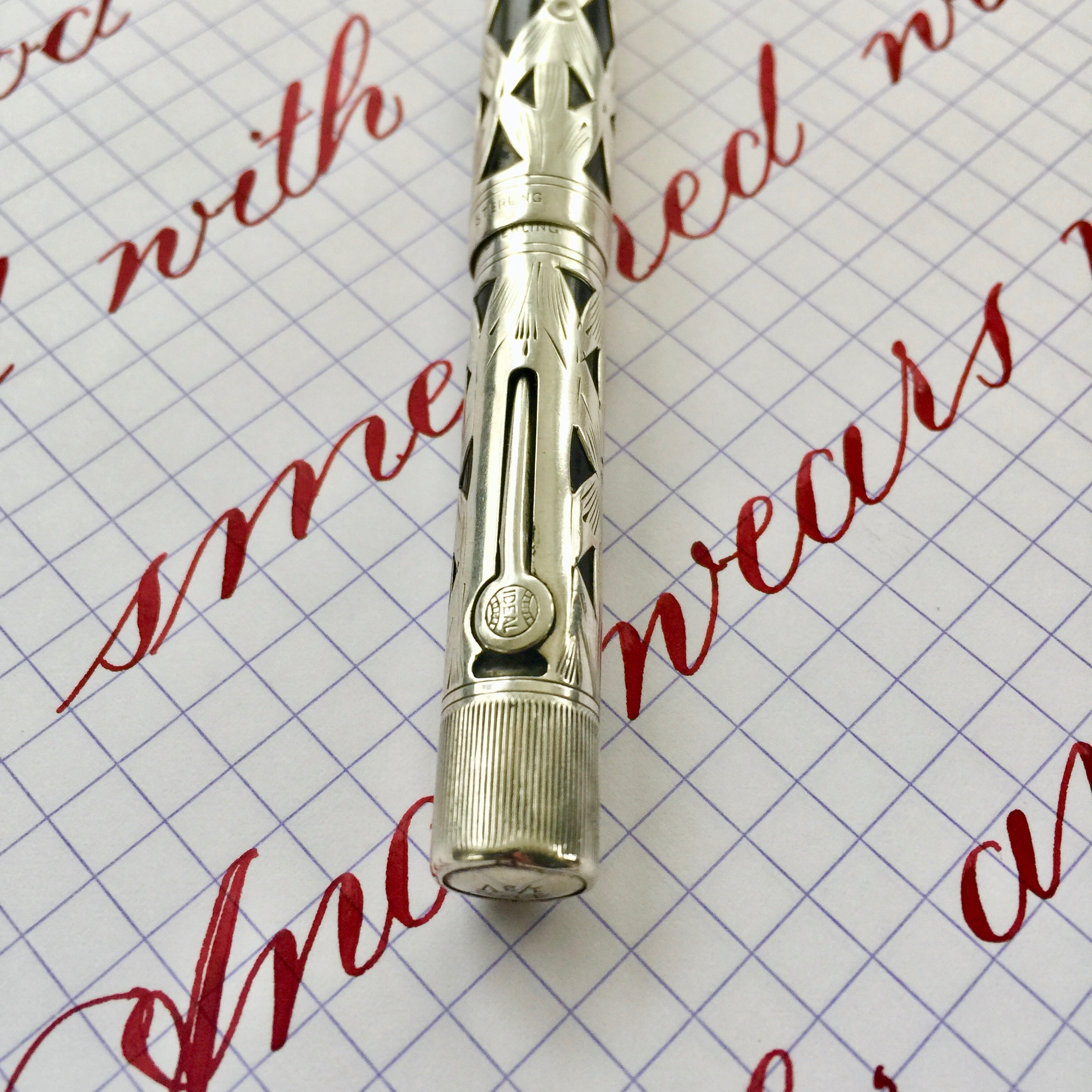 Here is a lovely Waterman 452 1/2 V with the sterling silver filigree overlay. The overlay is in good condition with only light scratching from use, but nothing very obvious. There is one tiny ding on the end of barrel. The black hard rubber underneath the overlay is still quite dark with minimal fading. The lever is in good condition but it does stick out just a bit from the body when closed (see pic). Likely the internal bar is bent a bit keeping it from closing flush. The 14kt. Waterman #2 is a wet writing XF that is smooth with only a hint of feedback. I would say smoother than my XF Aurora nib or Platinum nib. The flex is also nice going up to BB (1.4mm). Flex comes fairly easily, but the range isn’t huge maxing out at 1.4mm. Or maxing out safely anyway. Responsiveness is decent. I’ve graded it somewhere between a good “good flex” and a low end “super flex.”