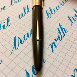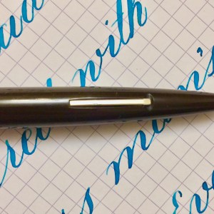 Here is a nice Skyline in the army brown body with a gold-filled cap.The body has only surface marks from normal use for the most part. There are some small deeper scratches on the derby (see pics). There are just a few tiny marks on the gold-filled cap sleeve but nothing major or obvious. There is no brassing on it or the clip. There is a little bit of plate loss on the crown of the lever from the cap being posted. The 14kt. Eversharp nib is a wonderful Fine. It writes a lovely wet and smooth line that just feels like a what a nib should fee like. The flex on this is also wonderful going easily to BBB (1.7mm) with plenty of ink flow to keep up. The responsiveness is also really solid. Overall, a superb Skyline.
