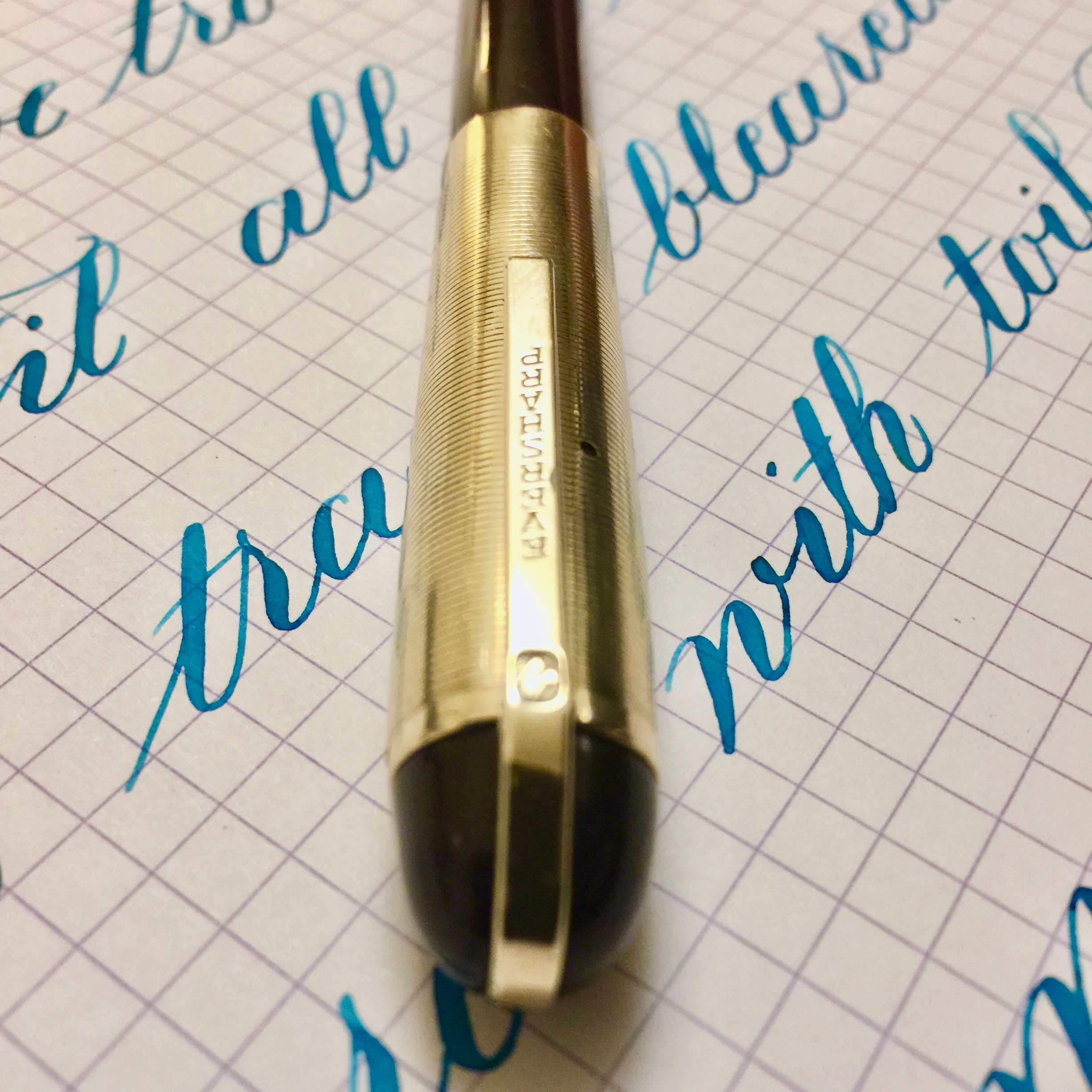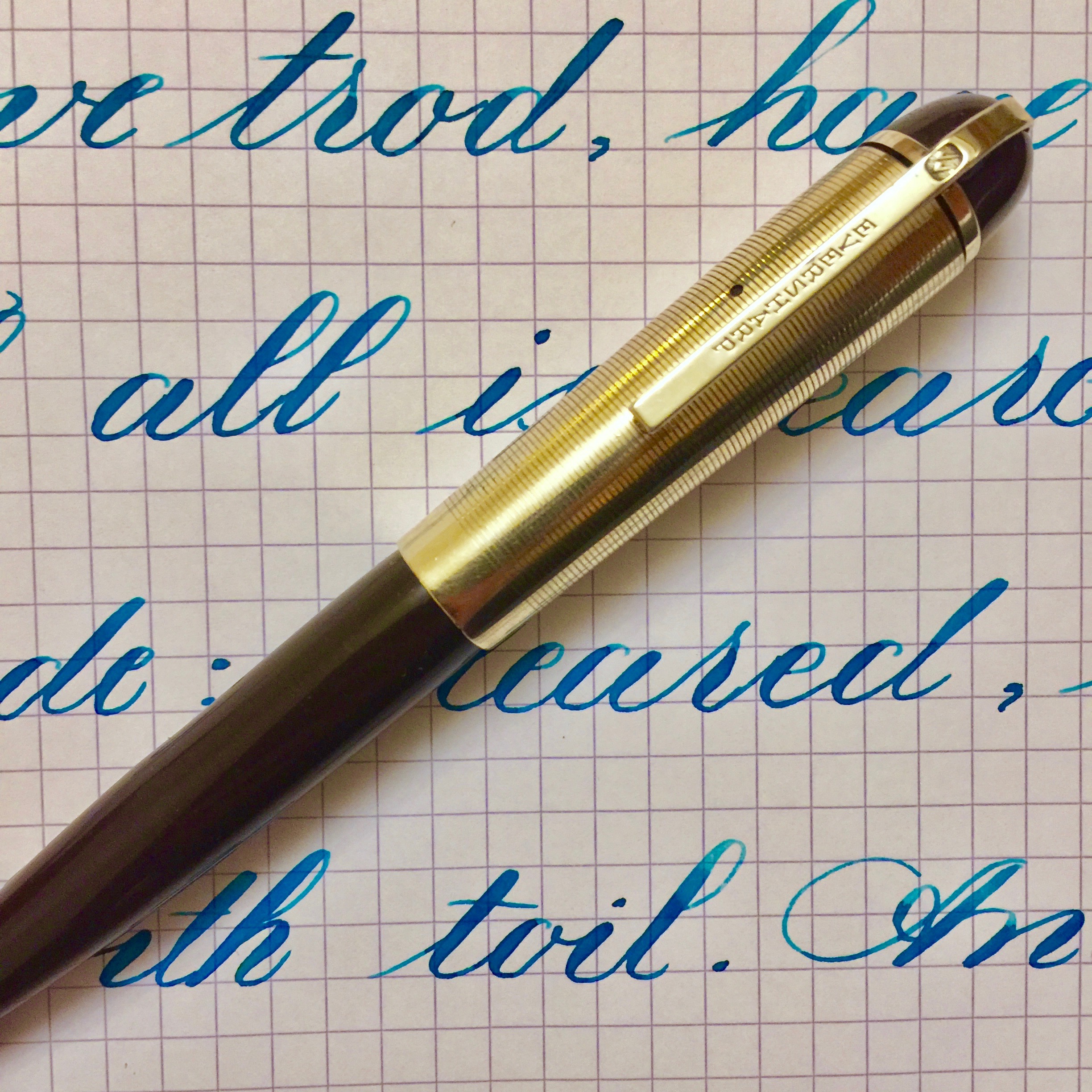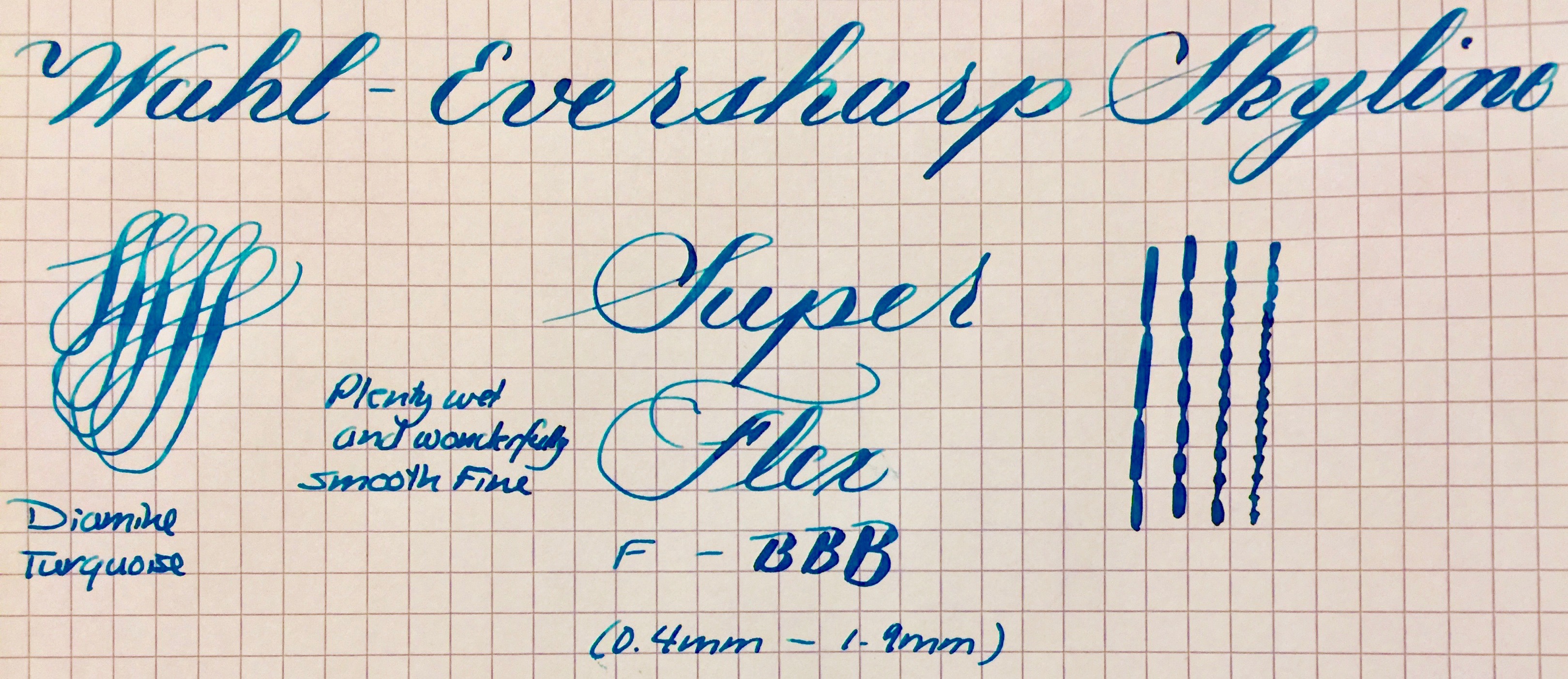 Here is a nice Skyline in the army brown body with a gold-filled cap.The body has only surface marks from normal use for the most part. There are some small deeper scratches on the derby (see pics). There are just a few tiny marks on the gold-filled cap sleeve but nothing major or obvious. There is no brassing on it or the clip. There is a little bit of plate loss on the crown of the lever from the cap being posted. The 14kt. Eversharp nib is a wonderful Fine. It writes a lovely wet and smooth line that just feels like a what a nib should fee like. The flex on this is also wonderful going easily to BBB (1.7mm) with plenty of ink flow to keep up. The responsiveness is also really solid. Overall, a superb Skyline.