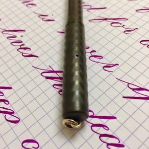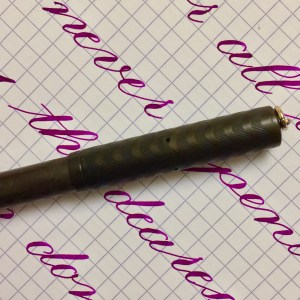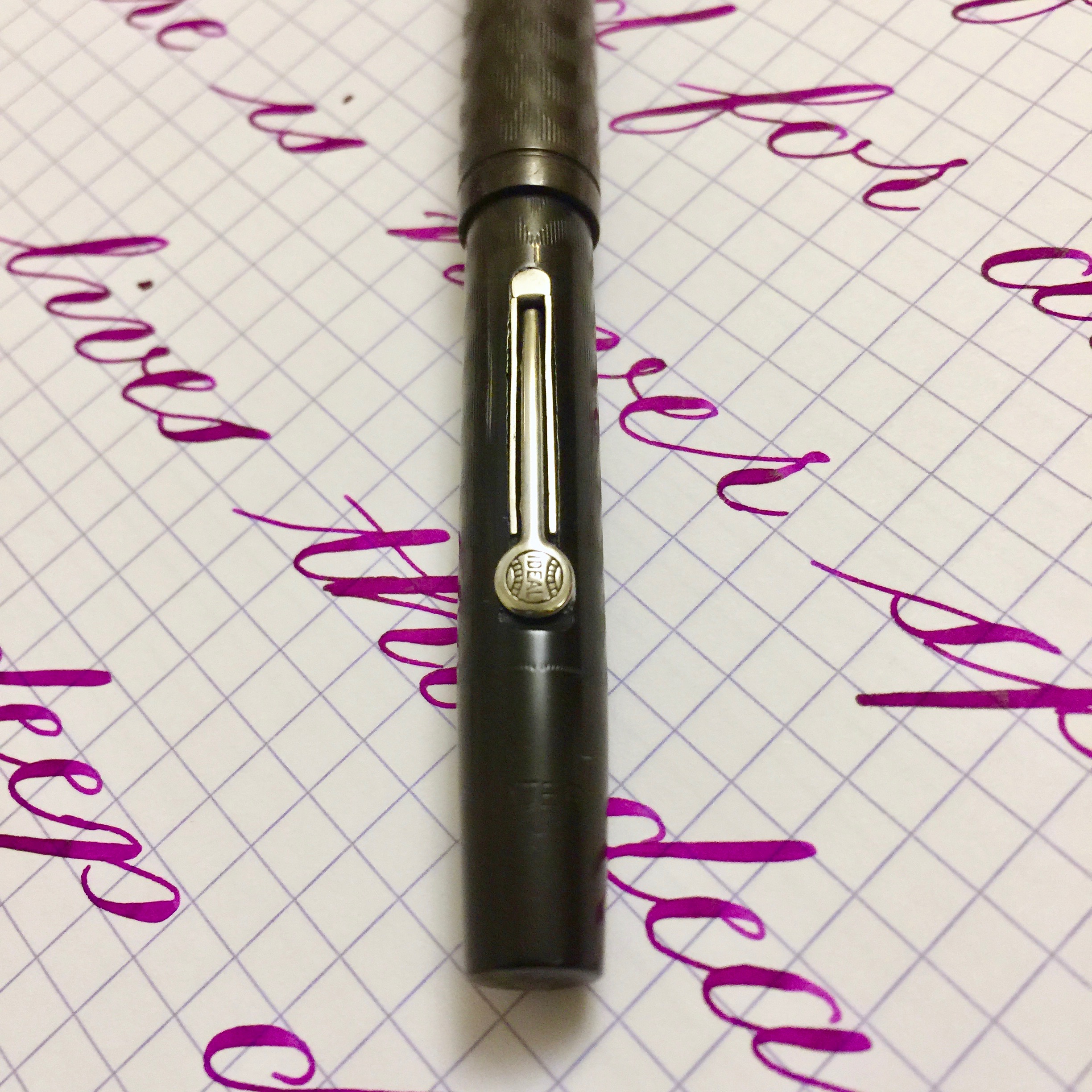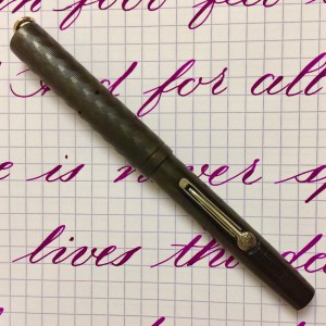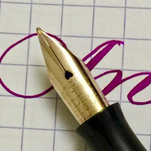 This Waterman 52 1/2V has some fading in the BCHR. The chasing still looks pretty good with decent texture but it has faded to a dark brown. The imprints look good. The nickel trim is in good condition with no brassing. The 14kt. Waterman #2 is a wet writing F (0.4mm) with just a hint of feedback, though it’s still quite smooth. It has some really nice flex going easily up to BBB (1.6mm). The nib does have two very small cracks coming out of each of the breather hole. If you take good care of this nib and don’t over flex, the cracks should not grow. I’ve personally had a wet noodle nib with two cracks in the same places for over 6 years that I use everyday, and there has been no growth in them. If you are looking for a nice vintage flex nib for an affordable price, here is your chance.