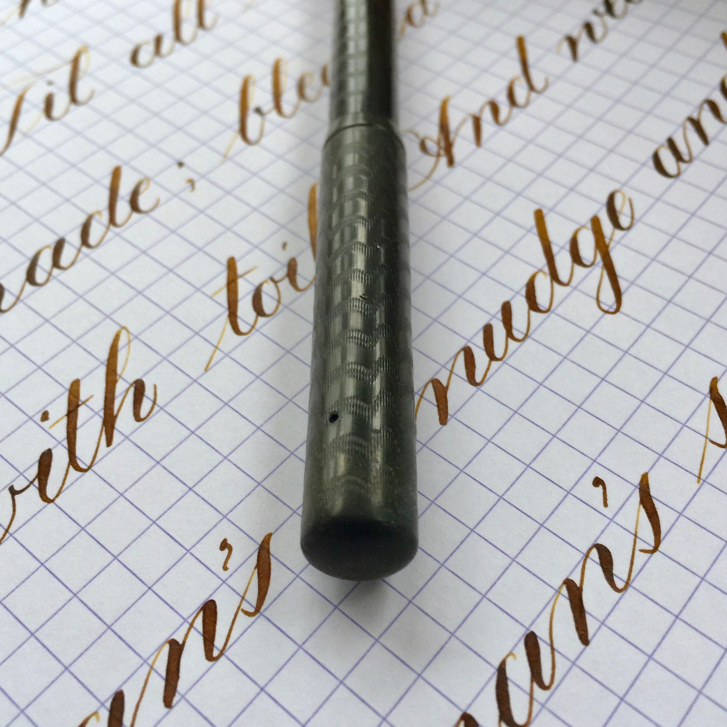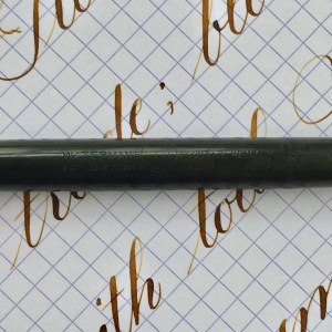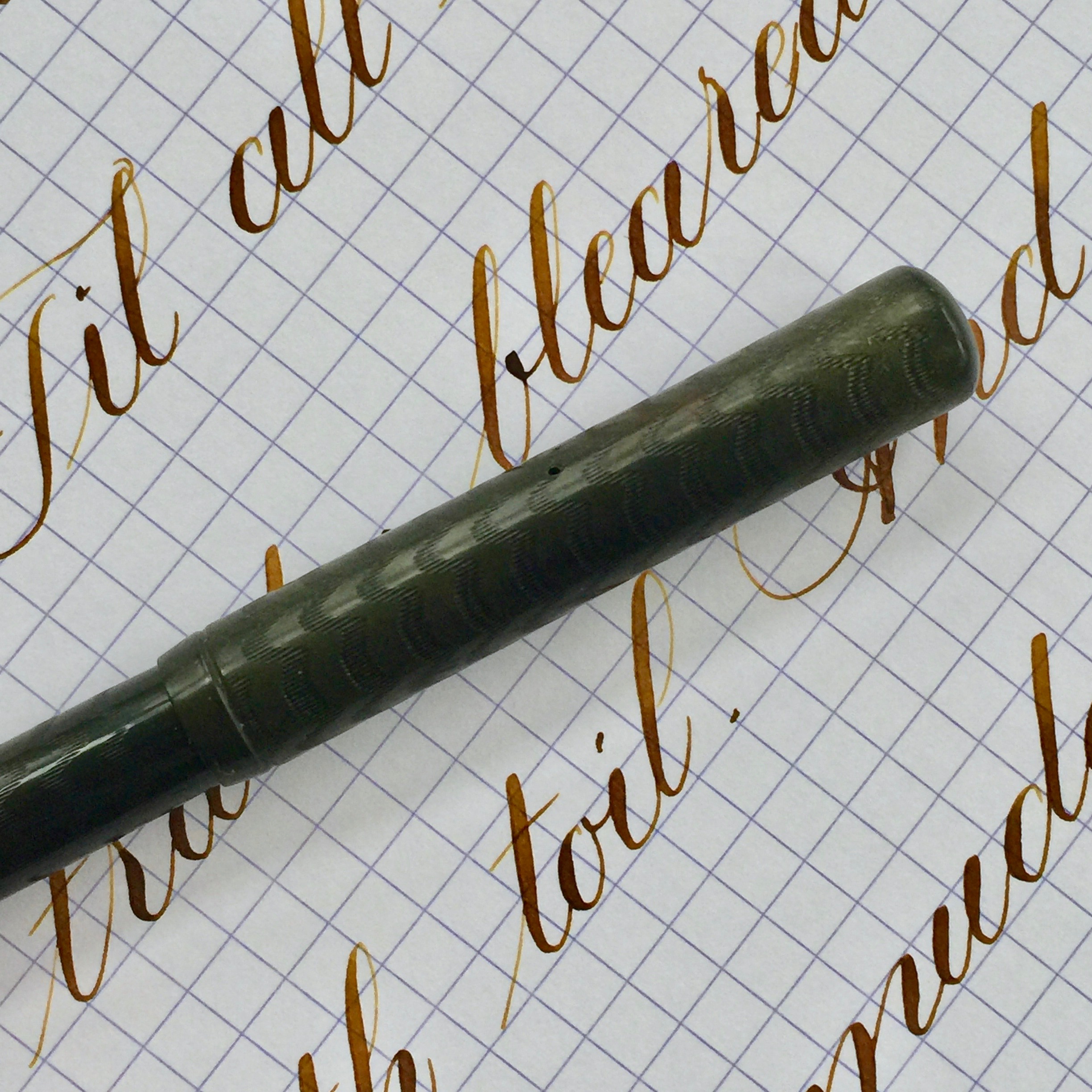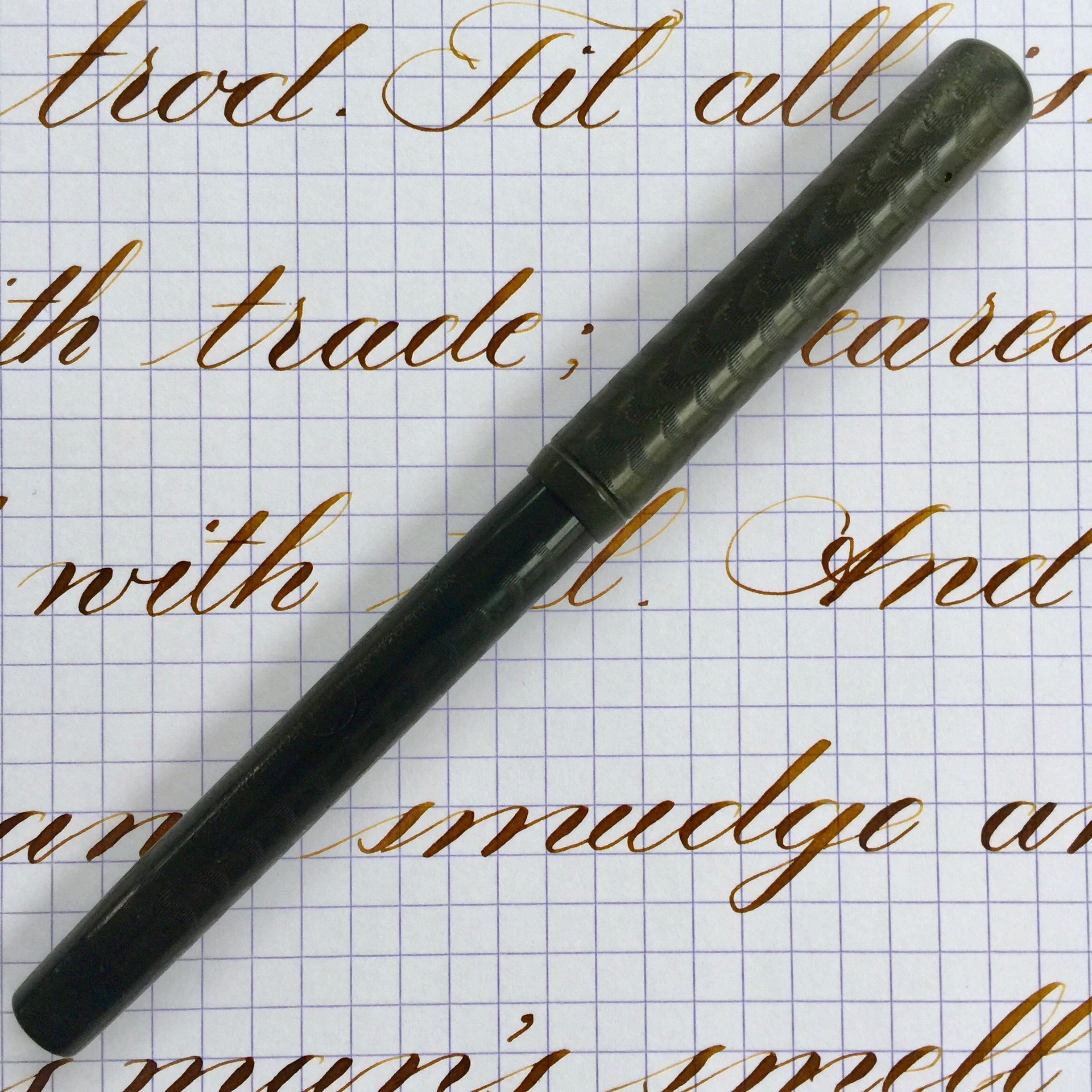 Here is a Waterman 12 in BCHR. Next to the 52, there is probably no other pen that best embodies what a vintage Waterman offers. The BCHR on this pen is faded some to a dark brown. The chasing is still very nice and crisp throughout the pen. Imprints are also fantastic. There are some very, very light teeth marks on the top of the cap and end of the barrel. You wouldn’t see them unless you look closely. There is also a very small chip in the end of the barrel. The 14kt. Waterman #2 is the kind of wonderful nib that Waterman is known for. It’s a lovely writing XF that feels more like an XXF than a F. It’s pretty smooth for how fine it is. It also has some easy flex that ranges up to BBB (1.6mm) with some nice snap back. It’s a hundred plus year Waterman eyedropper with a super flex nib in good condition.