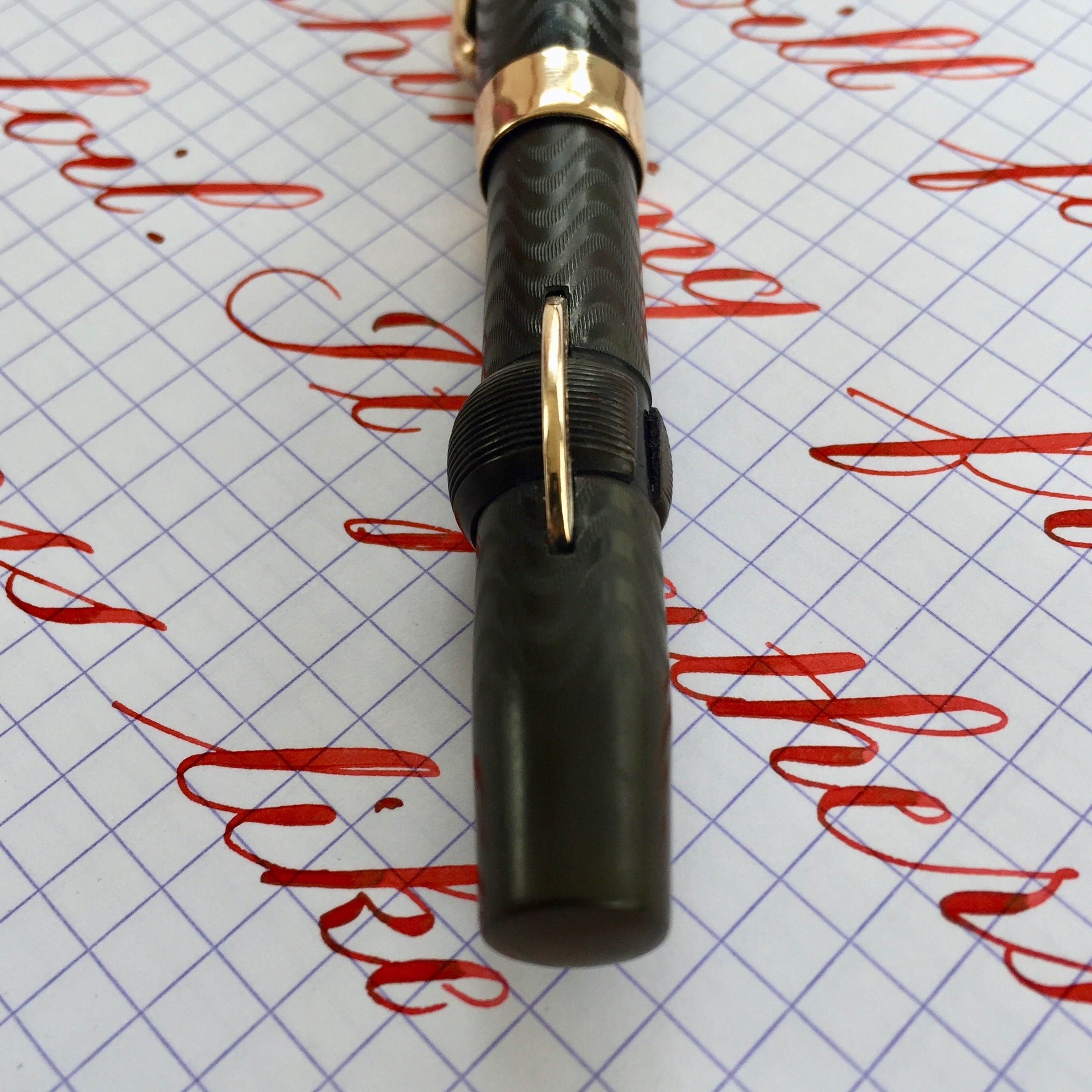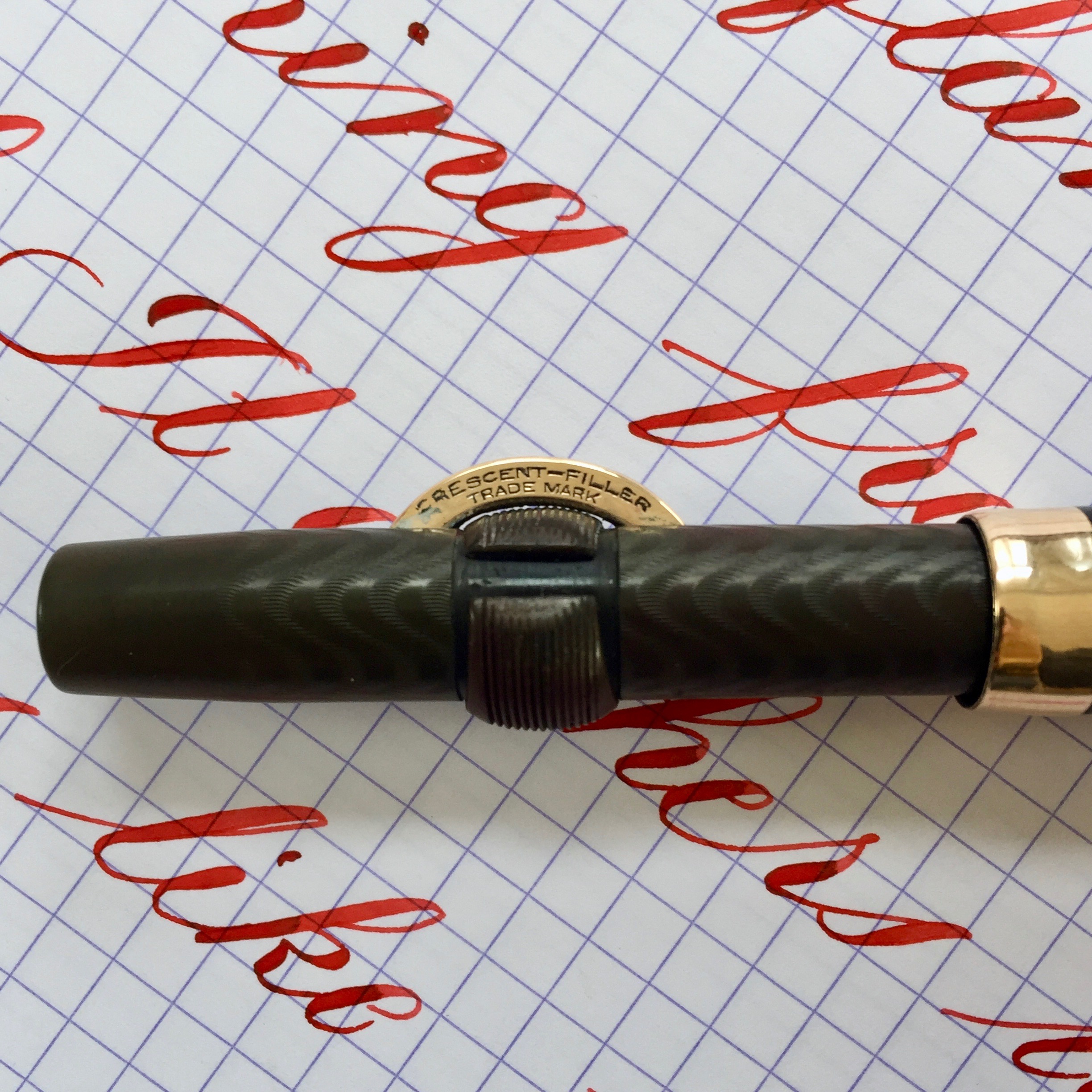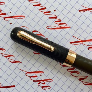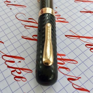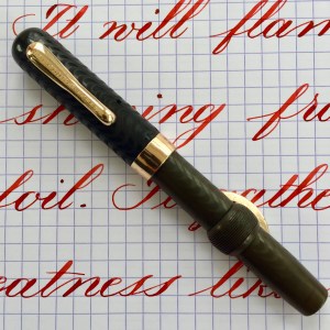 Here is a great vest size Conklin Crescent in BCHR. The hard rubber is still quite black on the cap but has faded dark grayish brown on the barrel. The chasing is still pretty decent throughout (especially on the cap) with texture remaining. The imprints are a little faded but still readable. The gold-filled trim looks great with no brassing. The made in Toledo 14kt. Conklin #2 is a beauty. It writes as a very wet F (0.4mm), but is superbly smooth with just a hint of “stubbishness.” It also has some nice flex ranging up to BB (1.6mm) quite easily with good responsiveness and nice flow. It’s just a great all around vintage flex nib.