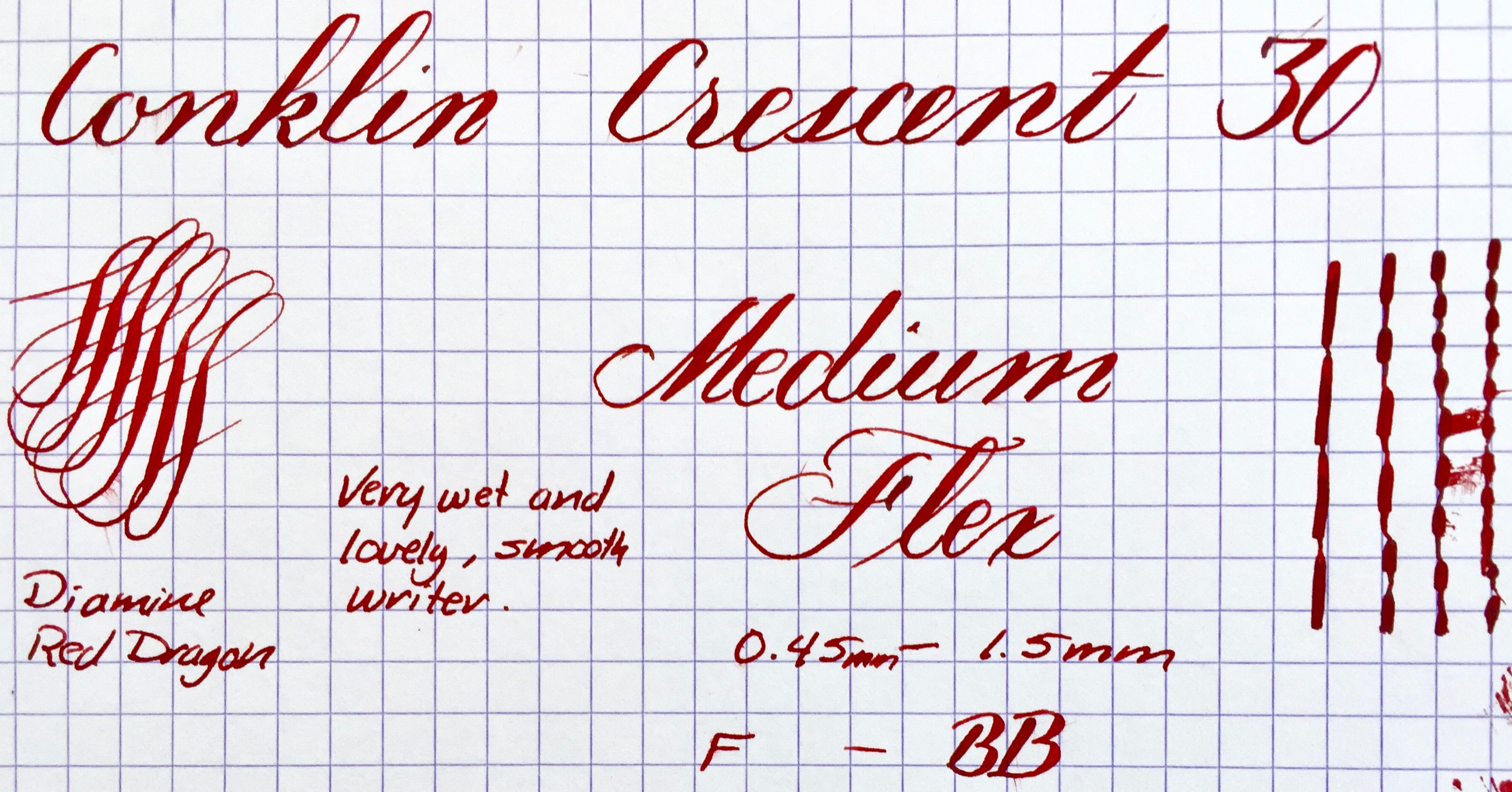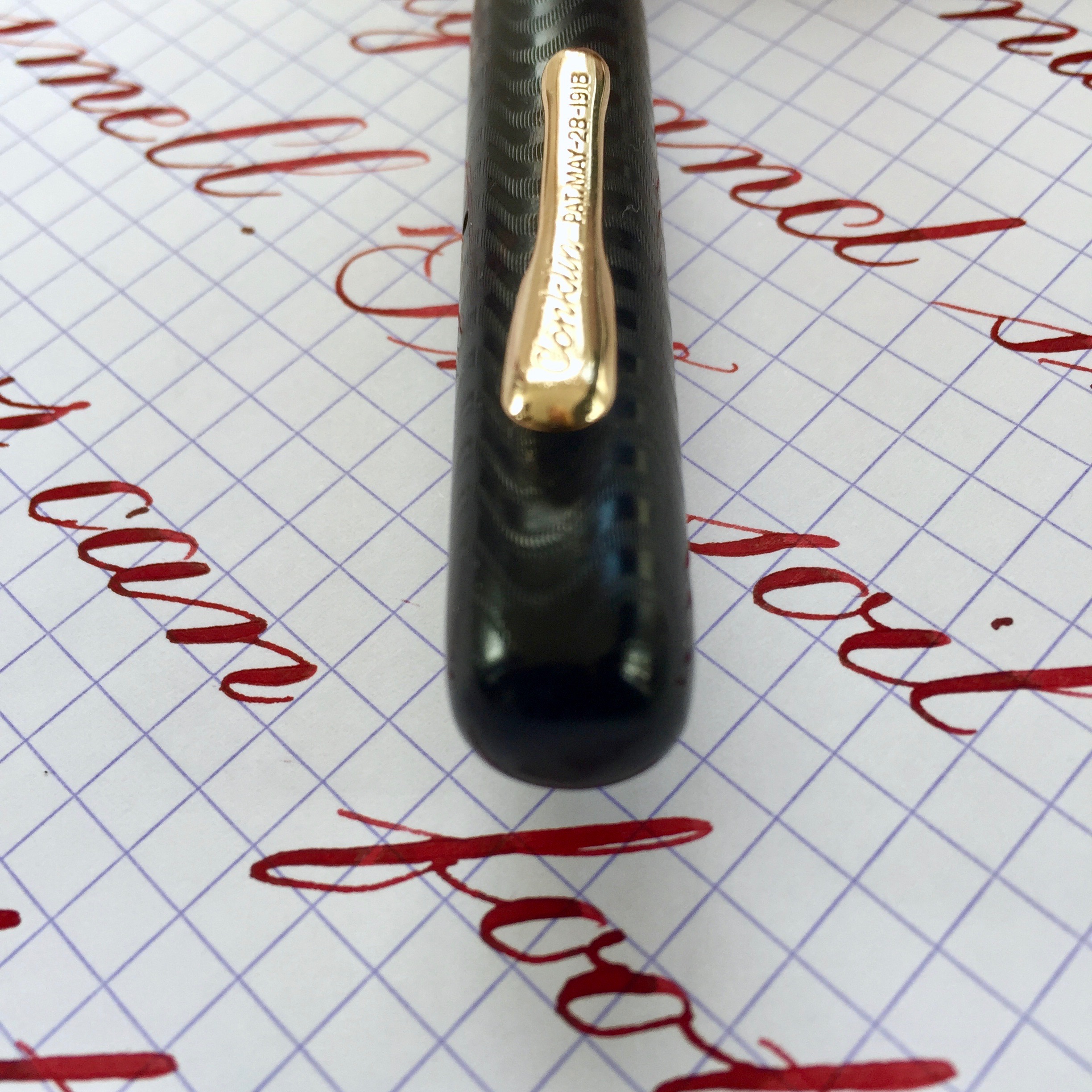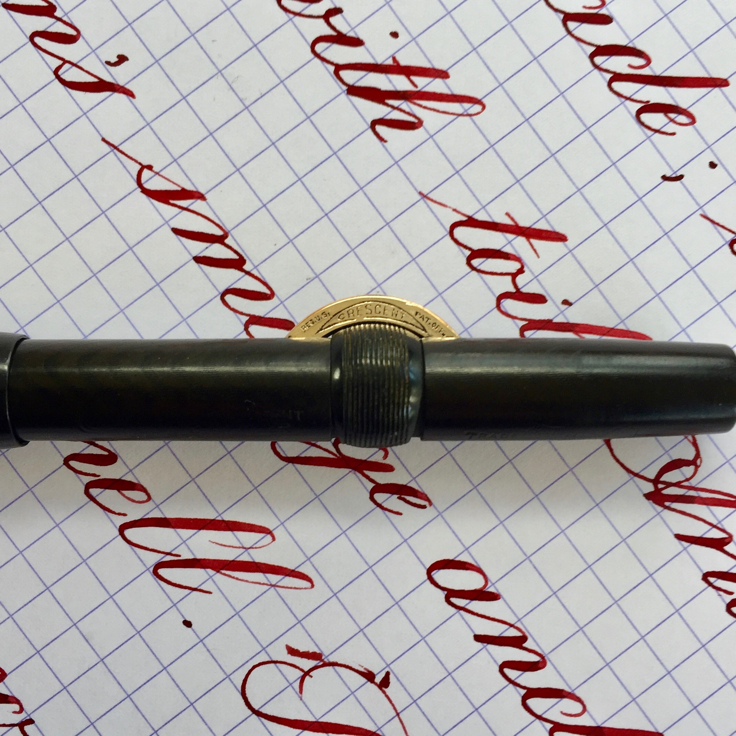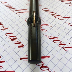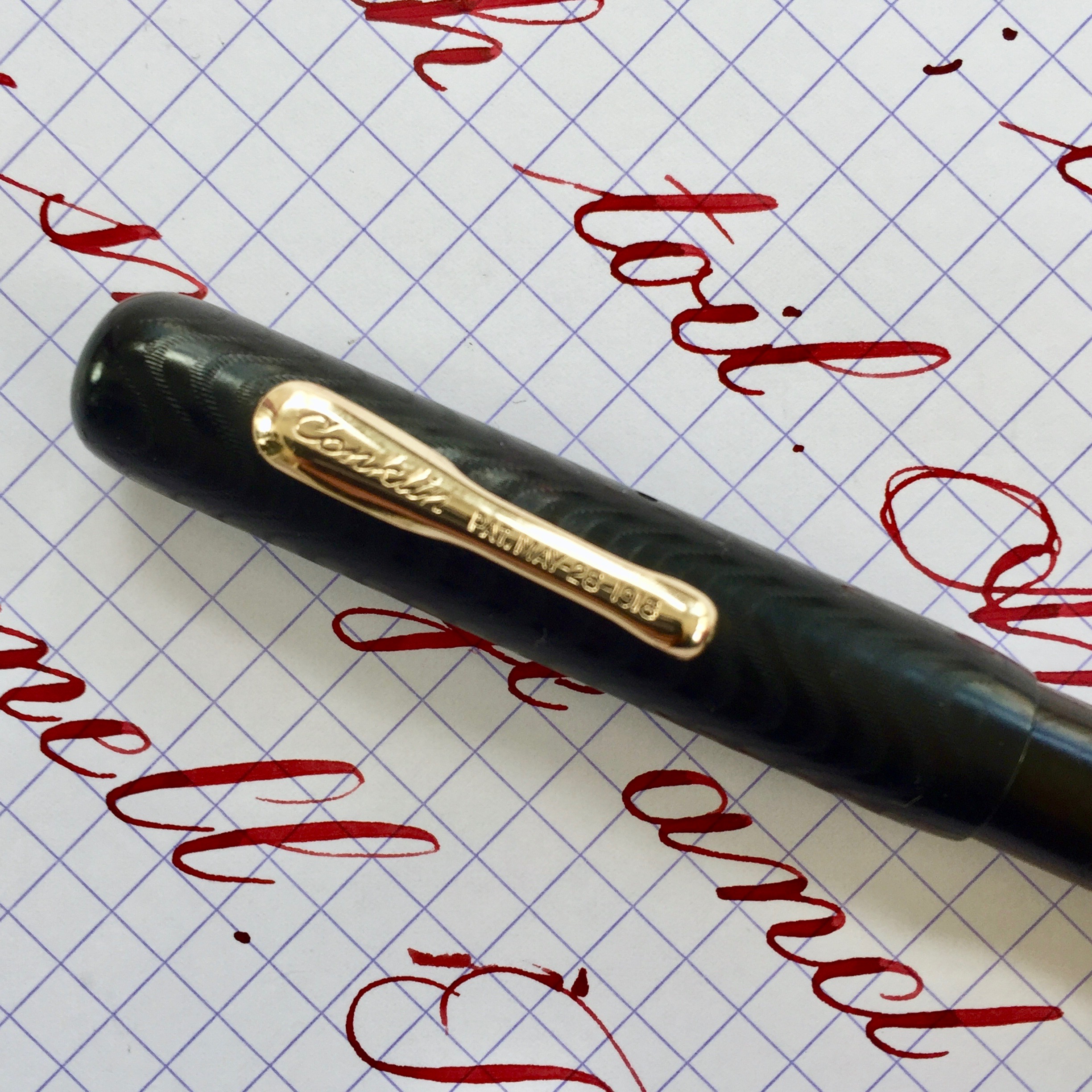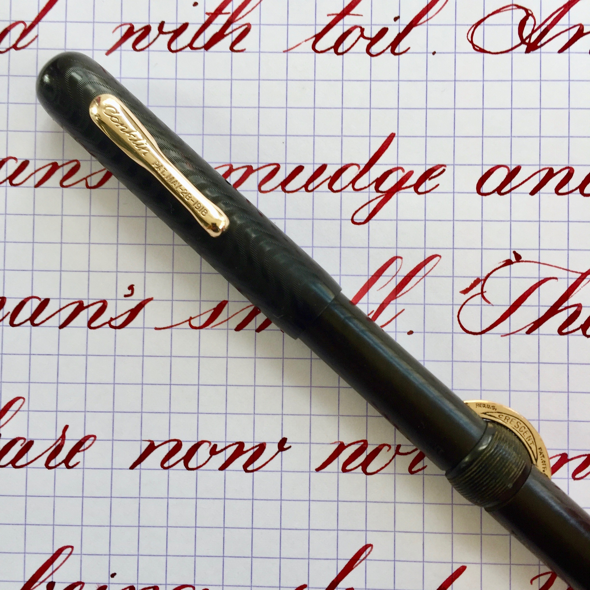 Here is a hundred year old Conklin Crescent size 30 in BCHR. The hard rubber is a dark brown. Chasing is visible but smooth on the body, but still has decent texture on the cap. The gold-filled clip and crescent still look great with no brassing. The imprints are worn, almost smooth in spots, but mostly readable. The made in Toledo 14kt. Conklin #3 nib is a very wet and smooth F (0.45mm). The flex on this nib has decent range going up to BB (1.5mm) and lays down plenty of ink. But the nib does lack some the ease of flex and especially the responsiveness of a higher grade flex nib. Thus, the “medium flex” grade. Still, a beautiful vintage Crescent with a buttery nib.