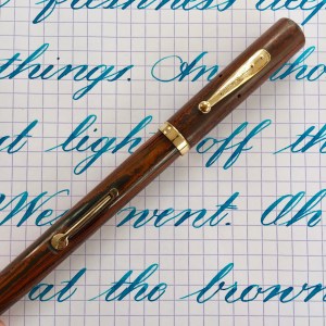 Here is a nice Waterman 52 in red mottled or “wood grain” hard rubber. The color of the hard rubber is pretty good with some fading. The imprints are still decent. The side barrel imprint is a little worn but readable. The rest are very good. The gold-filled cap band does have some brassing on the top edge as does the ball on the clip. The lever looks very good. The cap of this pen, though matching and threading well, is likely not the original as it is just a 1mm or so short of the original, as can be seen by the slight fade line. Still, you would not notice unless you looked close. The 14kt. Waterman #2 is a wet and buttery smooth F. A phenomenal writer if you like wet nibs. The flex on this was a little difficult to grade. The range is great going from F (0.4mm) to BBB (1.7mm) and responsiveness is also very good for so wet a nib, but ease of flex is decent but not amazing. Still, I deemed it good enough to grade as a “super flex” but it is on the lower end. Overall, a fantastic writer with some nice flex in a beautiful Waterman model.