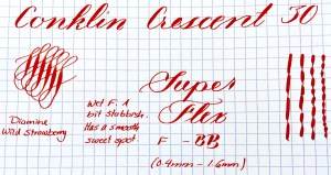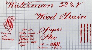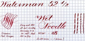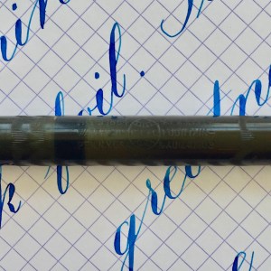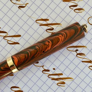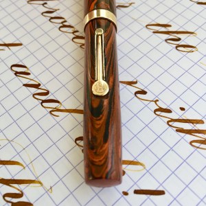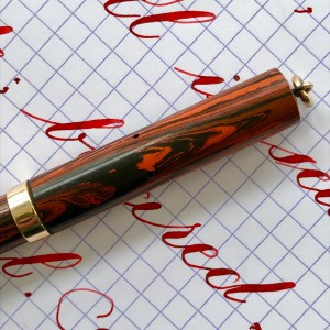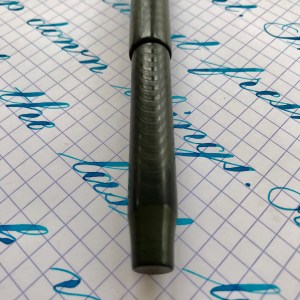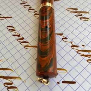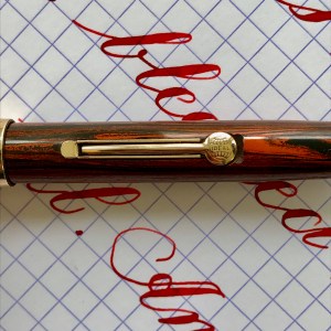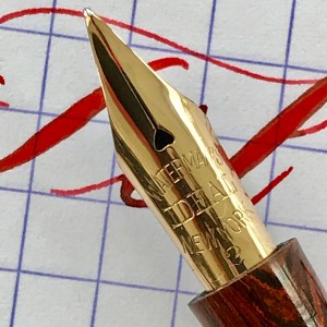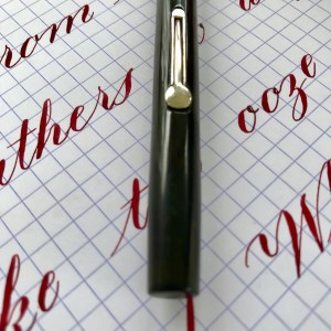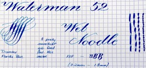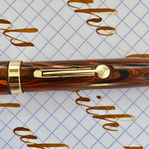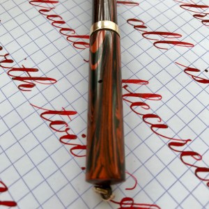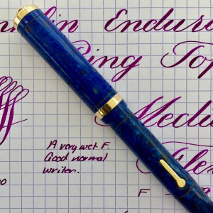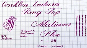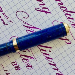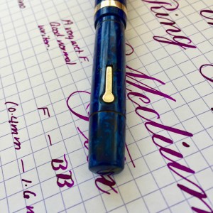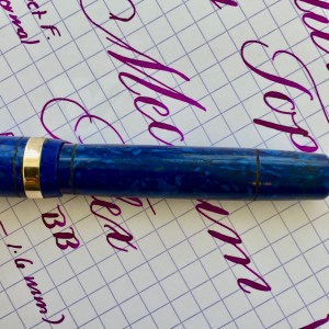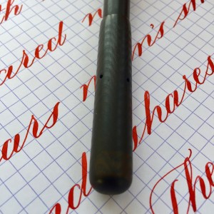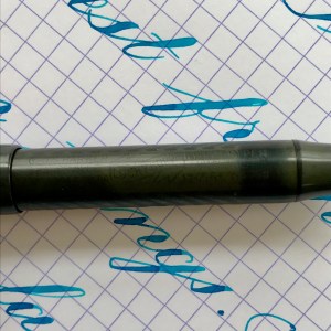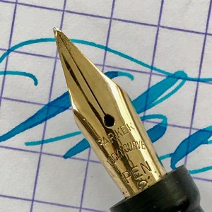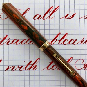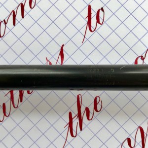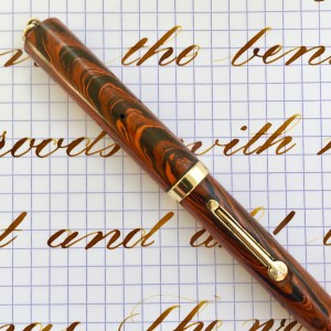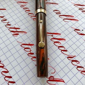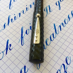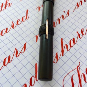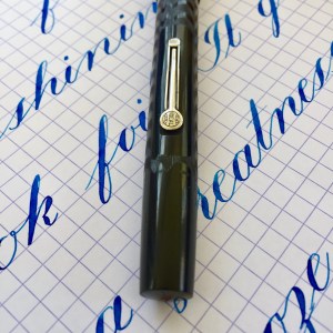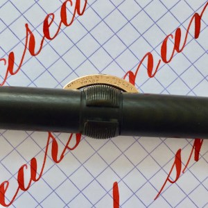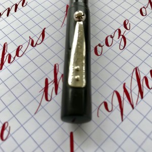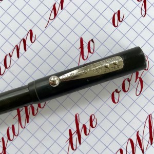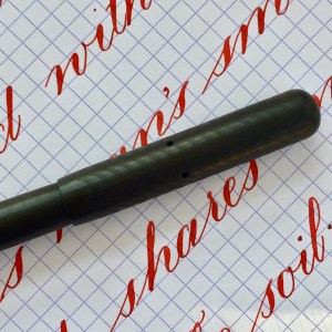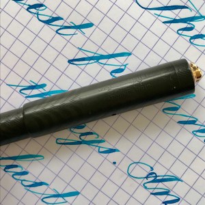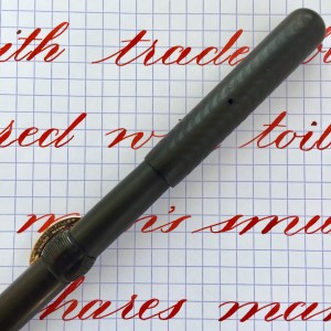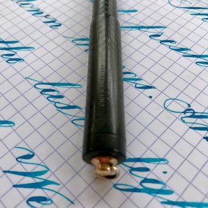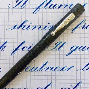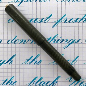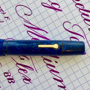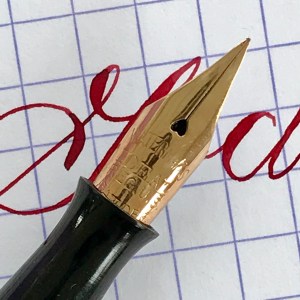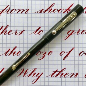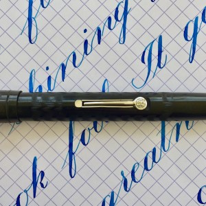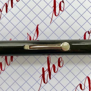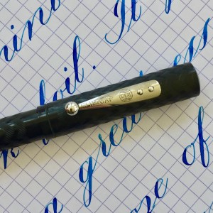 Here is a torpedo shaped Mabie Todd Swan in black with good trim. The body overall is in pretty good condition with only minor and light surface scratches due to normal use. There is one place on the cap where it looks like someone got carried away with a buffer and created a small indentation (see pics). Side imprints are half worn and only about half readable. The gold-filled trim is in good condition with no brassing. The lever is a little loose but still works very well. The section of these Swans have brass threads, and the cap on this one threads in about a quarter turn. The section also has internal threads which makes removing the section much easier. The 14kt. #2 “Swan” nib is a fabulous “wet noodle.” It writes normally as a wet XF. It does have a bit of feedback mostly due to the fact that it is very difficult to use without causing the tines to spread a little. But I would not call it scratchy. The flex goes from XF to BBB (1.7mm) with wet noodle ease and is nicely responsive. Overall, a nice wet noodle from Mabie Todd.