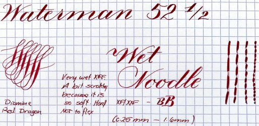 Here is a fabulous wet noodle nib offered in a Waterman 52 1/2. The pen is good over all condition. The BCHR is still rather black. A little brown but very, very dark. The chasing has been worn almost completely smooth however, and the imprints on the side of the barrel are mostly unreadable. The nickels trim is in great condition without any brassing. The 14kt. Waterman #2 is a near paintbrush soft wet noodle. It writes normally as a borderline XXF (0.25mm). It’s quite wet for such a fine nib, but the softness of the tines make this nib difficult to use for normal writing as they start spreading on contact with the paper. The flow keeps up well. Responsiveness is quite good for such a soft nib. Probably, not for beginners. Over flexing this isn’t that hard due to it’s softness. An incredible Watermen noodle.