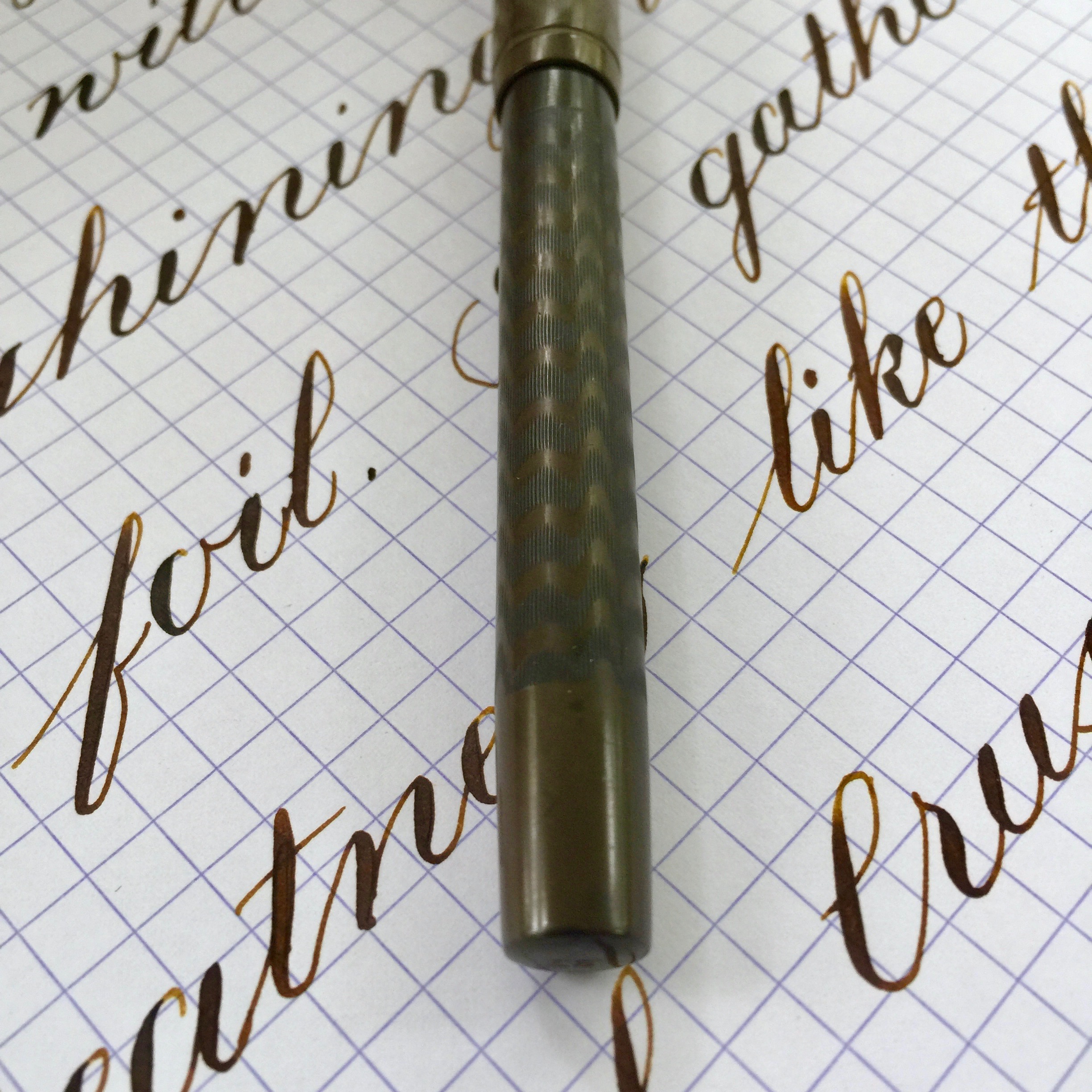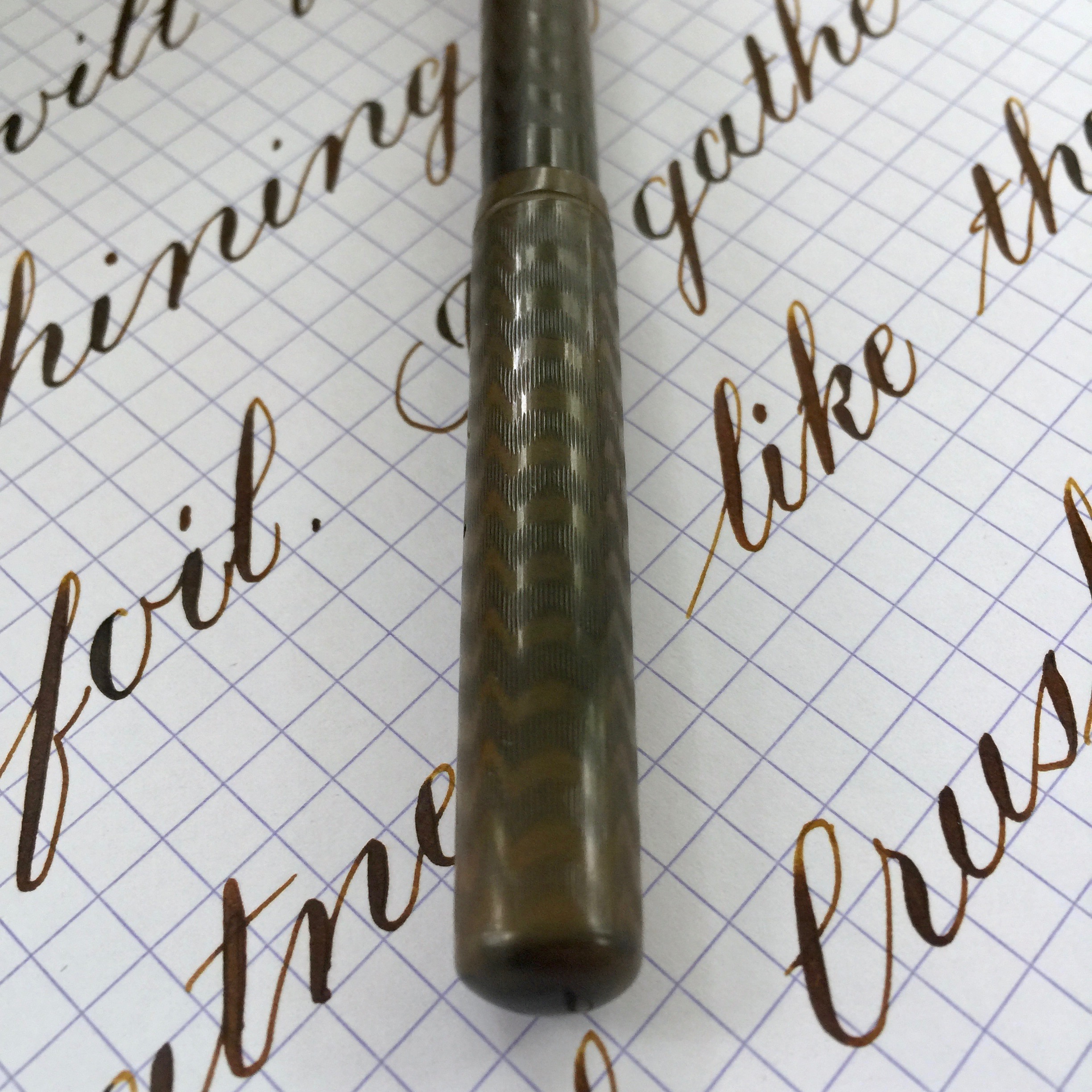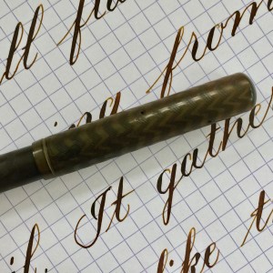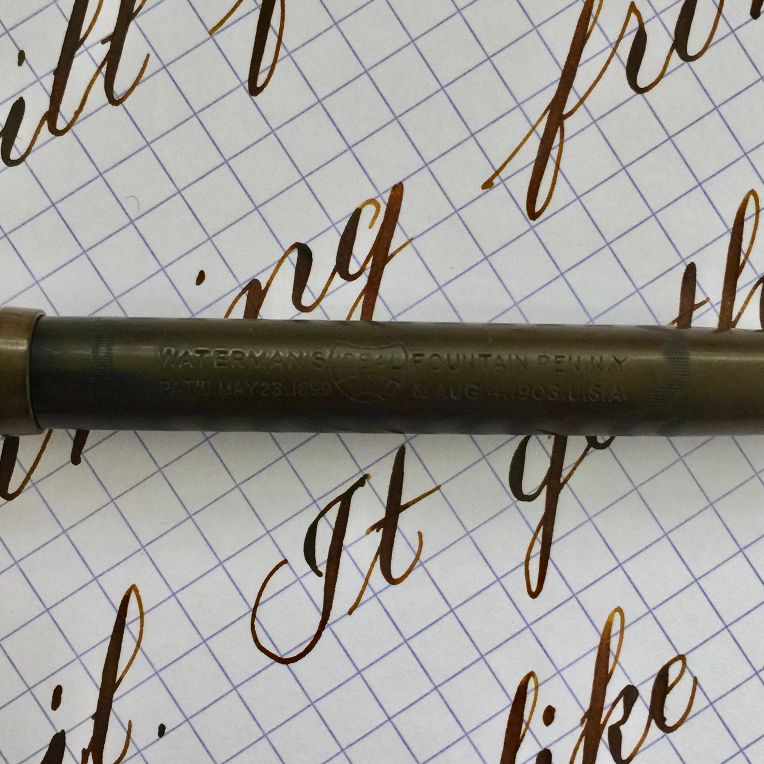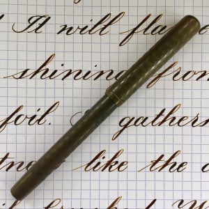 Here is the more uncommon Waterman 13 eyedropper. It’s basically the same size as a twelve, but with a larger nib (a bit larger in width, and significantly larger in length). The BCHR has faded to a medium-dark brown. The chasing is still very visible though it has lost some of it’s texture. The original imprints are very crisp. The 14kt. Waterman #3 is really lovely. It writes normally as a super smooth and wet XF. It has a great soft, springy feel to it. The flex range is decent going up to BB (1.5mm), and ease of flex is pretty good. Flow is great, and responsiveness is about average: not out of this world, just decent. Overall, a very nice and relatively uncommon Waterman eyedropper.