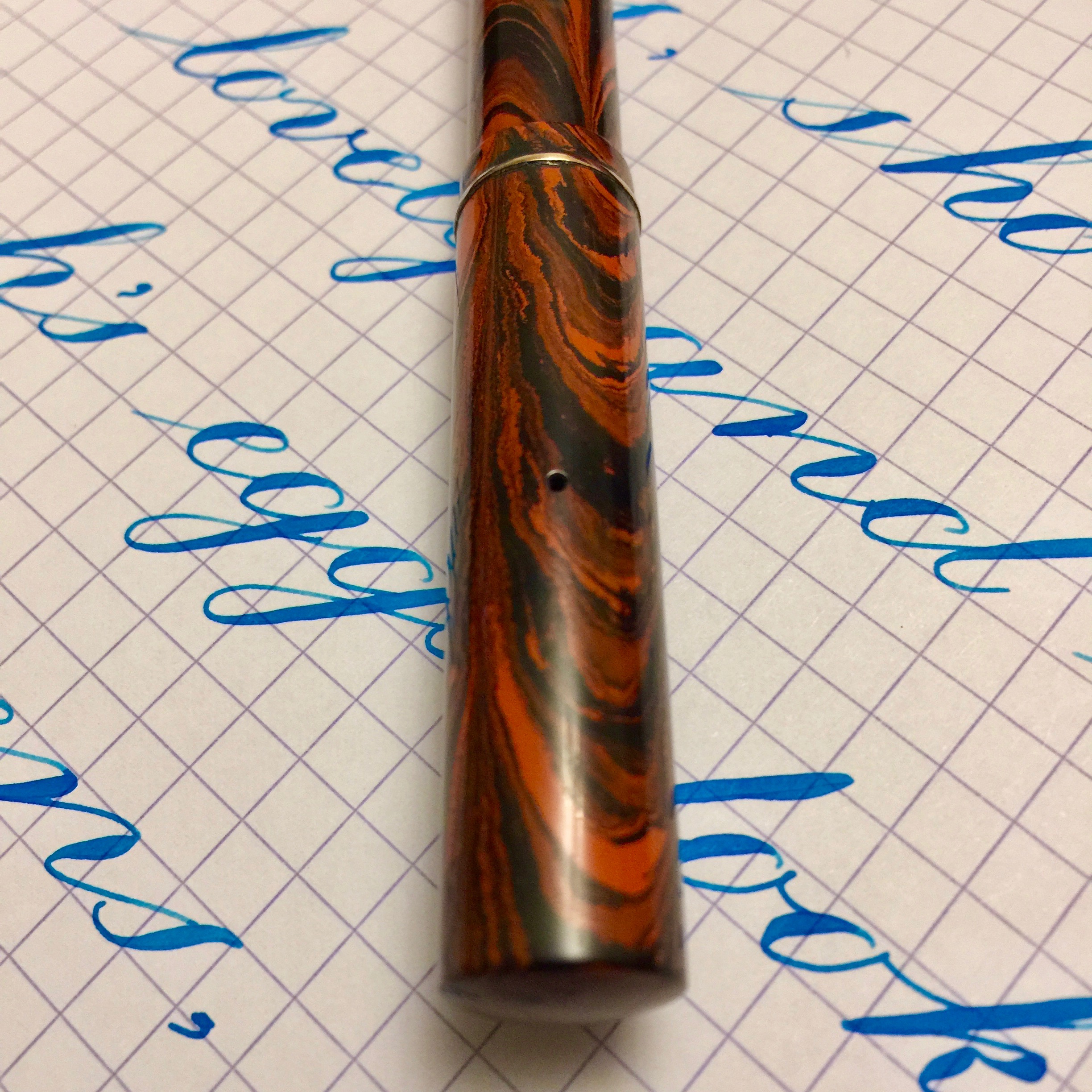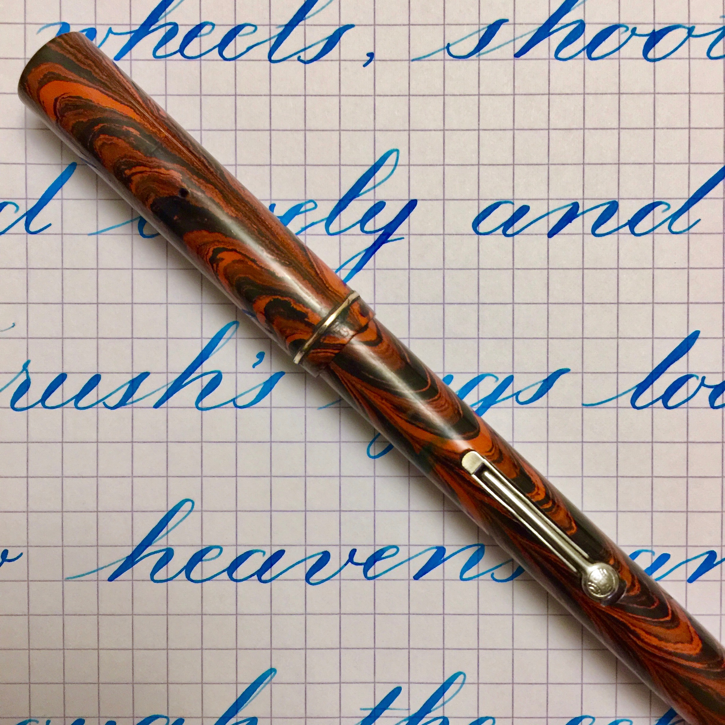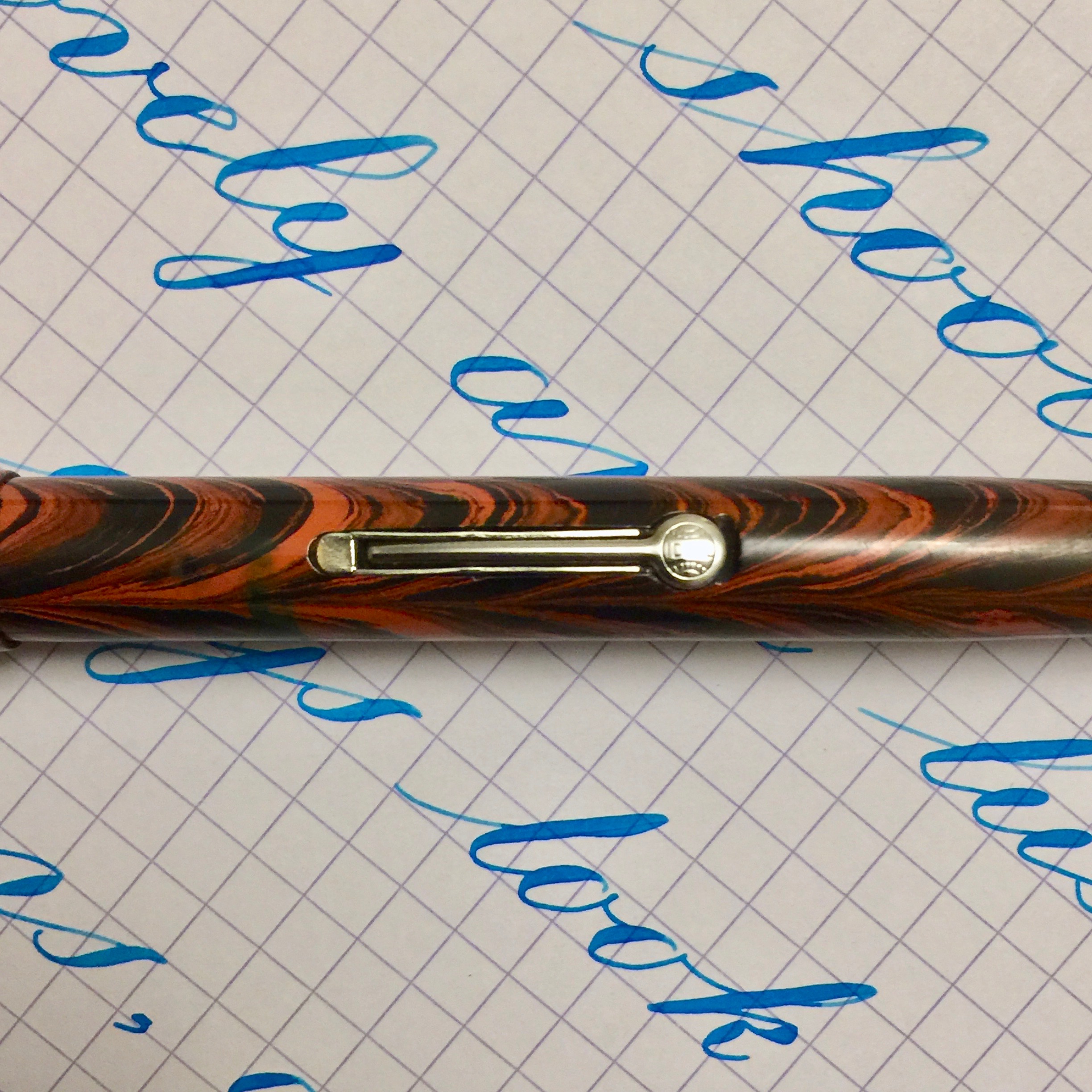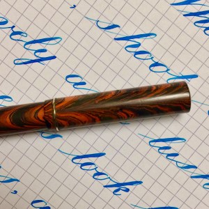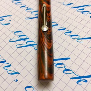 Here is a Waterman 52 red ripple likely from the European market. The hard rubber has pretty good color with minimal fading. A little more fading on the cap, but it’s still pretty vivid. This likely was sold with a Waterman accommodation clip, but it was originally a clipless model. The lever, as was customary in Europe, is nickel-filled rather than gold-filled, and it is in good condition. It has a thin gold-filled band on the cap to keep the pen from developing lip cracks. The imprints are very good and crisp. The 14kt. Waterman #2 is a beautiful writing XF nib. It’s ultra smooth with good flow. The flex comes quite easy going up to 1.6mm. It has decent responsiveness as well. I love writing with this nib, and the flex is just icing on the cake.