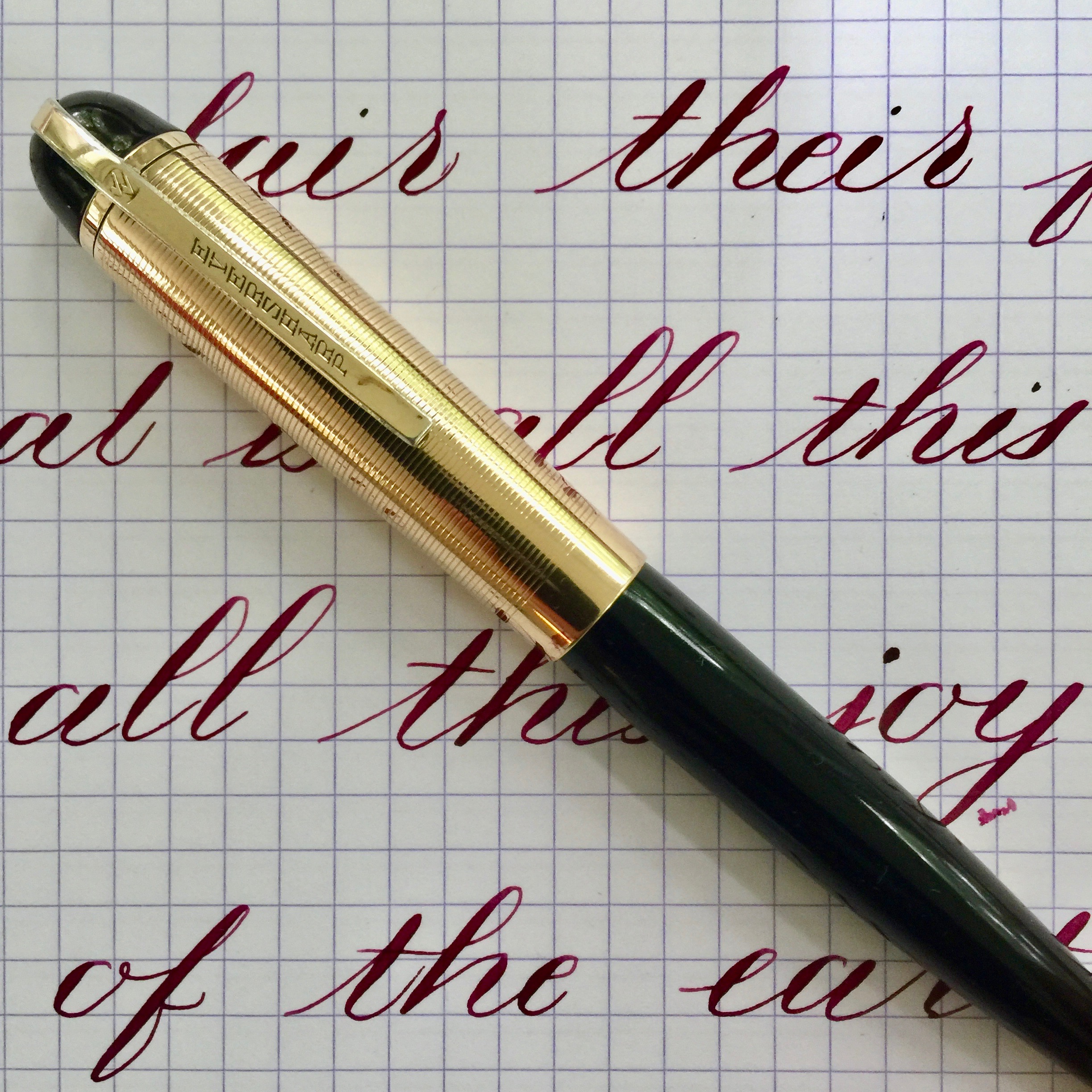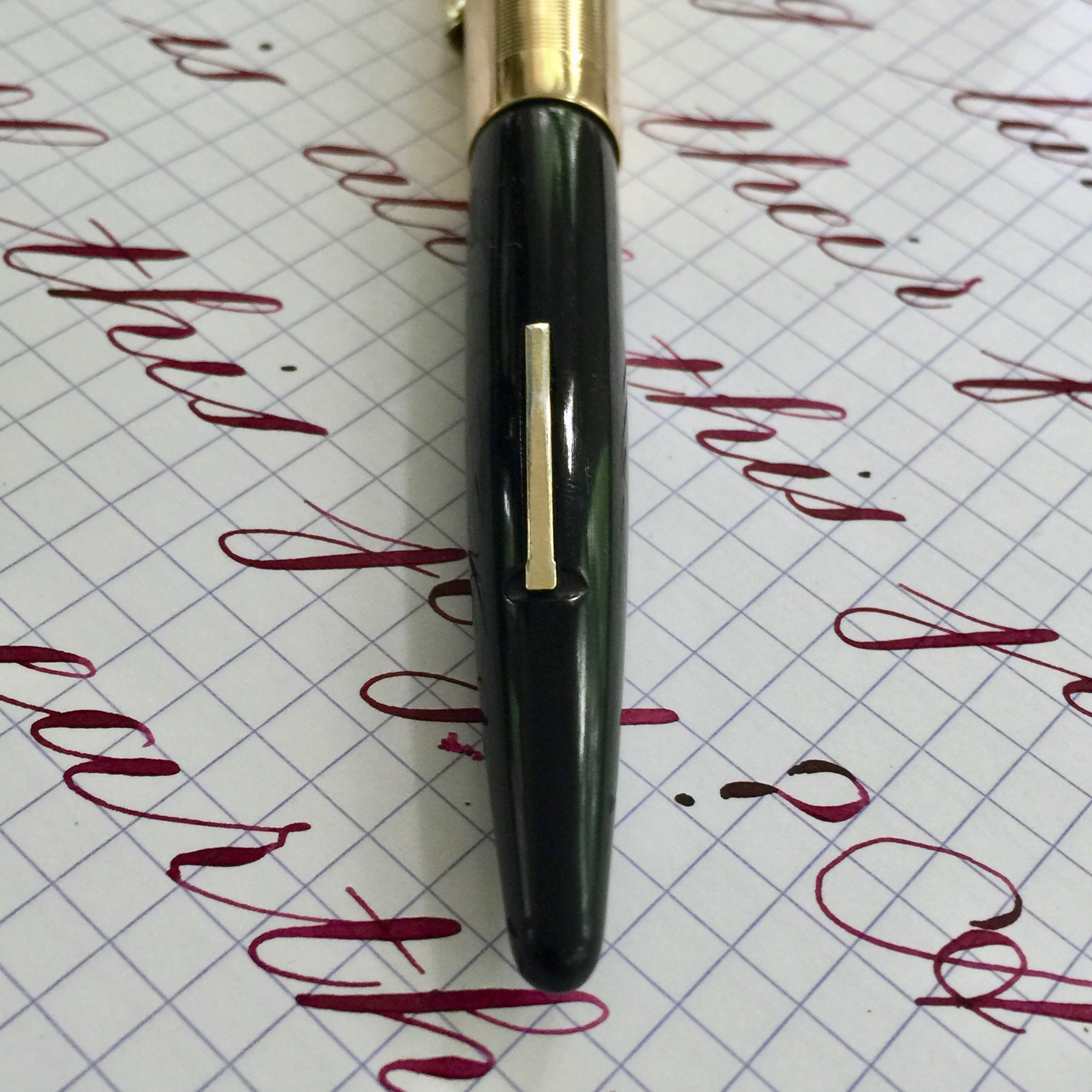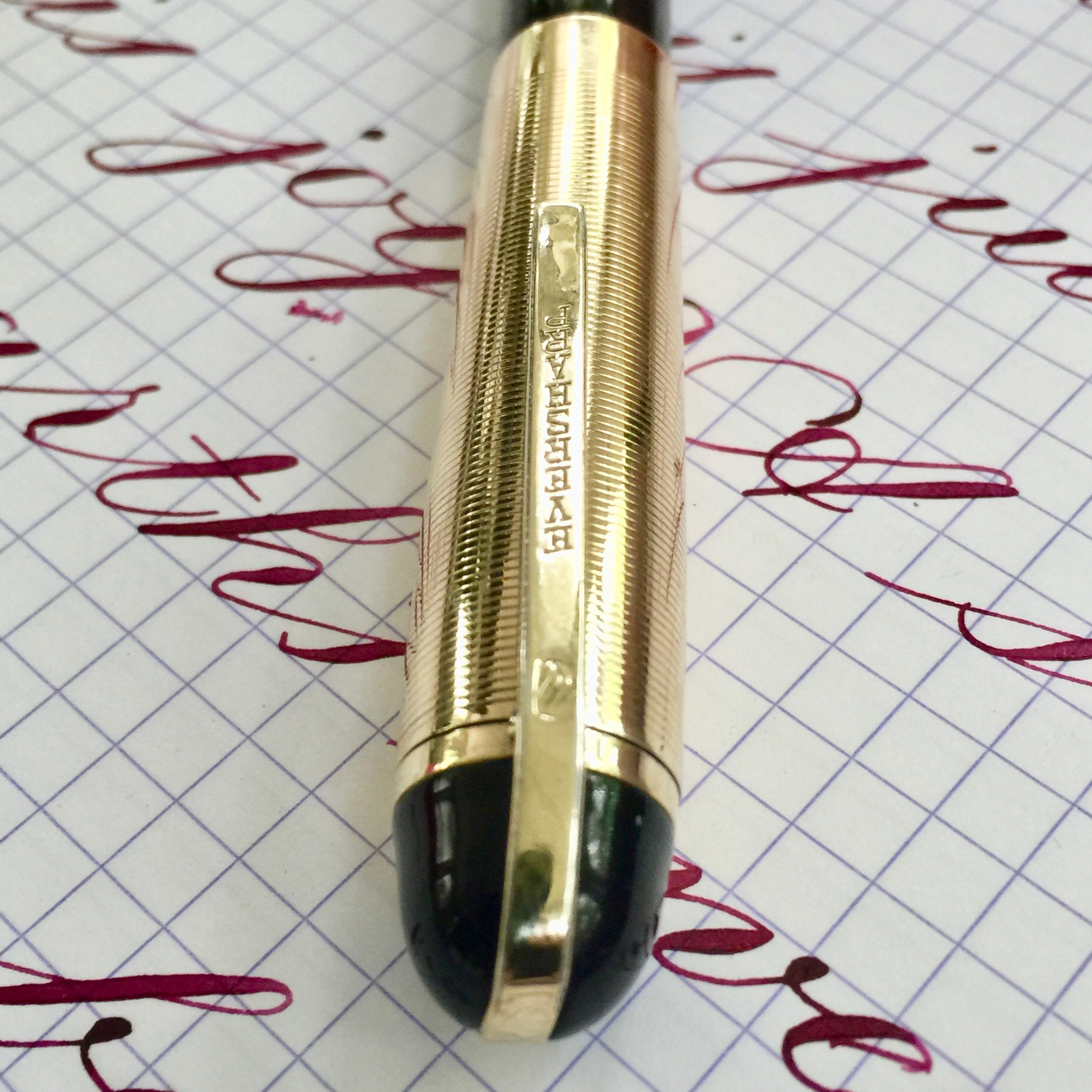 Love a good Skyline. Here is one in black with the classic ribbed, gold-filled cap. The body looks great with only slight, surface scratching from normal use. Most everything buffed out beautifully. The cap is a beauty. Really hard to find one of these without dings, and I can’t find one on this cap. No brassing on the cap or clip. A little plate wear on the top of the lever from posting the cap over the years. The clip does have a little ding down on the end. The 14kt. Eversharp nib is what you would expect. Wet, beautifully smooth, but it’s also surprisingly fine coming in a 0.3mm (XF). The flex on this has very good range going up to 1.5mm and great flow. It is just a bit too stiff to be a “super flex.” Still, a great Skyline.