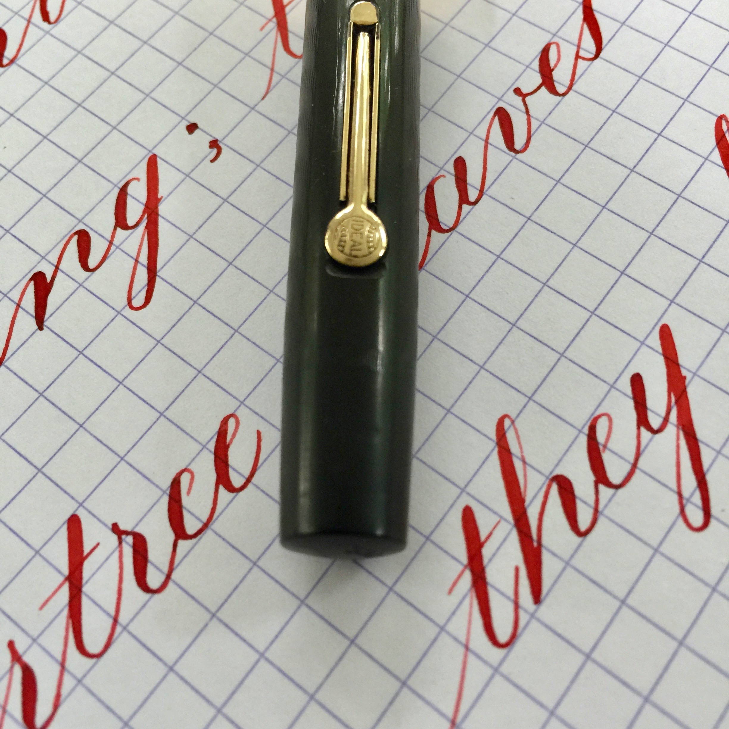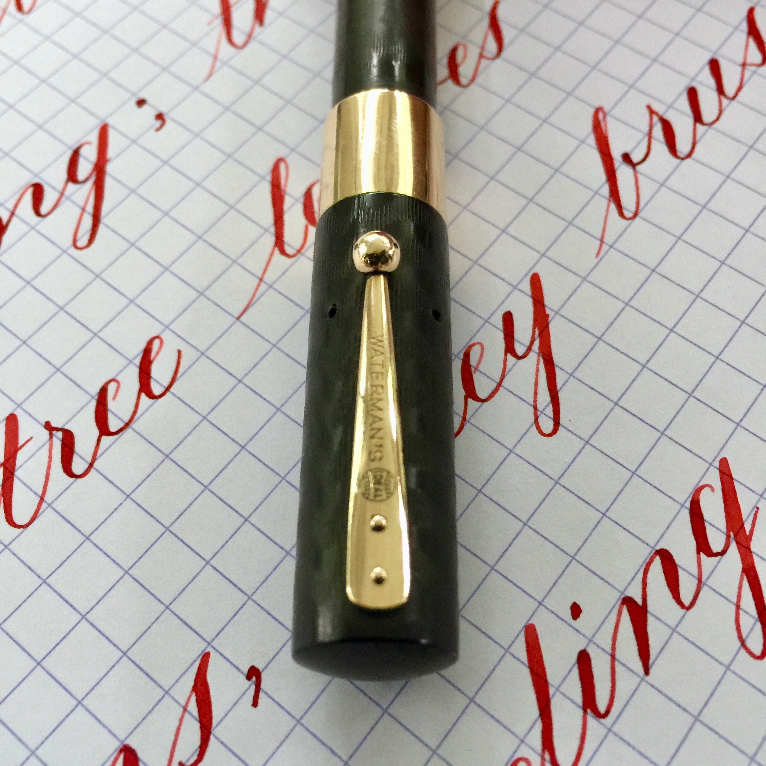 Here is a gorgeous Waterman 52V in BCHR with gold-filled accents. The BCHR is a dark brownish black colors, so it has faded a bit. The chasing is visible with a little texture still but does have some wear. The imprints are readable but are worn. The “52V” is still very crisp. Other than some minor, surface scratching from normal use, the trim looks great. No brassing. The large band on the cap really sets these pens off as special and distinguished. The 14kt. Waterman #2 is a wet and smooth writing XF (0.3mm). It’s quite soft and slightly stubbish. They just don’t make nibs like these anymore. It also has nice flex ranging up to BB (1.5mm) that comes quite easily. Responsiveness is decent. Flow is great. Overall, a beautiful classic that when posted has the girth and feel of a 52 with the portability of a vest pen.