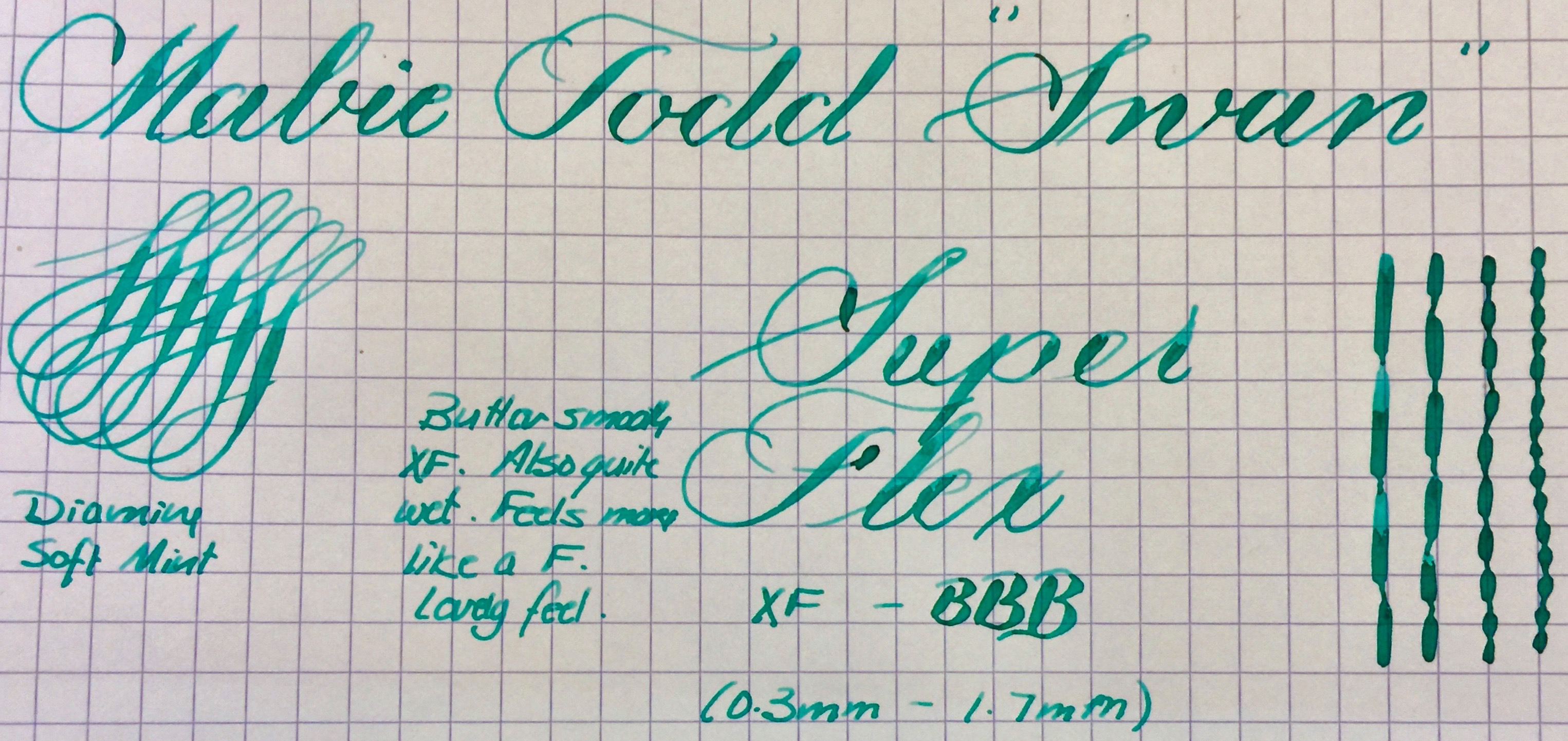 NIB: 14kt. Swan, XF to BBB (0.3mm-1.7mm), SUPER FLEX (See “Grading Flex Nibs” for How I Grade)