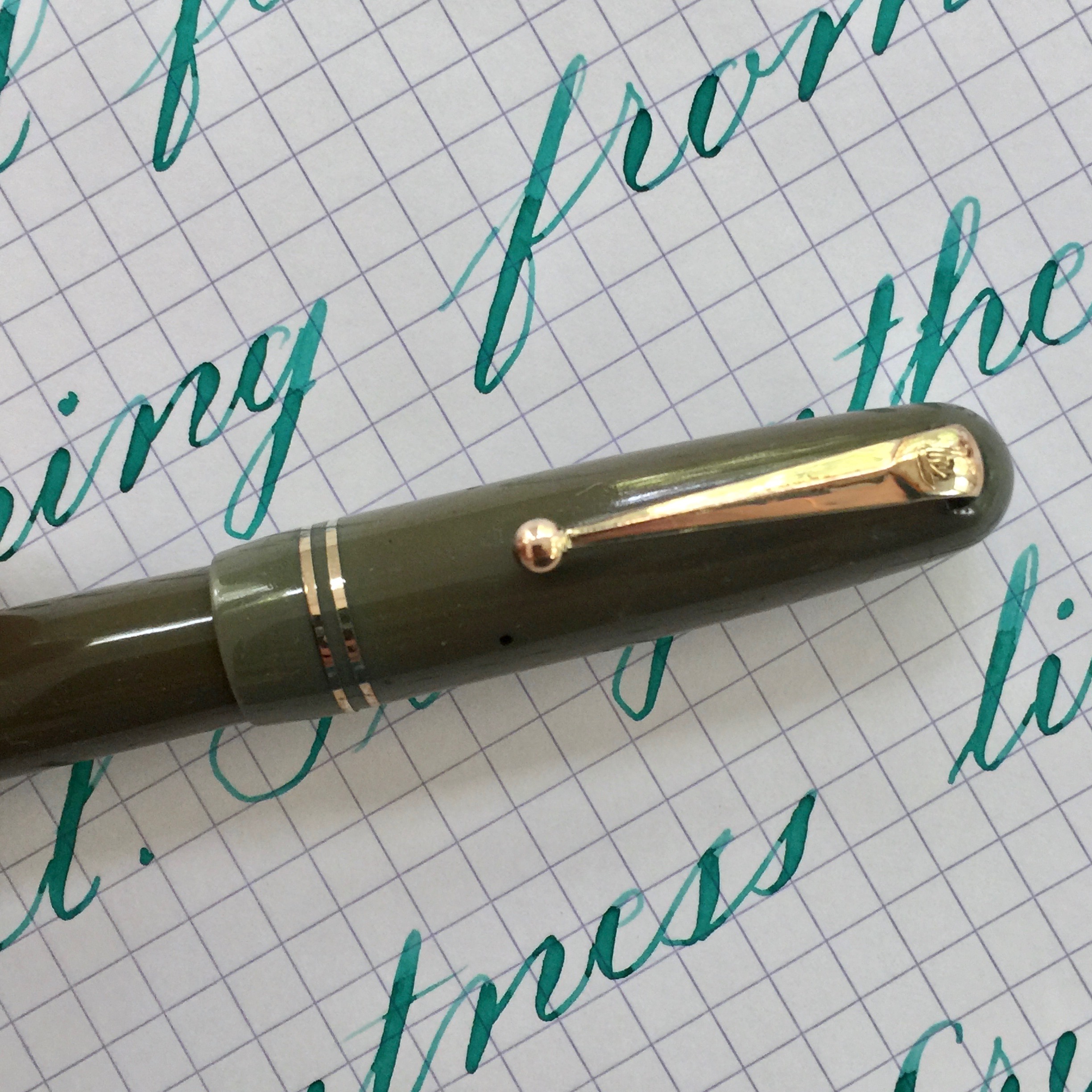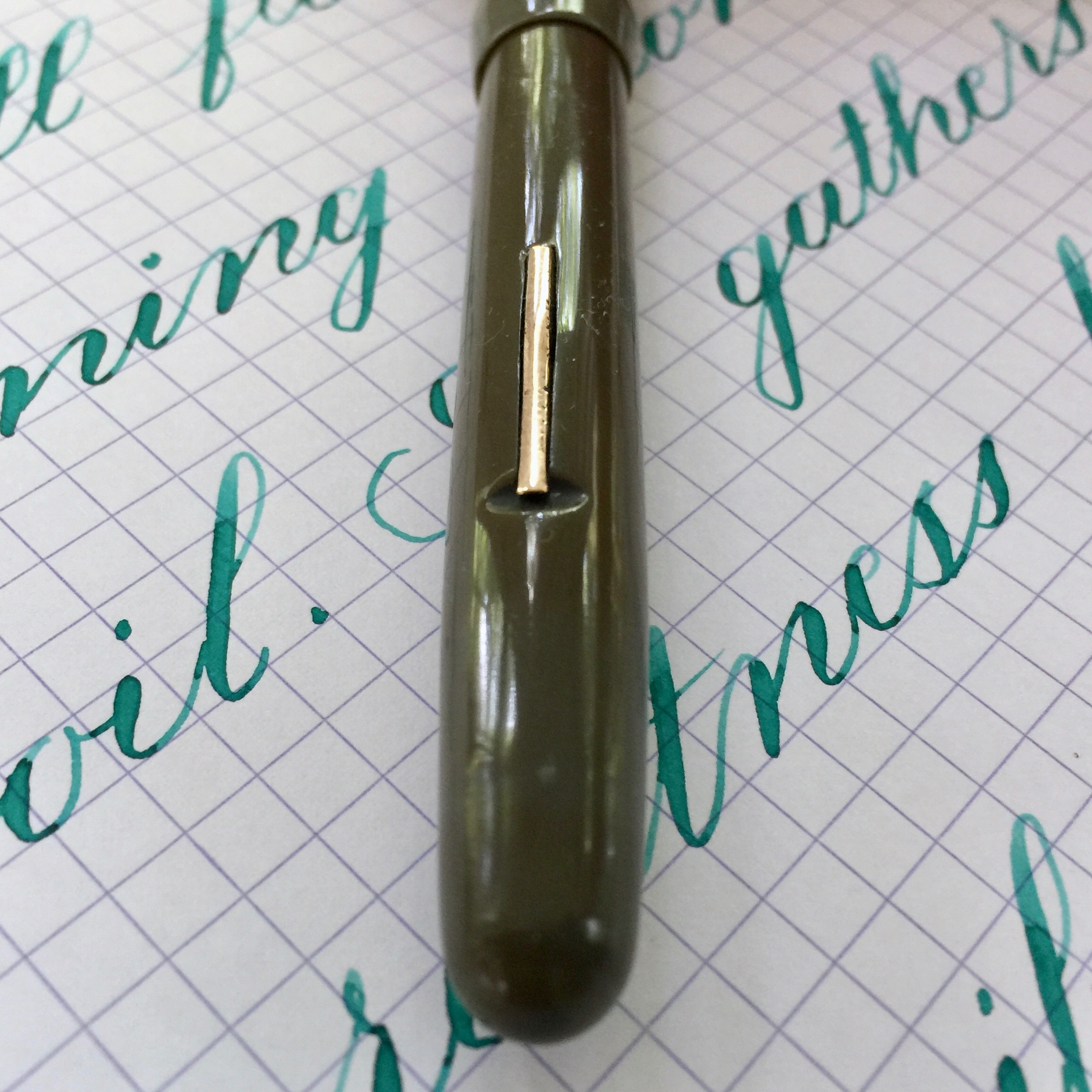 This made in England Swan lever-filler comes in a dark gray celluloid with gold-filled trim. The body has darkened some especially on the body. There is a small indentation on the barrel from what was likely an over zealous buffing. The gold-filled trim has some light brassing along the sides of the lever, at the crown of the clip, and on the edges of the bands. Imprints are mostly good and crisp. There is a little wear at the very bottom of the side barrel imprint. The 14kt. Swan nib is a beauty. It’s a buttery, wet XF (0.3mm). It’s probably going to feel more like a F on less absorbent papers. The flex is very good. It comes quite easily and has a nice range going from XF – BBB (1.7mm). This is a pen that feels great in the hand with a fantastic vintage nib that is superb writer and adds the great bonus of good flex.