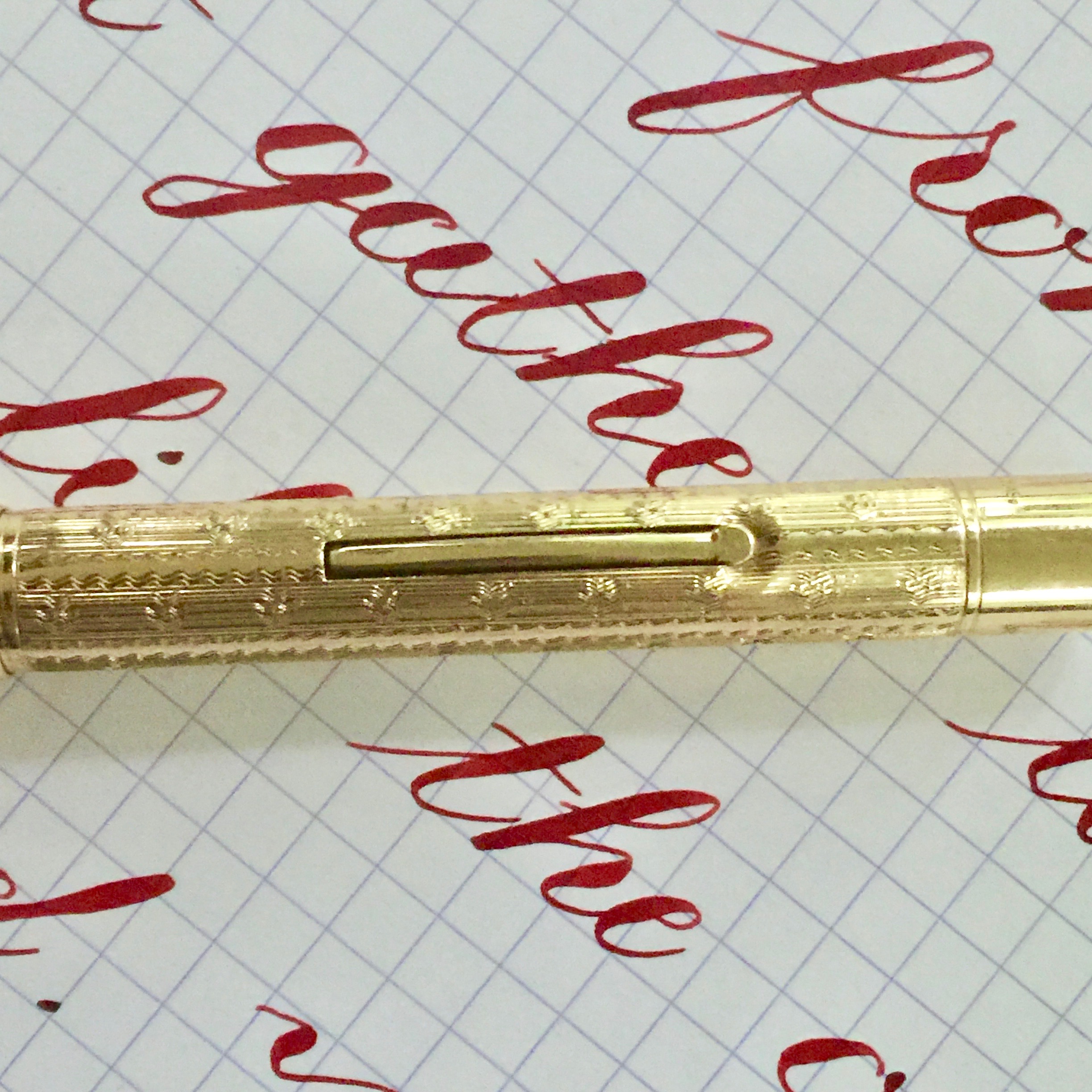Here is a gorgeous made in New York gold-filled Mabie Todd Swan. Patent date is 1915. This pen is in excellent condition. The engraved pattern on the body is beautiful, and the flaws are minimal. There are two scratches on either side of the barrel near the lever box. Something must have pinched it once. There is small dent towards the section that is really hard to see, and a scratch on the section. Also there is some very slight brassing on the barrel end. You’ll only see any of this by looking carefully. The pens has the initials “C.V.F.” on the barrel. There is a tiny bit of light scratching on the clip. The #2 Mabie Todd Swan nib is a pretty wet writing F (0.4mm) that is a bit stubby. The flex on this pen is beautiful ranging up to BBB+ (1.8mm) and also has very nice responsiveness. Wow. This is a gorgeous hundred year old pen, and it comes equipped with a superb Swan flex nib.