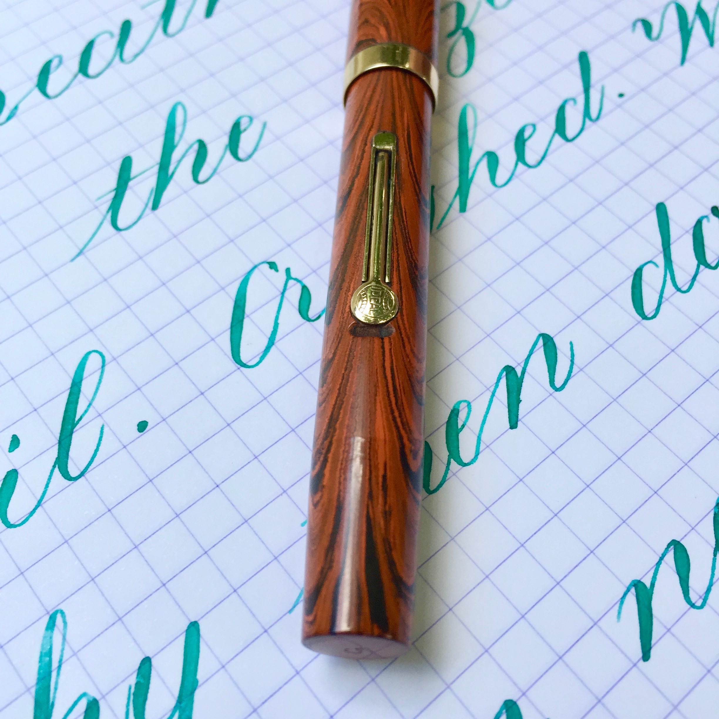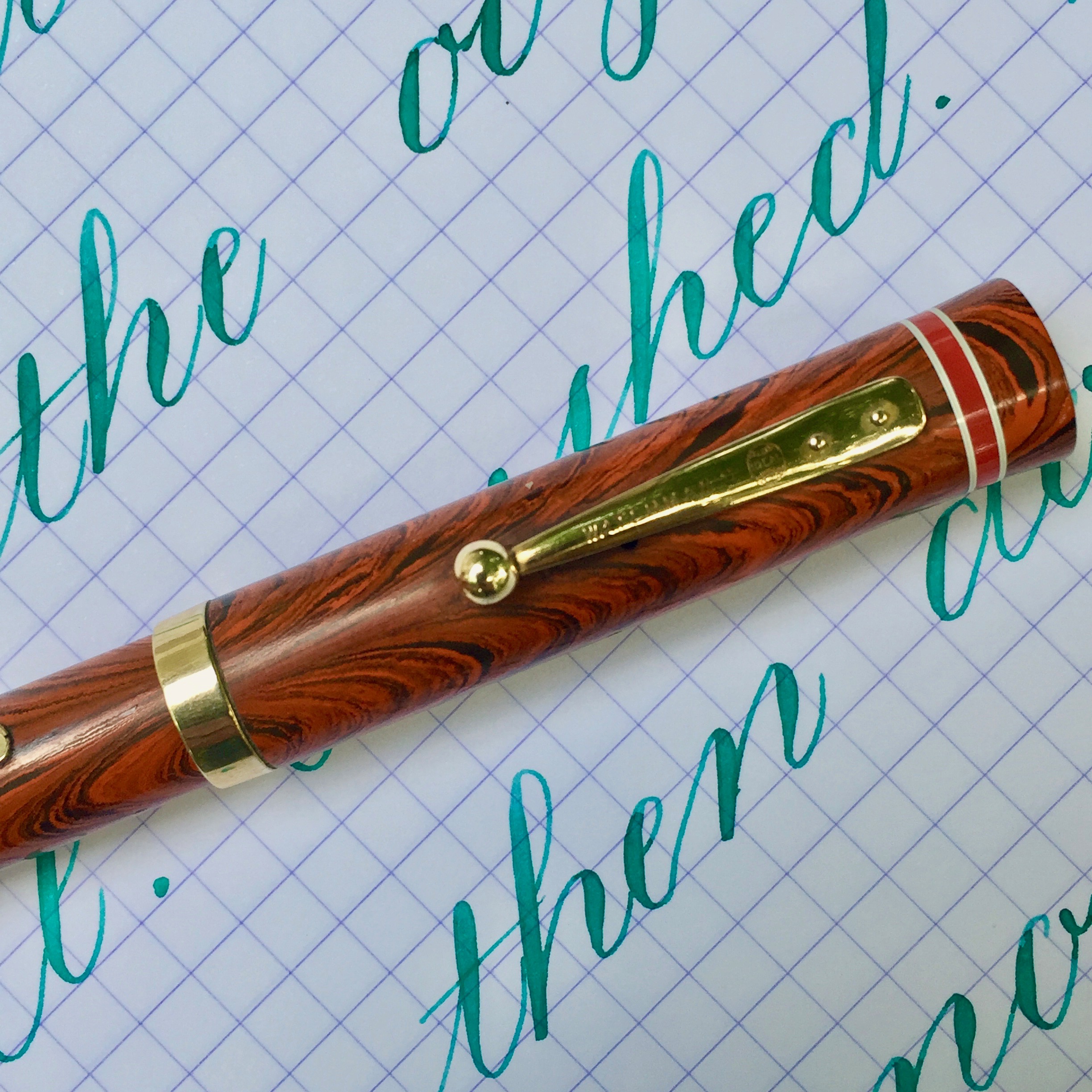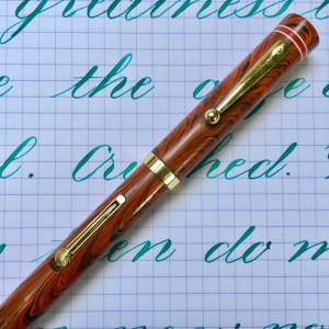 Here is a beautiful Waterman 5 Red Ripples with “RED” nib and “RED”. The 5’s of this period are about the same size as a 52. Slightly shorter with a slight wider barrel. The red ripple body is a little faded, though still pretty good color. The end of the barrel where the cap has been posted actually still has the original color. The gold-filled trim is still in excellent condition with no brasssing. The “RED” ring on the cap looks to be a replacement as the original would be darkened and faded. The #5 Waterman “RED” nib is a lovely writing F. It’s wet but not overly so and a bit stubbish. It’s smooth with just a hint of feedback. The flex is nice though most would expect a bit more out of “RED” nib. Despite popular belief the colored coded nibs are hardly uniform. The flex range goes from F – BBB (0.4mm — 1.6mm). Flow is good, ease of flex is a bit on the stiffer side of “super flex.” Still plenty good enough to do some nice work. Overall, it’s still one of the great iconic Waterman pens.