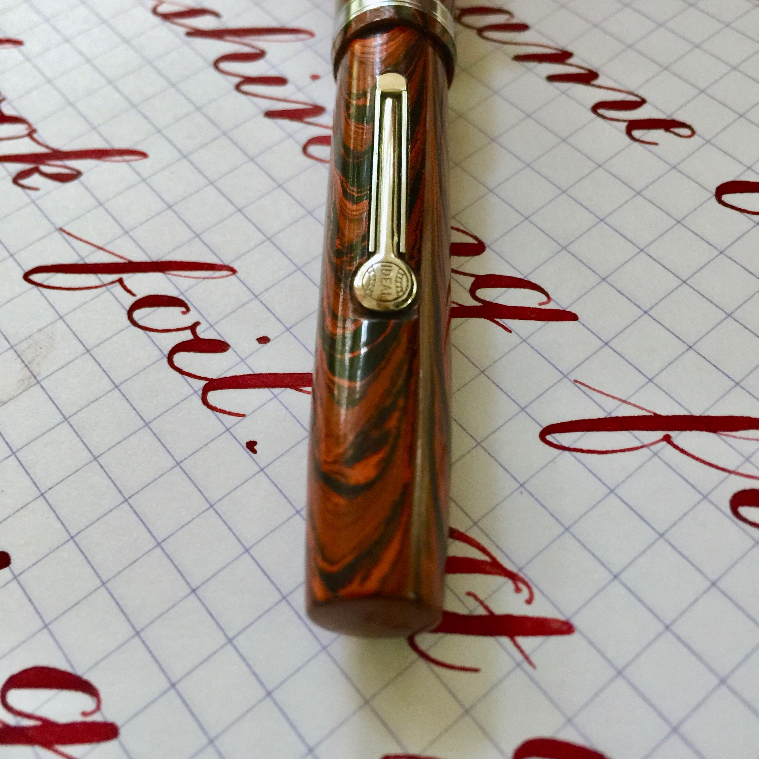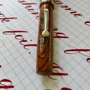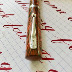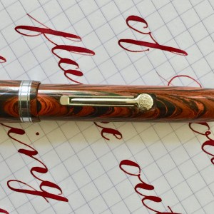 Here is a lovely Waterman 52V in Waterman’s iconic red ripple hard rubber. With the nickel trim, this is likely from the European market. The fading of this pen is minimal, and the imprints are still very crisp. There is also minimal wear on the trim and no brassing. In short, this pen is close to mint condition. The 14kt. Waterman #2 is a beautiful nib. It’s a wet, glassy smooth writing XF (0.3mm). When flexed this ranges up to BBB (1.7mm) with ease. The flow has no trouble keeping up. Though the wetness of the flow does make it a bit less responsive than it would be, the responsiveness is still decent. Overall, this is a fantastic all around Waterman in fantastic condition.