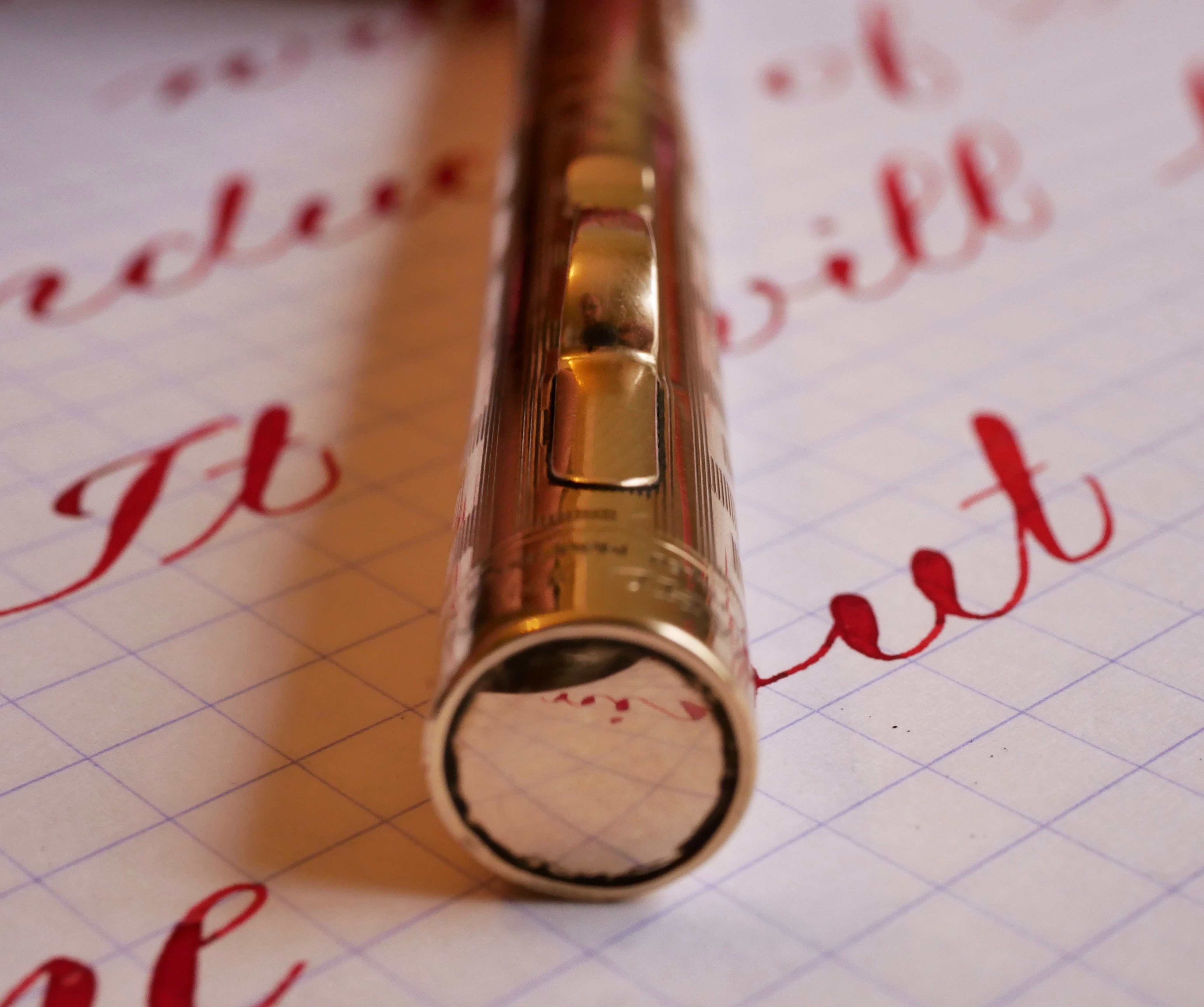 Here is a lovely Wahl Gold-Filled pen (not a ring top as stated in the sample). These Wahls come in various sizes. This is a middling size with a #3 nib and comes with a clip as opposed to a ring top. The body is in excellent condition with no dings that I could find nor any personalizations. There is only a touch of brassing on the end of the barrel due to posting the cap. Any other wear is very minor. It still looks beautiful. The #3 Wahl nib is a smooth XF (0.3mm) that has good flow but isn’t overly wet. The range of flex on this nib is impressive going from XF (0.3mm) to BBB+ (1.8mm). Ease of flex is a bit on the stiffer side as is typical for Wahl and Eversharp nibs, due to their generally thicker build than some of their contemporaries. It’s a durable high quality vintage Wahl with a great nib.